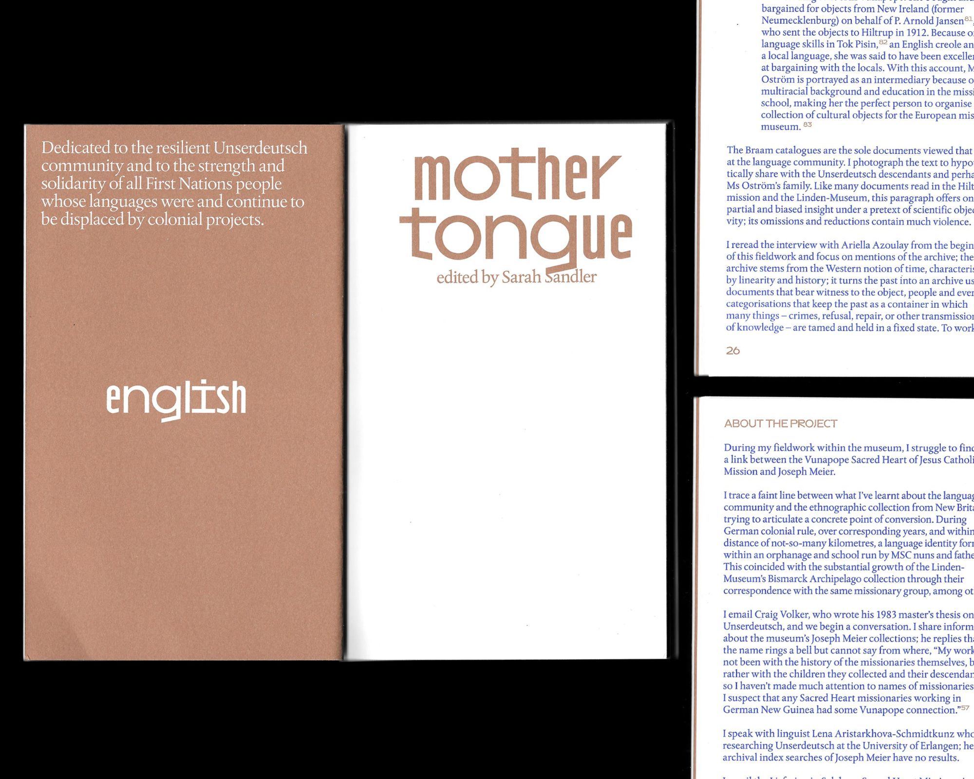 Mother Tongue is an artist book from a year-and-a-half-long investigation within the Oceania Collection of the Linden-Museum Stuttgart. It probes the possibility of artistic fieldwork as a critical and creative methodology—one that not only engages with an ethnographic collection, but also interrogates its status, legacy, and future.