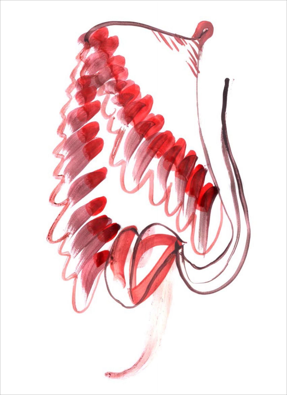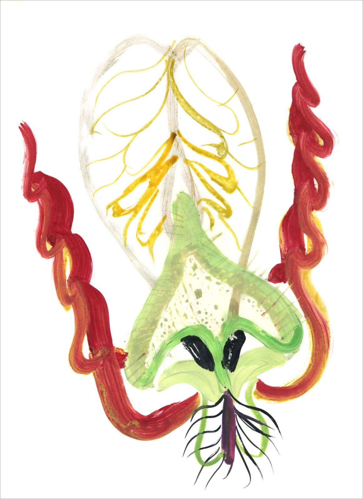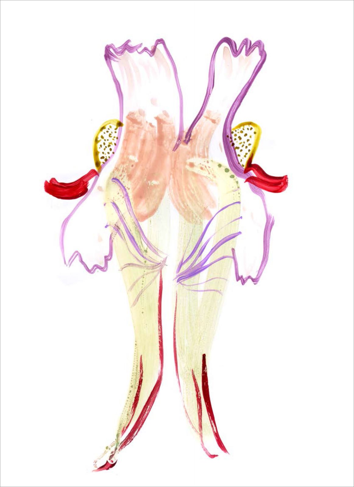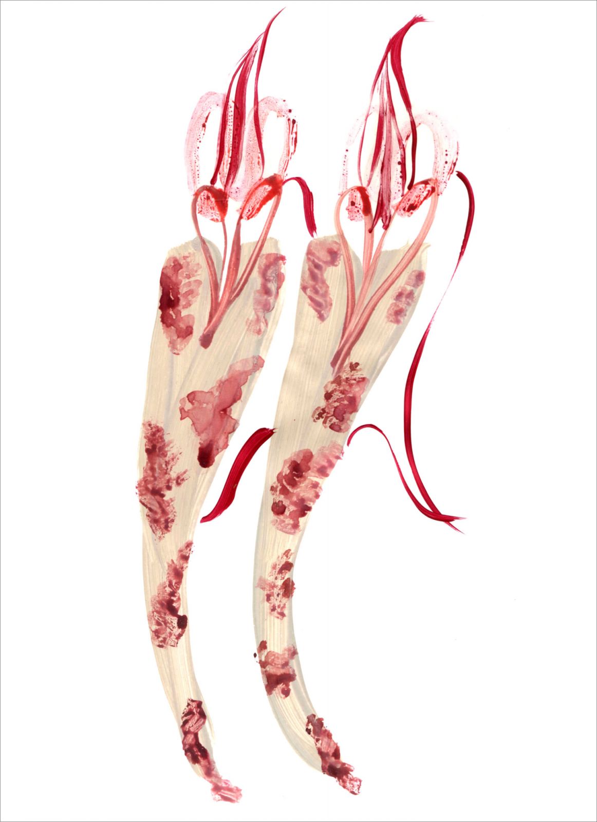 A series of works on paper exploring the fragile relationship between insular ecosystems and embodied subjects under patriarchal-colonial control. Inspired by a trip to Guadeloupe, Interference reimagines flowers through an anthropomorphic lens—stamens and pistils becoming metaphors for reproductive bodies in states of vulnerability. These botanical-human hybrids evoke the island’s unique ecology, shaped by geographic isolation yet irrevocably altered by colonial plant migrations.