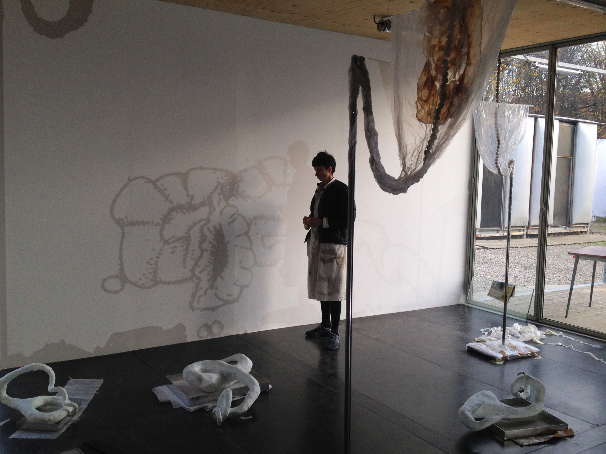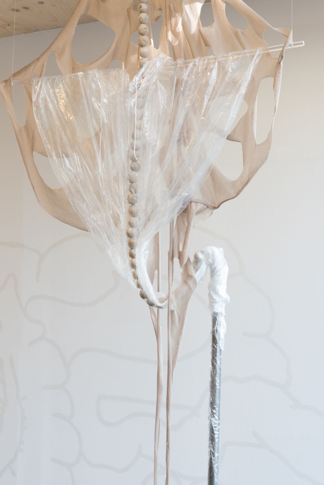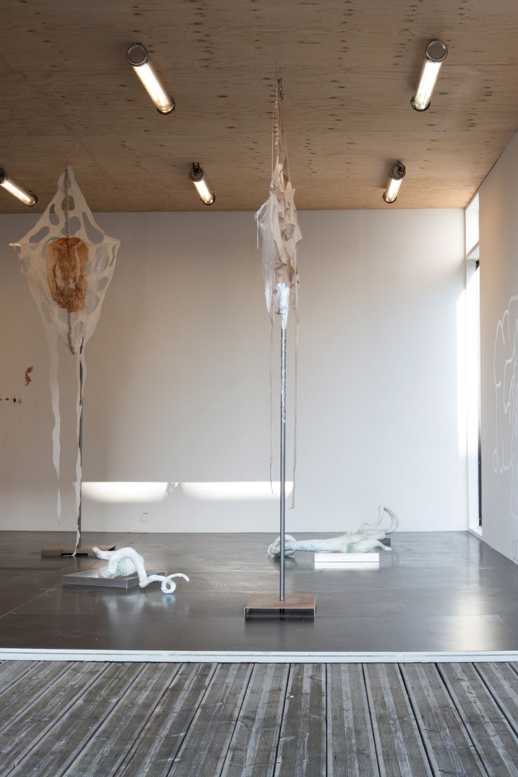 The artworks quietly reflect on these mutations through a combination of hybrid materials and form. Tall steel sculptures, which stand like marine sentinels, are composed of strings of organic eggs and enveloped in found plastic and synthetic fabric. On the ground, plaster and clay tentacular floor sculptures emerge from sand-filled aluminium plinths. The wall paintings reference the reproductive organs of sea turtles, specifically the oviduct, a tube-like structure that connects the ovaries to the exterior world.