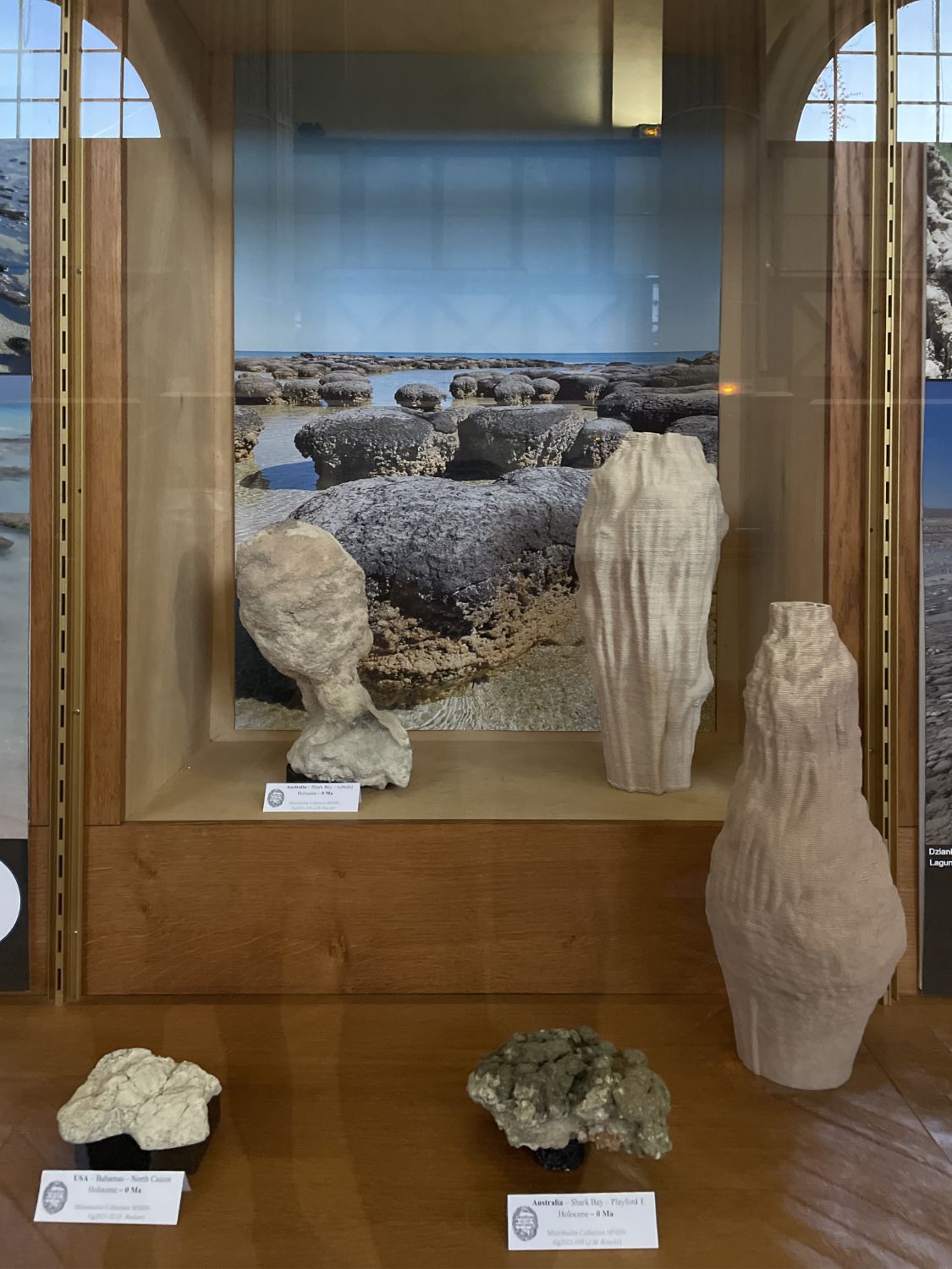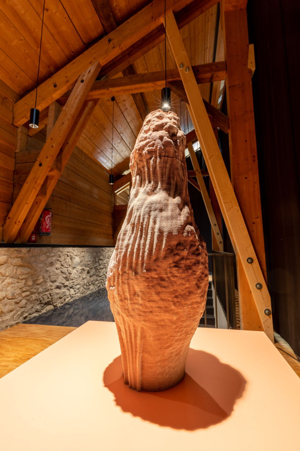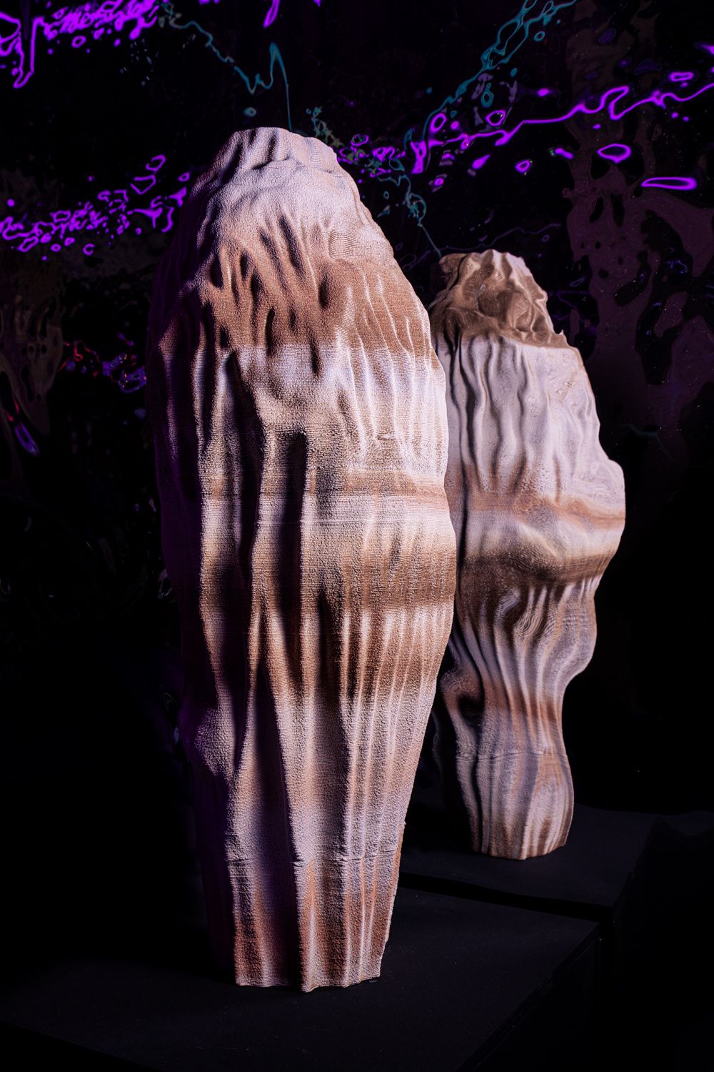 « Several sculptural works reference the imagery and forms of stromatolites in their strata or successive deposits of matter, such as the three ceramics in the series Sisters. They were created in collaboration with a fab lab’s 3D ceramic printer, which slowly builds forms millimetre by millimetre, grain by grain, mimicking the cone of sand in the lower part of an hourglass. » [...] — Xavier Jullien |↗ read the full text