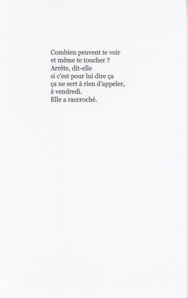 Elle est partie accomplir son service militaire à quelques centaines de kilomètres. Son absence l'étouffe ; ses sensations sont exacerbées par la douleur autant que par ce qui l'entoure et qui soudain n'a plus de sens.