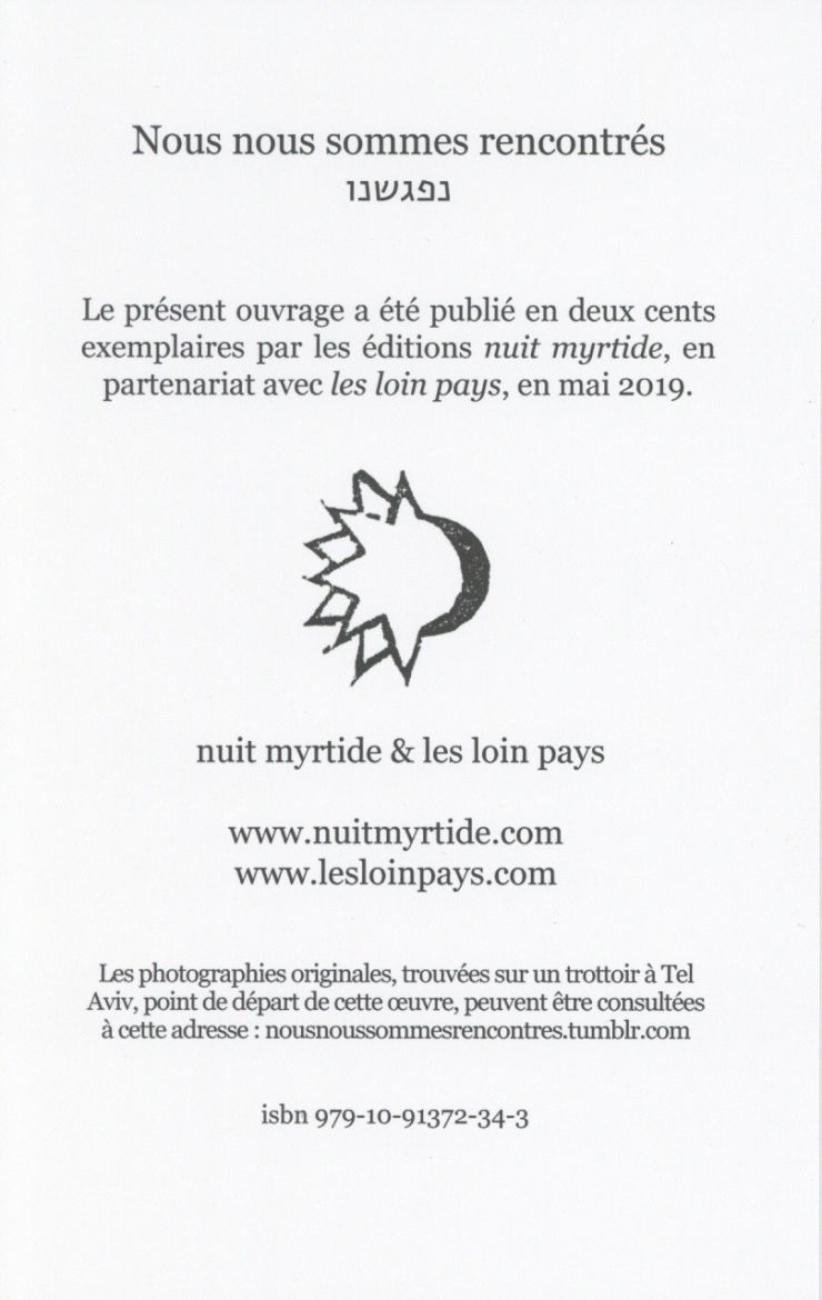 Il restait à trouver un titre. Une petite étiquette avec un texte en hébreu, collée sur l'une des photos leur servira de titre. Anne le traduira pour Sylvie : נפגשנו, nous nous sommes rencontrés.