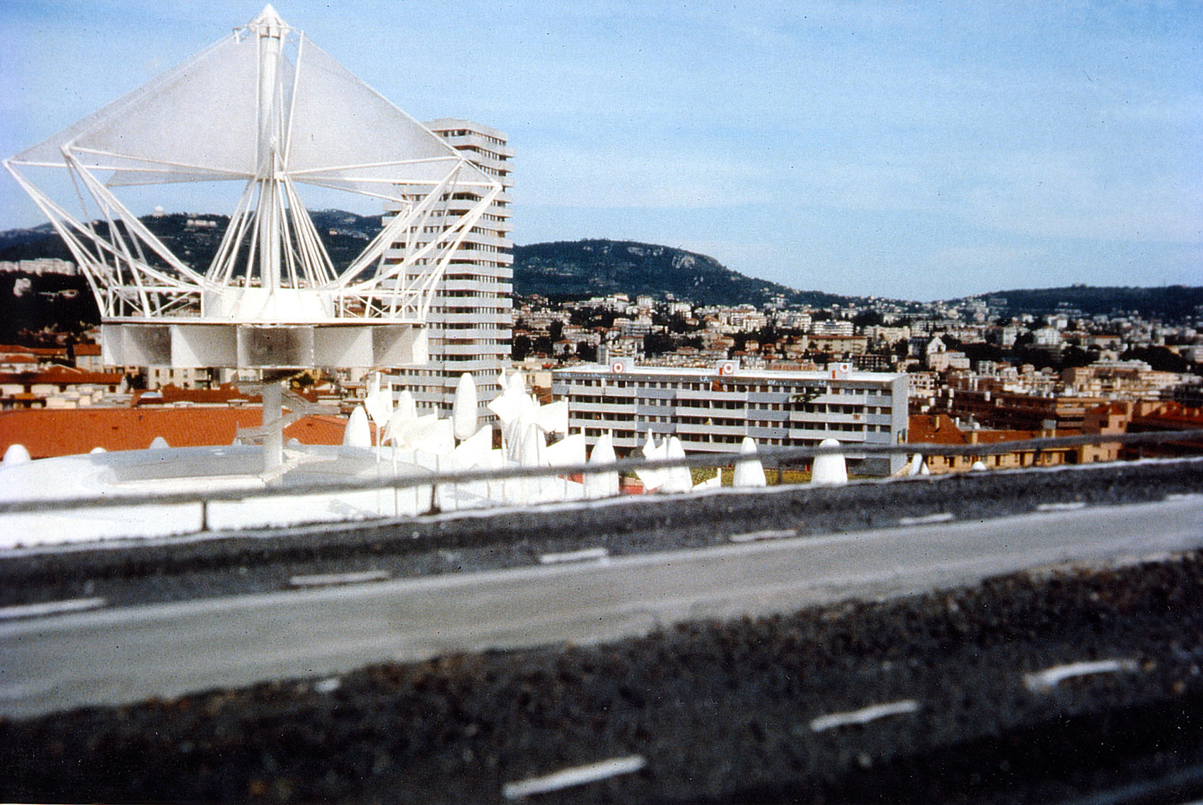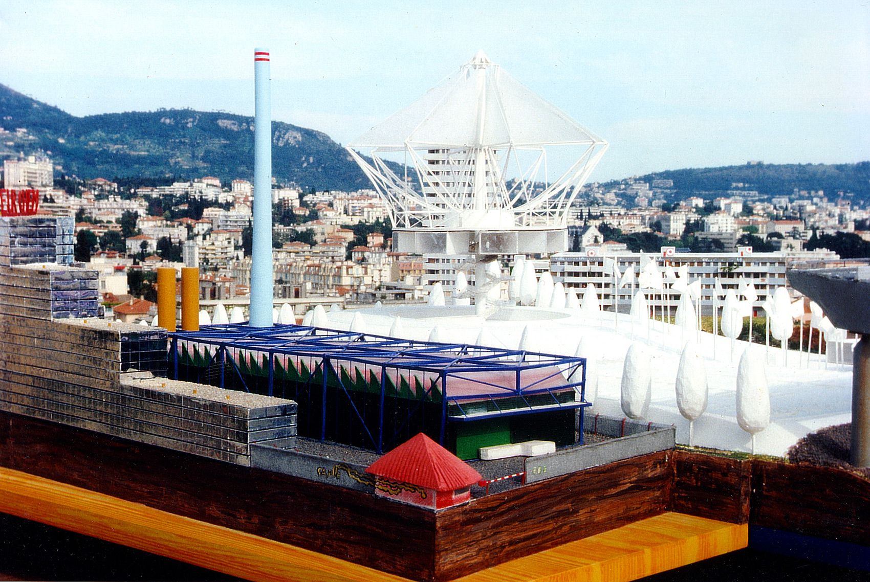 Maquette sur table, bois, mousse polyuréthane, enduit, peinture, carton, acier, plastique, papier, ventilateur monté sur un bras articulé, 180 x 150 x 150 cm