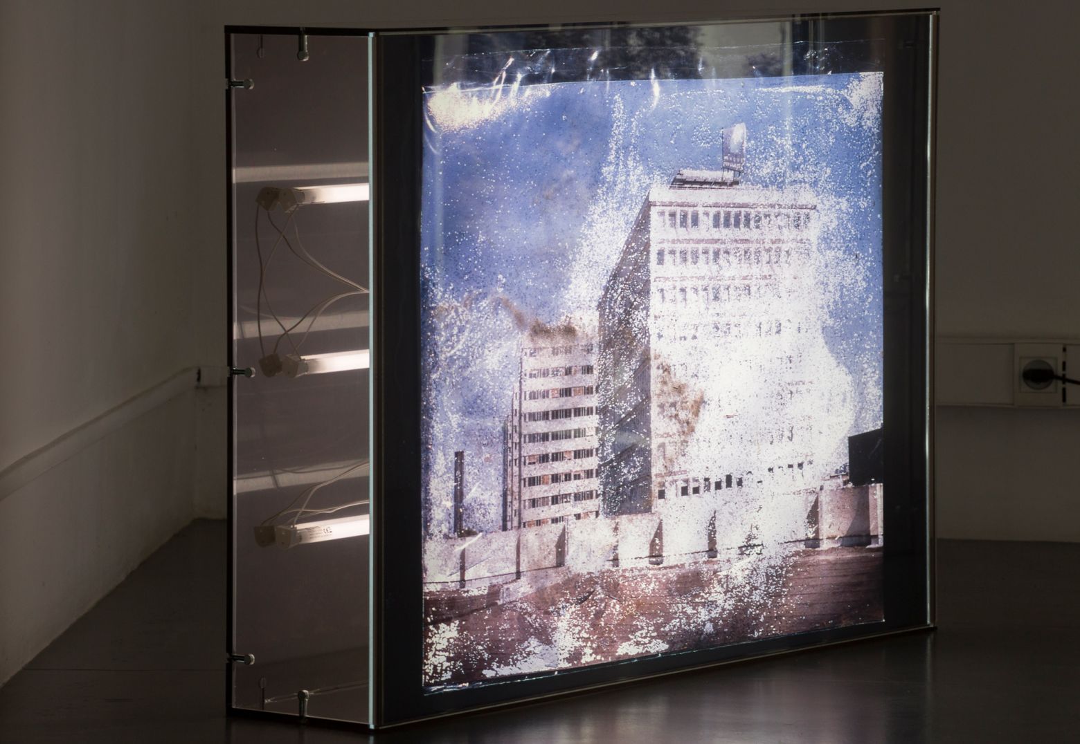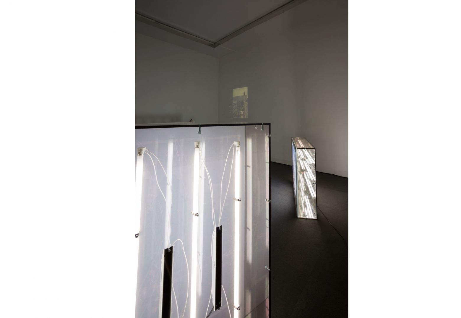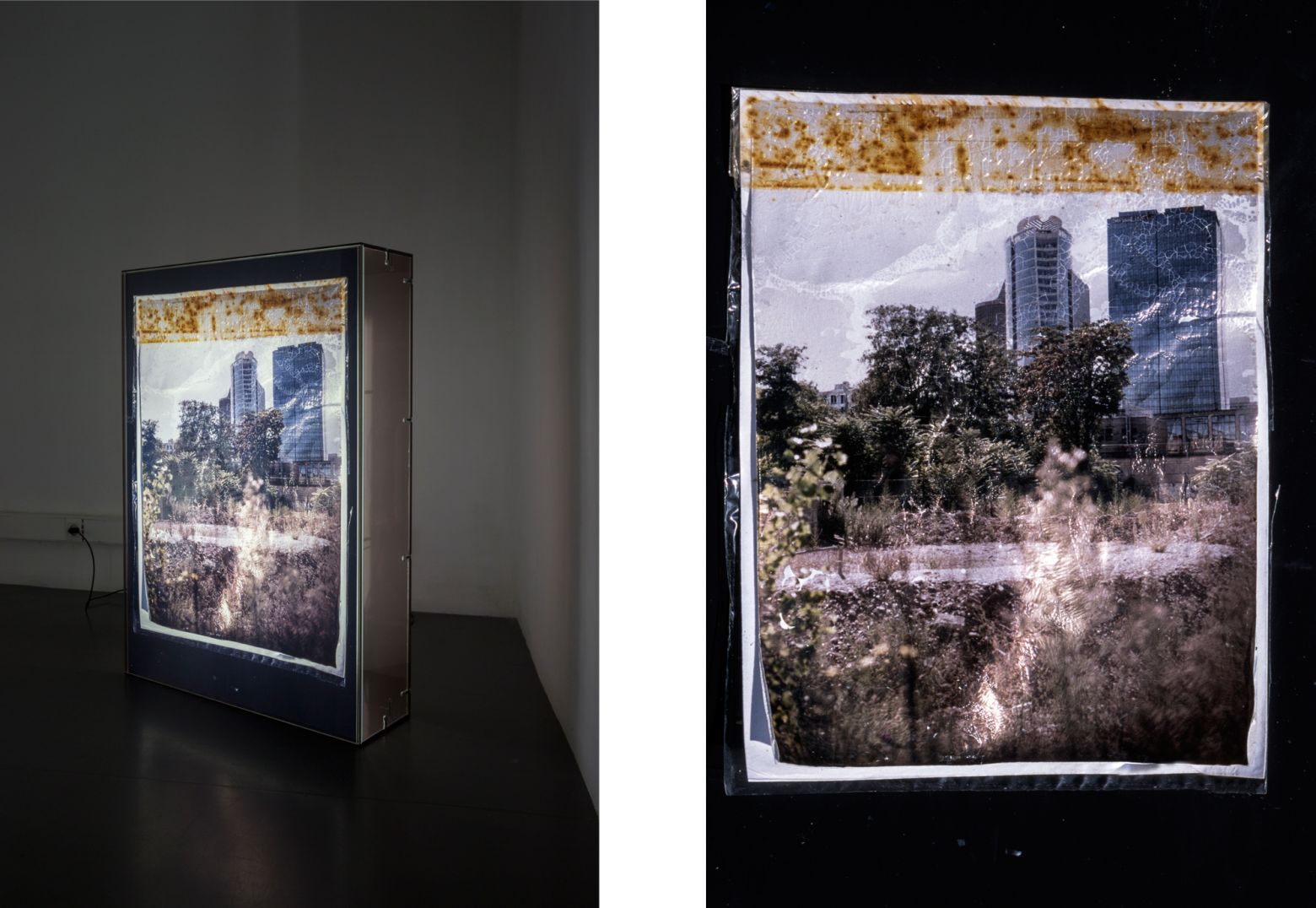 2 caissons lumineux, 100 x 70 x 20 cm, plaques de Perspexe fumé bronze 8 mm, tirages lambda sur Duratrans brillant, néons