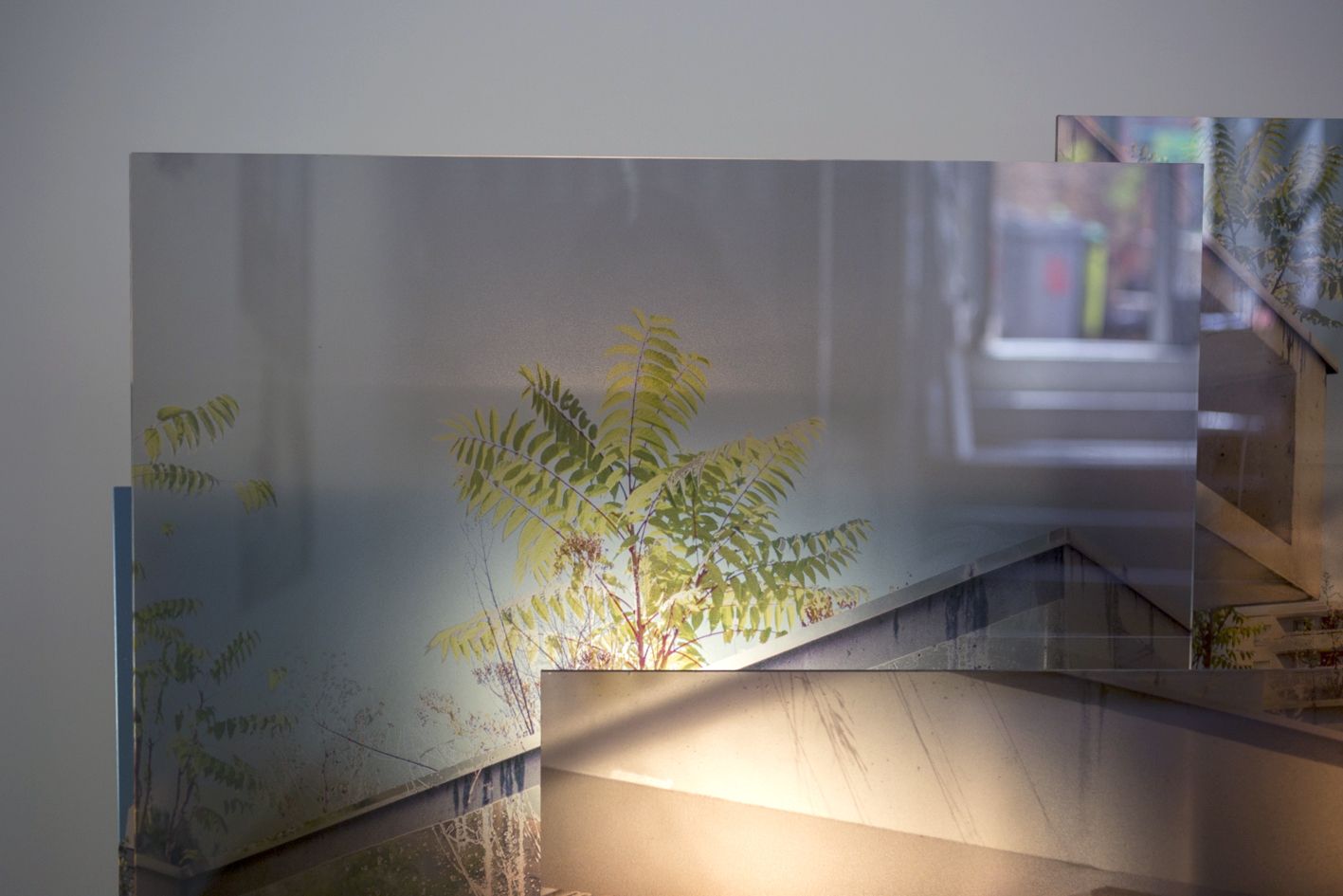 Installation, 7 plaques de verre synthétique, phares Peugeot 206, 100 x 70 cm
