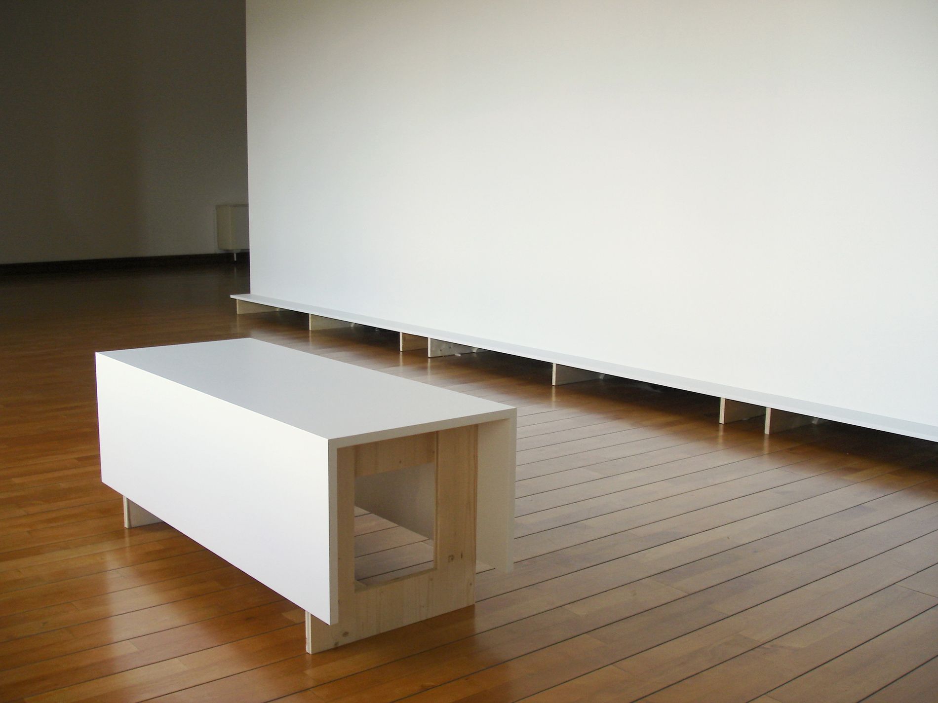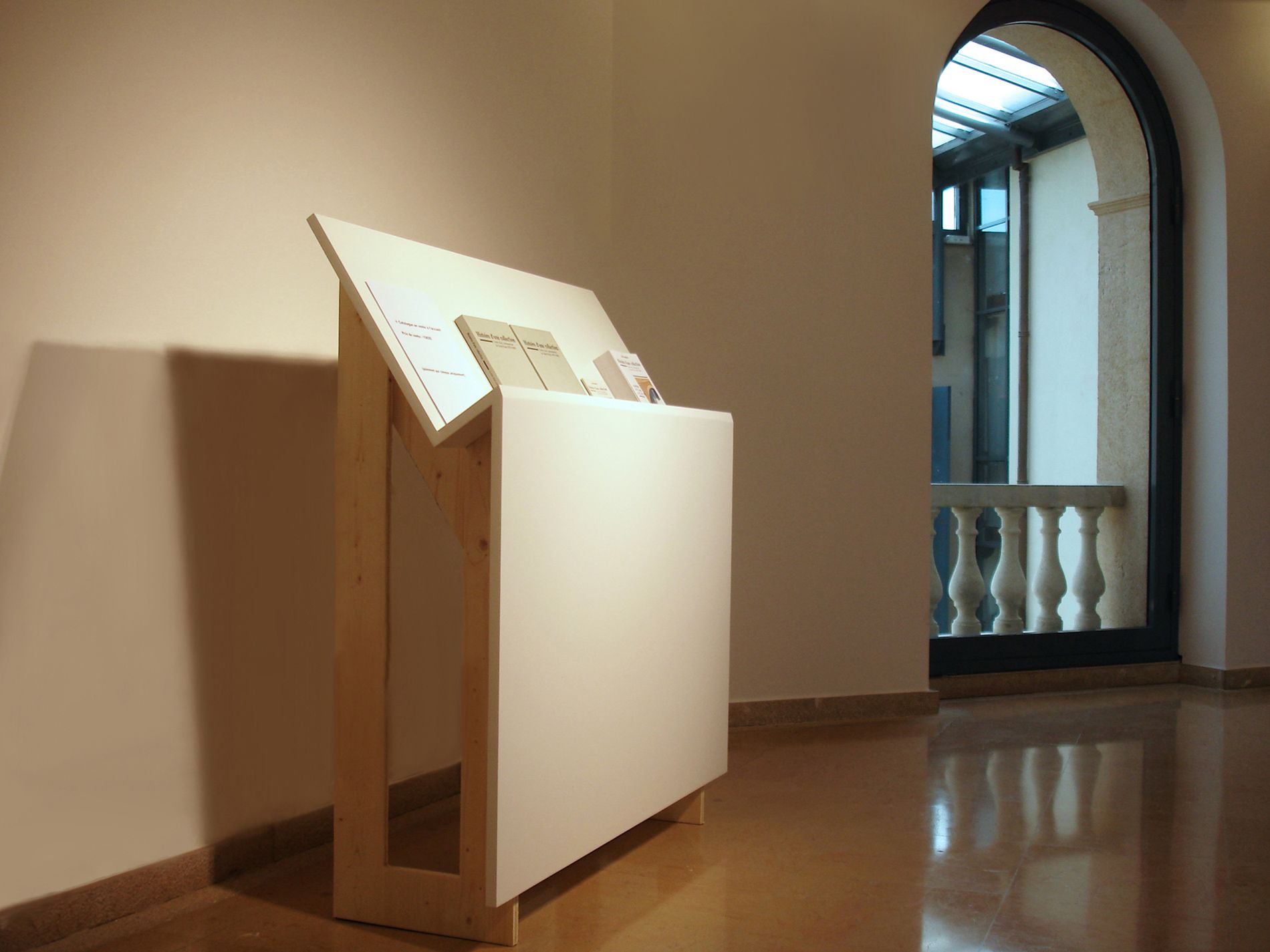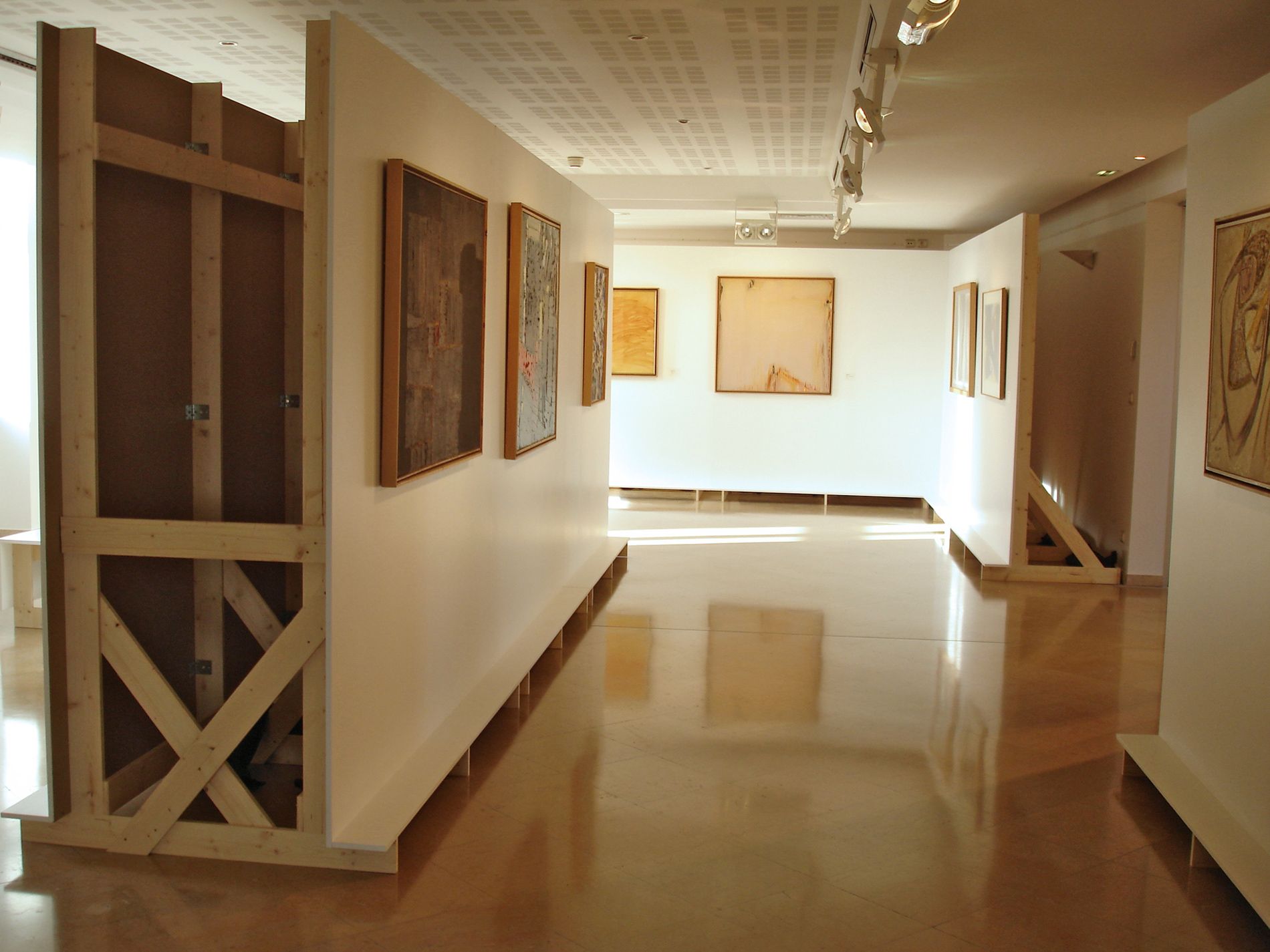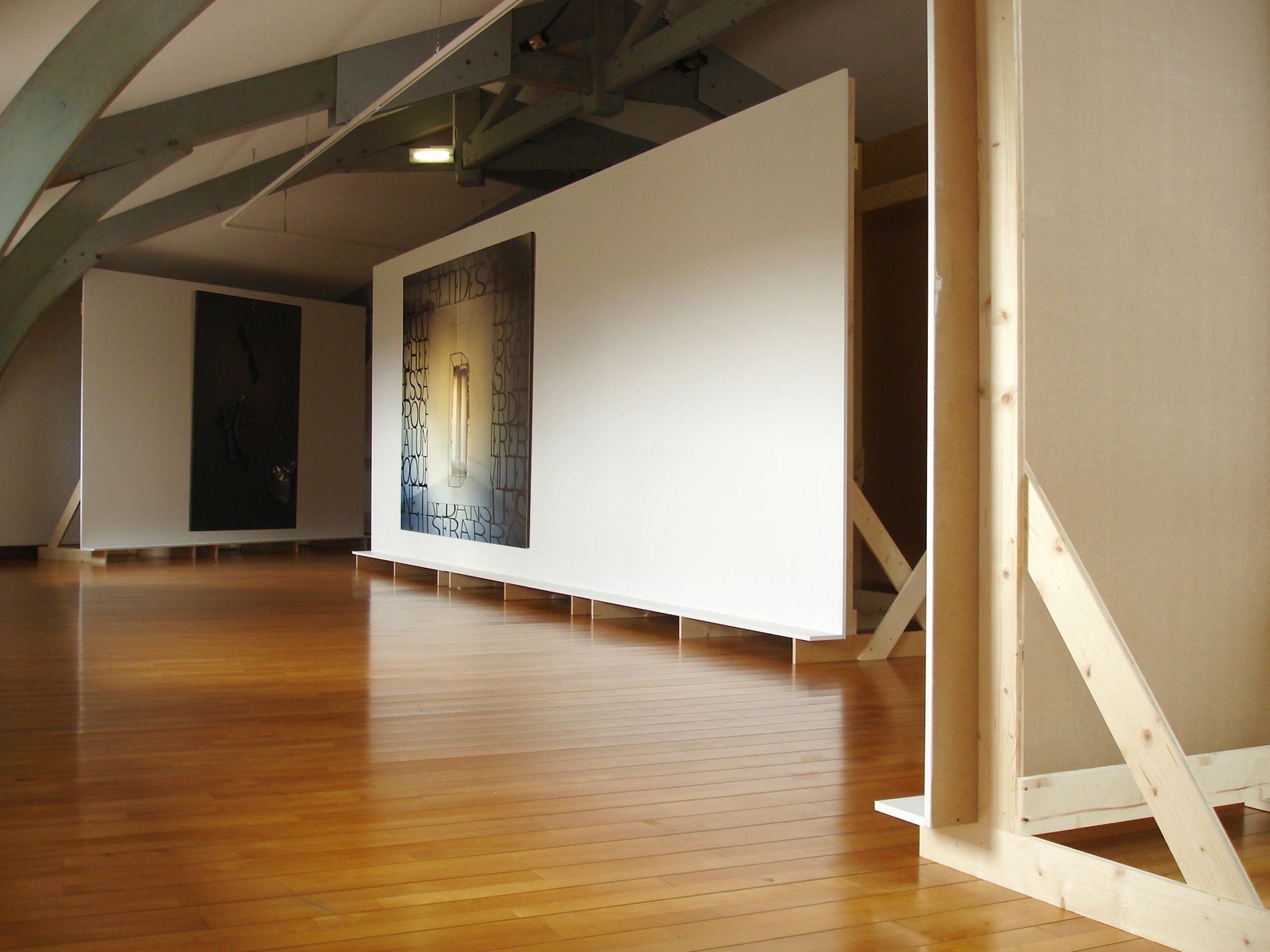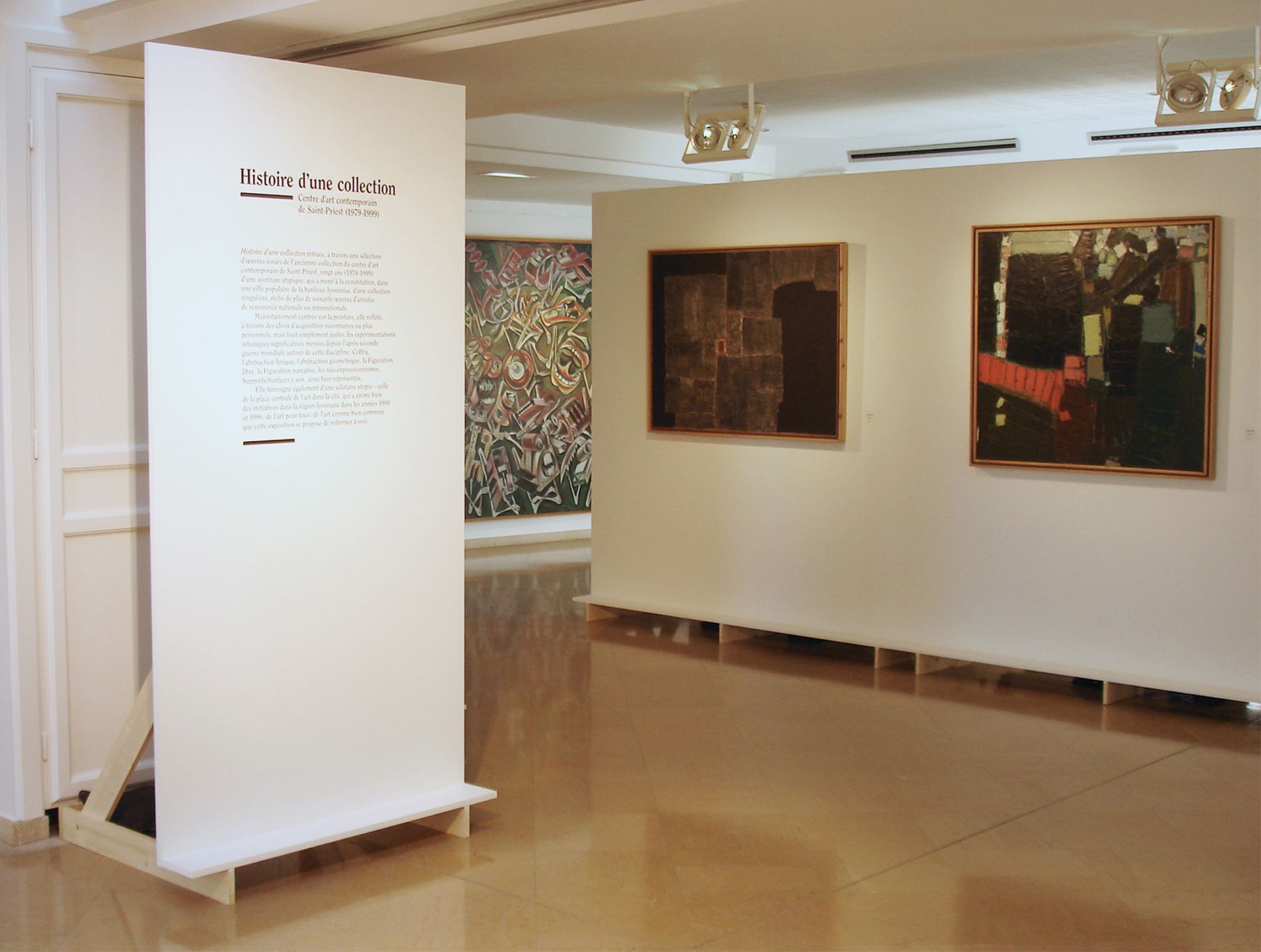 Conception d'une scénographie pour présenter les œuvres de la collection de l'ancien Centre d'art contemporain de Saint-Priest. Réalisation d'un système de cimaises modulables permettant de neutraliser le lieu et de créer un ensemble homogène. Leurs structures en bois sont volontairement laissées apparentes. Les piètements sont dessinés comme une charpente avec des pieds en contrefort.