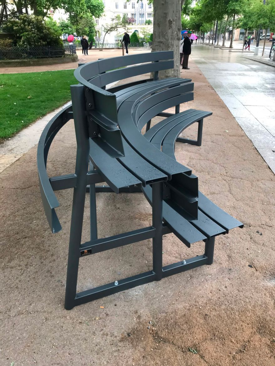 Le banc Tribune est également un banc modulaire dont les éléments peuvent s’associer pour former des ensembles. On peut alors imaginer différentes compositions à partir du modèle de base. Ces bancs peuvent être juxtaposés pour former de petit amphithéâtre ou des ondulations. C’est un mobilier intergénérationnel qui s’adresse à un large public.