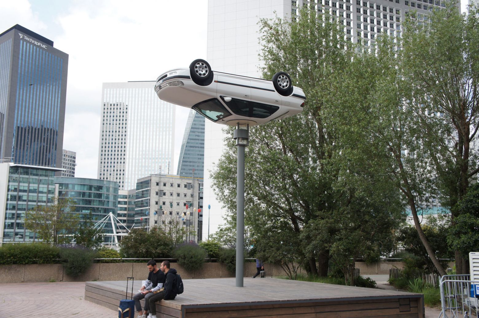 Le quotidien est la source de ses idées, ce quotidien qui est aussi le nôtre ; notre ordinaire en somme. Il semble que ce soit un choix, la marque d’une empathie, peut-être. Et qu’utilise-t-il : un barbecue, des voitures, l’effigie de Ronald McDonald, un skate, un pistolet à eau, l’image d’un tube de colle, des bouts de carton, de ficelles… une sorte d’inventaire à la Prévert de nos objets ordinaires sortis d’un monde sans qualité. L’emploi de ces “matériaux pauvres” oscille entre poésie, étrangeté, contemplation, et aussi dérision, jeu et amusement. Ces jeux sont aussi bien visuels que sémantiques. Le détournement du sens comme celui des matériaux est de règle. L’humour, une légère autodérision sont constamment en filigrane. La légèreté est d’ailleurs partout à l’œuvre dans son travail, même dans les réalisations les plus complexes. Cette légèreté qui contribue à teinter ce travail d’étrangeté, à lui donner l’apparence d’une “utopie de proximité ». » […]
