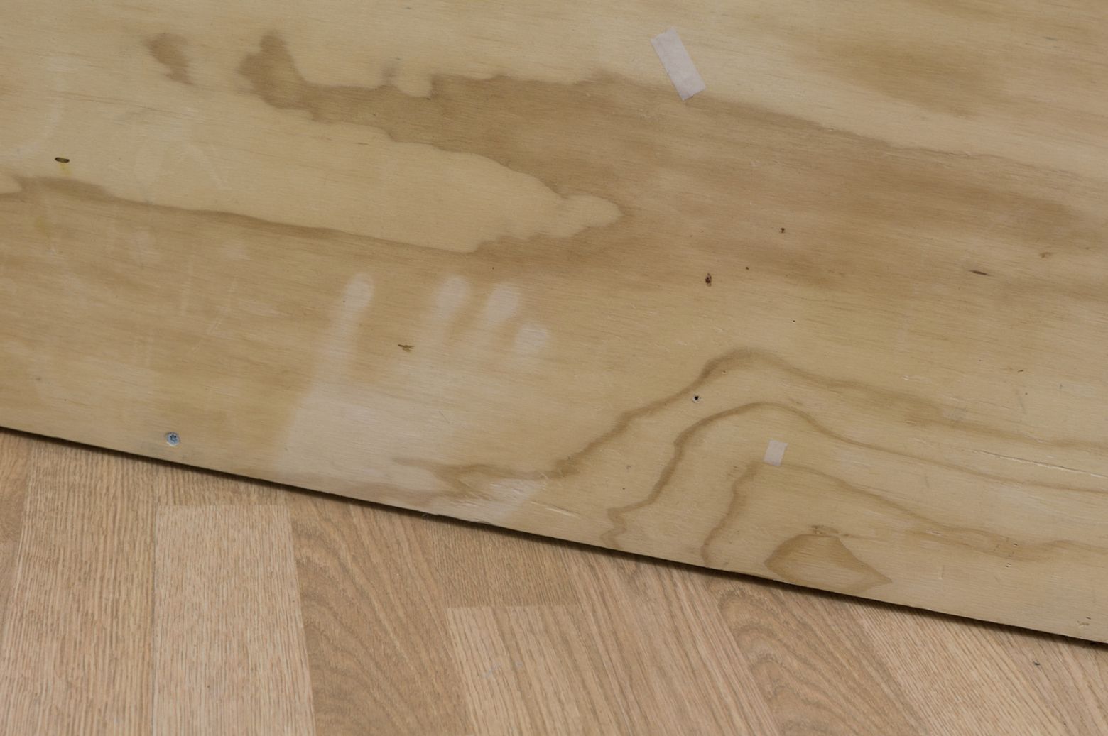 Bureau de Tatiana, vernis en spray, trace de la main de Bruno