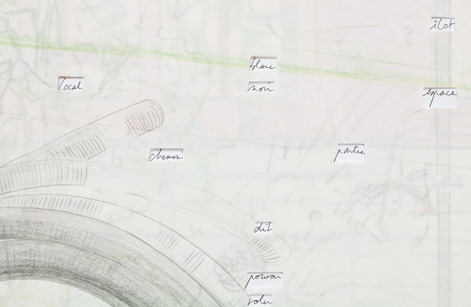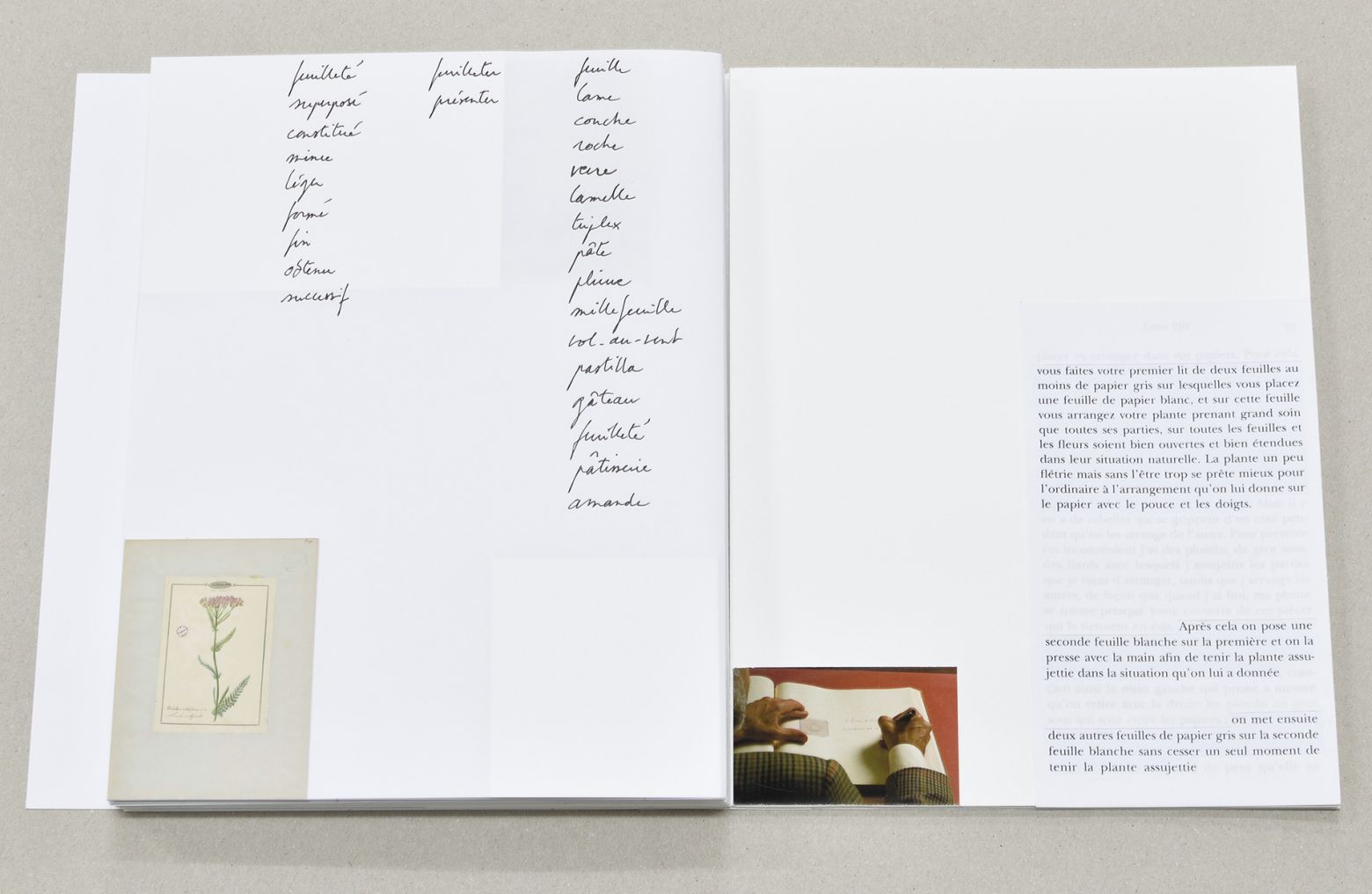 Dans les livres, je tire des variations diverses : je place photographies, reproductions d’œuvres d’art, extraits de textes littéraires, listes de mots établies à partir de définitions du dictionnaire. Je remanie ensuite les listes sur des panneaux aux configurations précises, entrelaçant et emboîtant multiples figures - reprises d’images collées dans les livres.