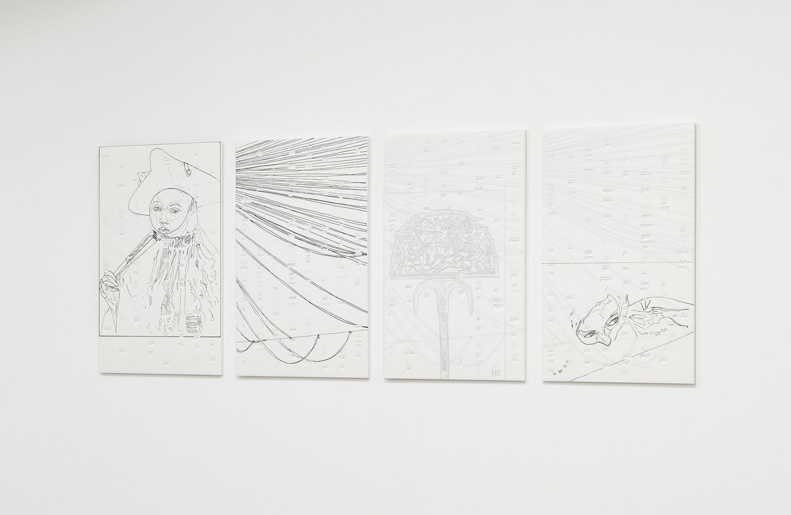 À une temporalité propre au livre répond un autre espace vivant, avec les panneaux. Dans un mouvement continu, j’ouvre dans la surface de papier de petites fenêtres laissant paraître des mots. Ces découpes, cribles de lumière dans les couches de papier superposées, animent l’espace d’un rythme - d’un battement - avec, autour, et à travers les figures.