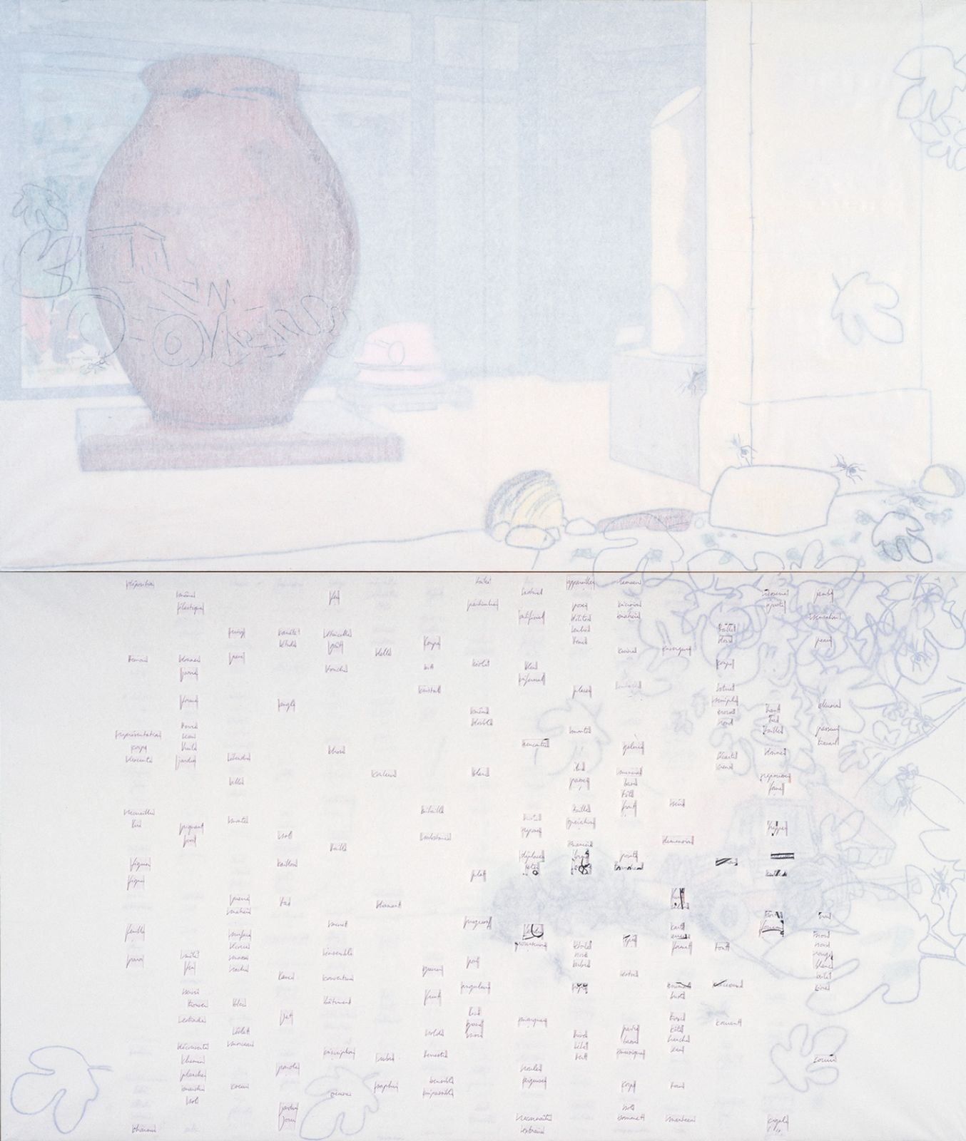 Dix panneaux 119 x 70 cm assemblés en sept groupes, contreplaqué 10 mm, papier, papier de soie coloré, feutre