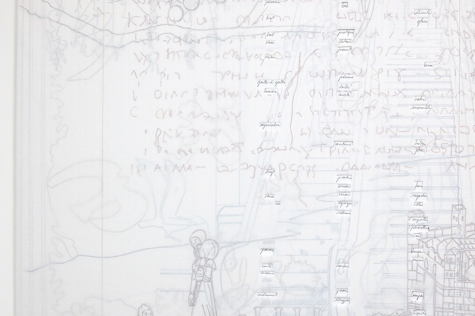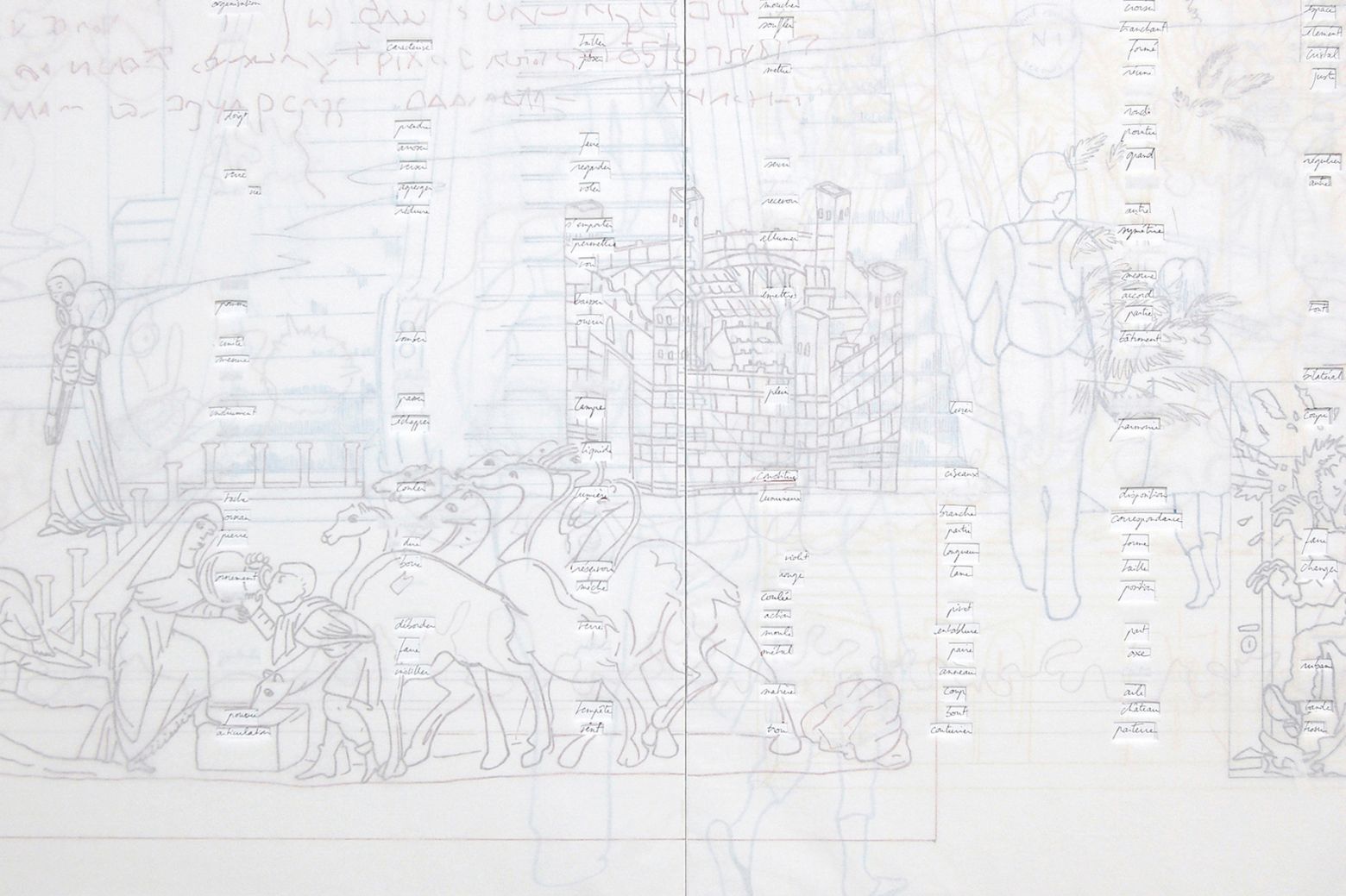 Deux panneaux, MDF 5 mm, papier, feutre, crayon de couleur, 135 x 240 cm (2 x 3 planches 135 x 80 cm)