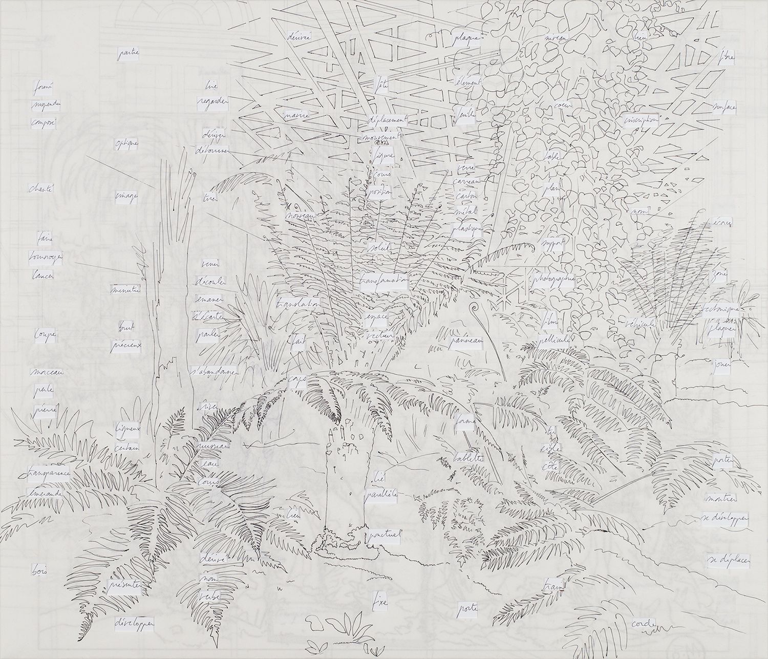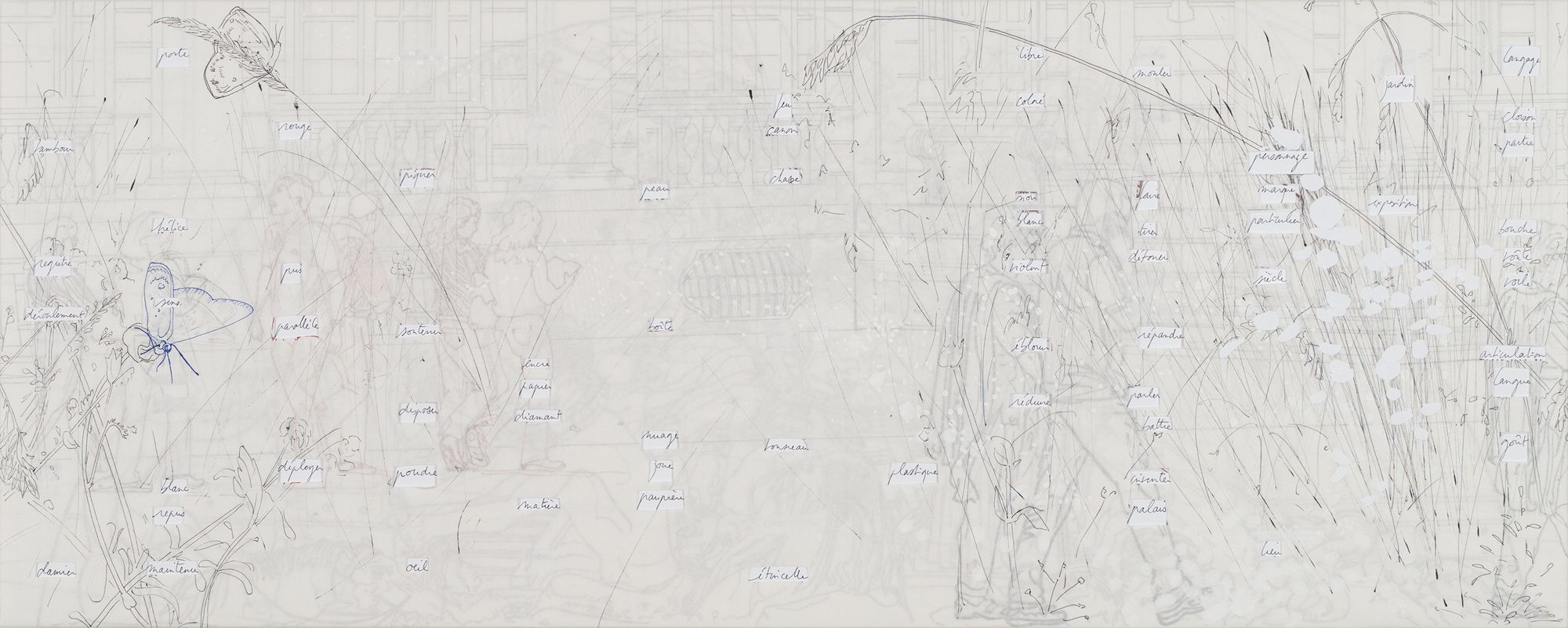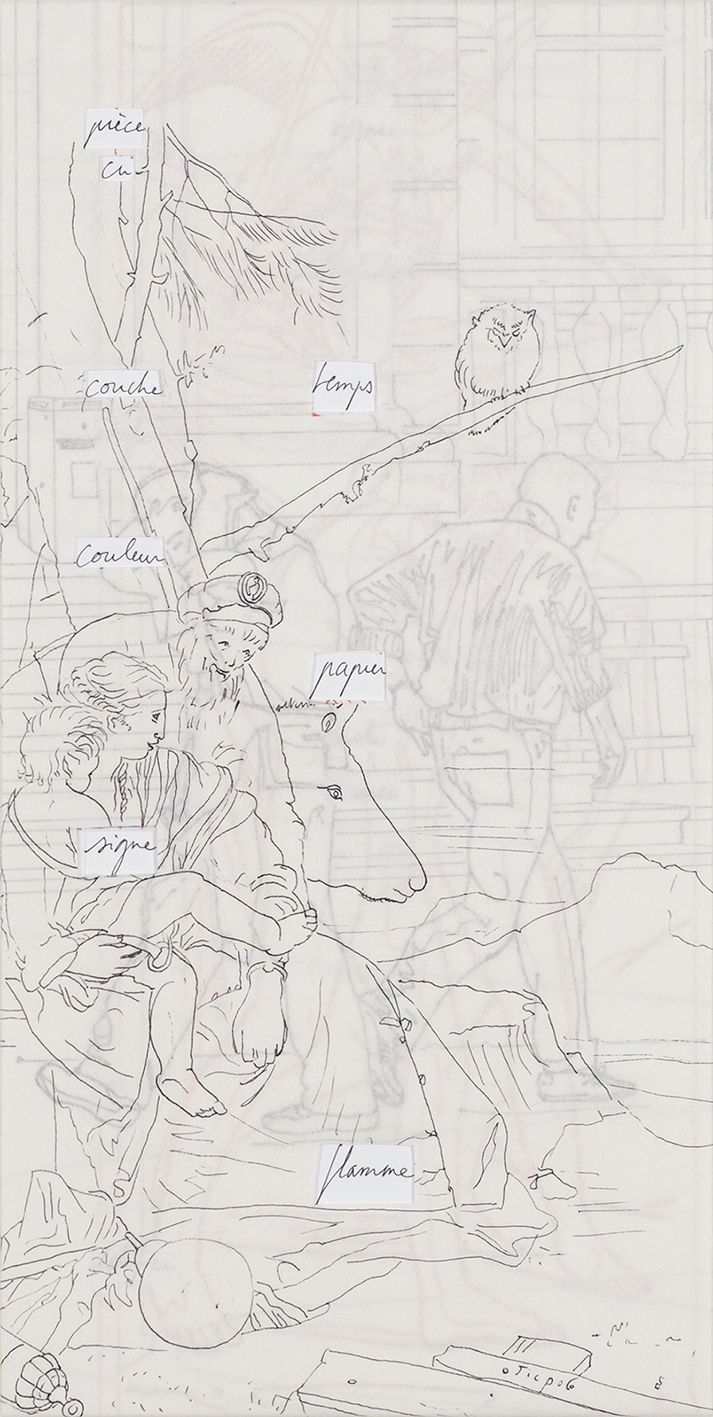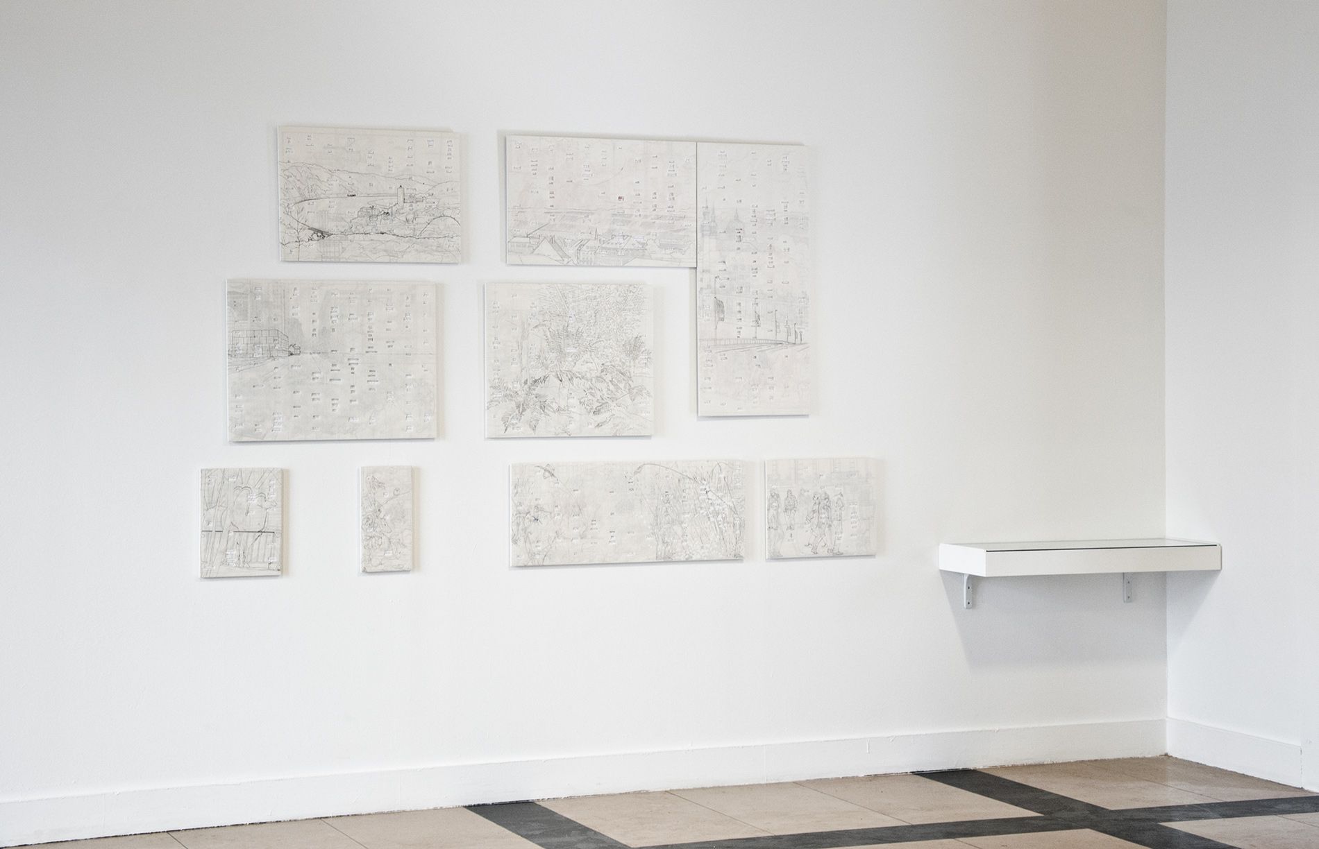 Ensemble de neuf panneaux, MDF 10 mm, papier, feutre, stylo, (135 x 180 cm)