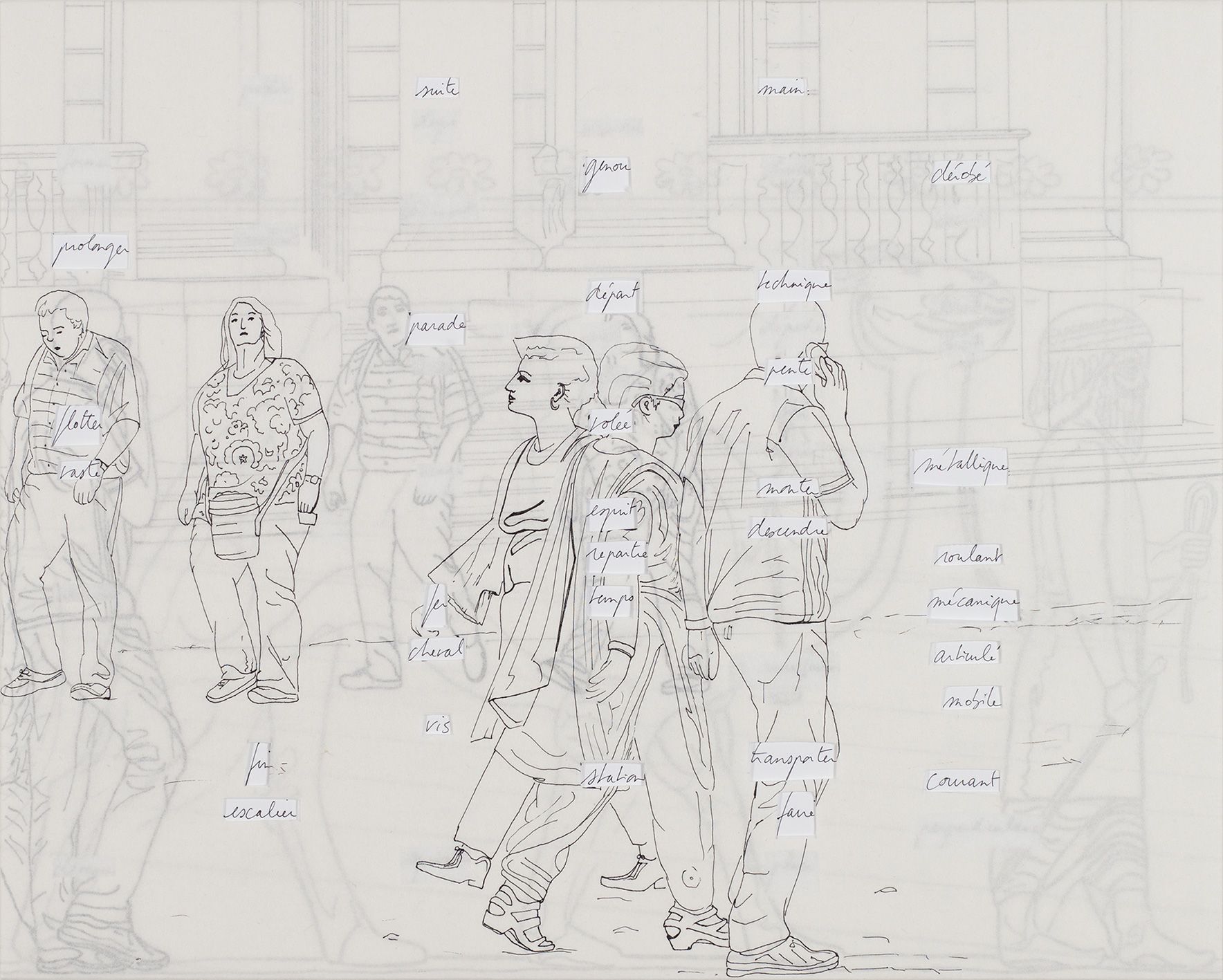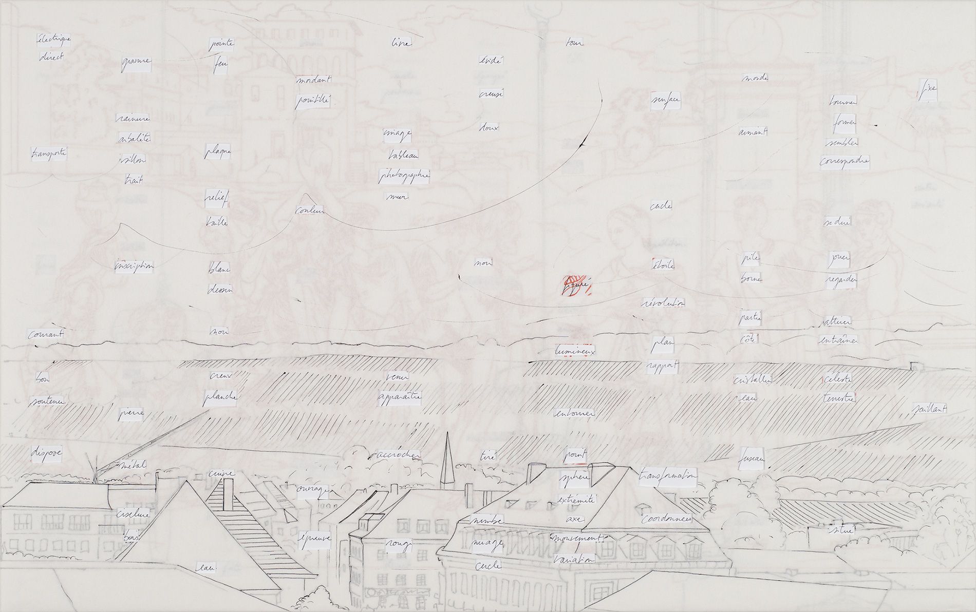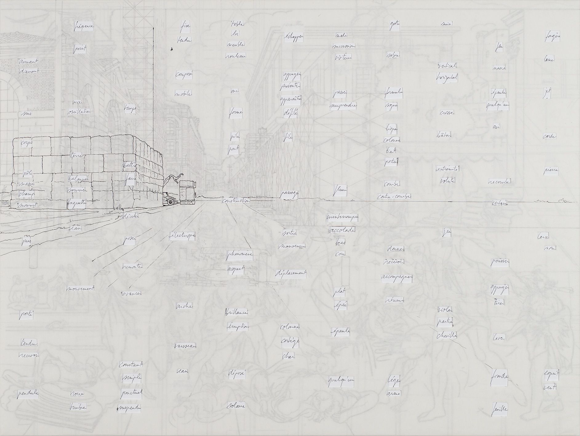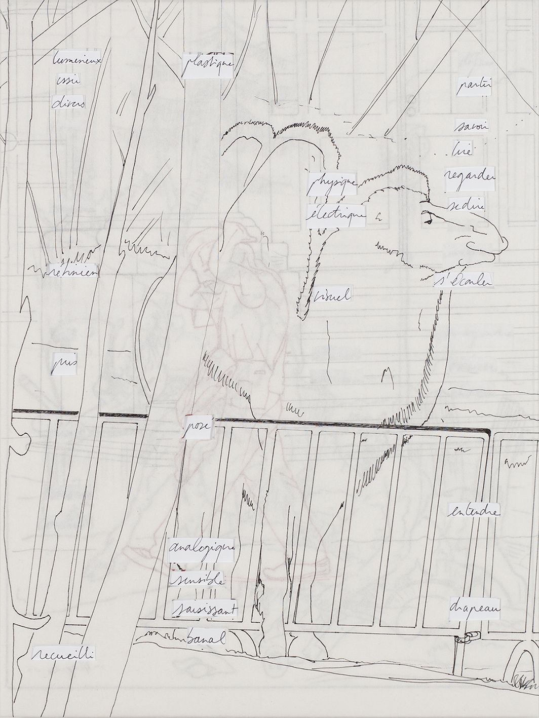 Ensemble de neuf panneaux, MDF 10 mm, papier, feutre, stylo, (135 x 180 cm)