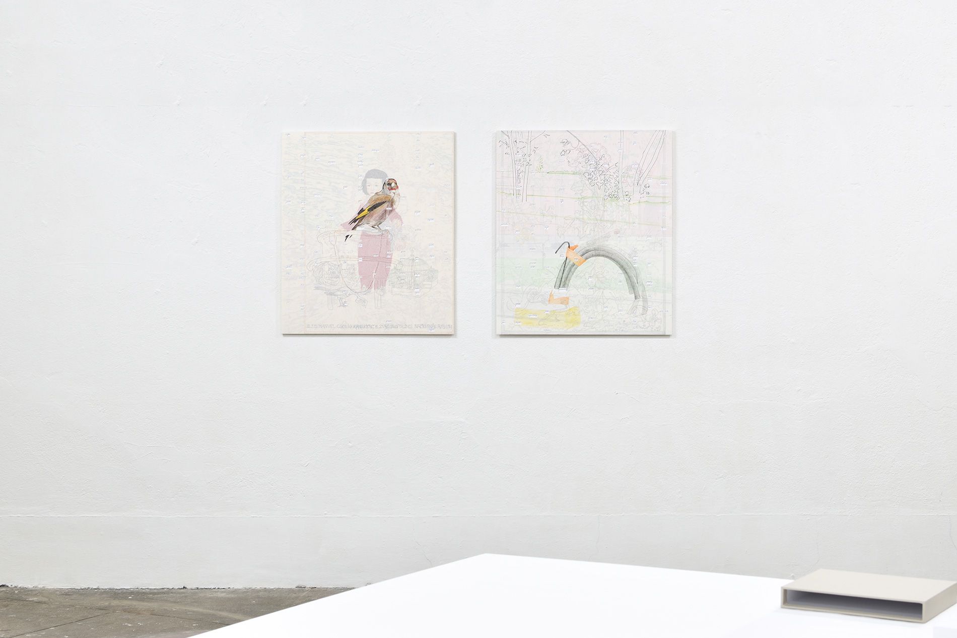 Deux panneaux 84 x 72 cm, MDF 10 mm, papier, papier de soie coloré, pastel ciré, feutre, stylo, crayon de couleur