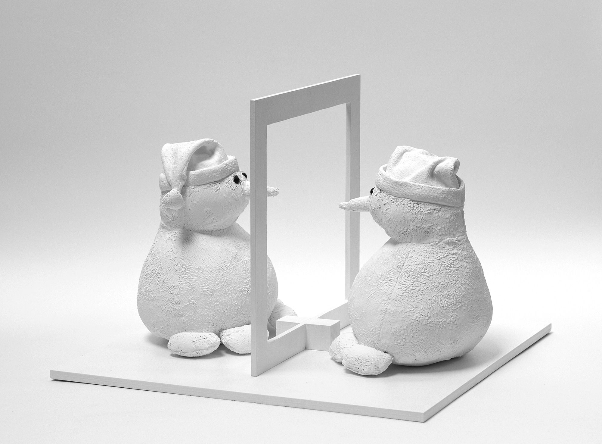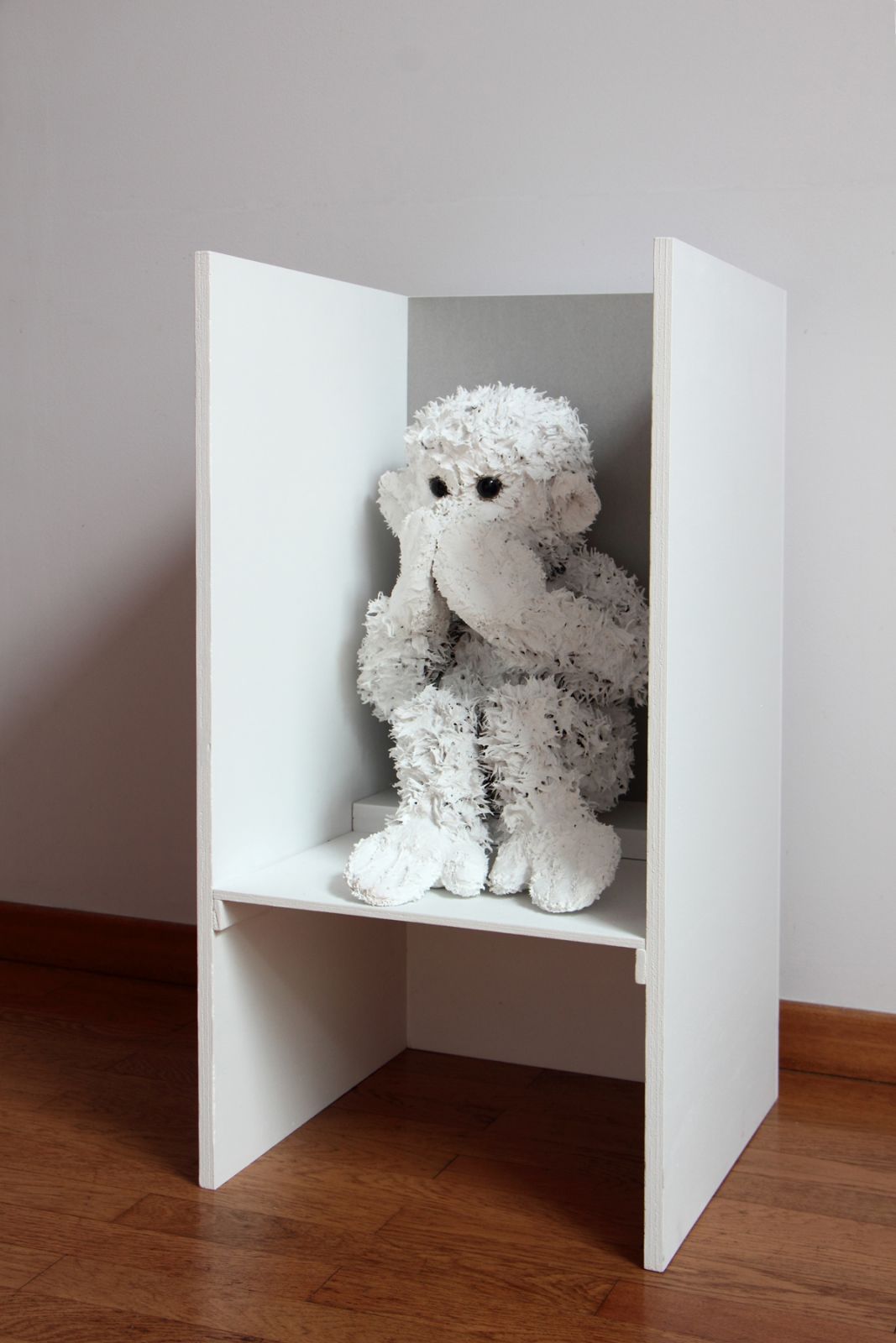 Peluche, bois, acier, coton hydrophile, pâte plastique, peinture, 35 x 35 x 35 cm