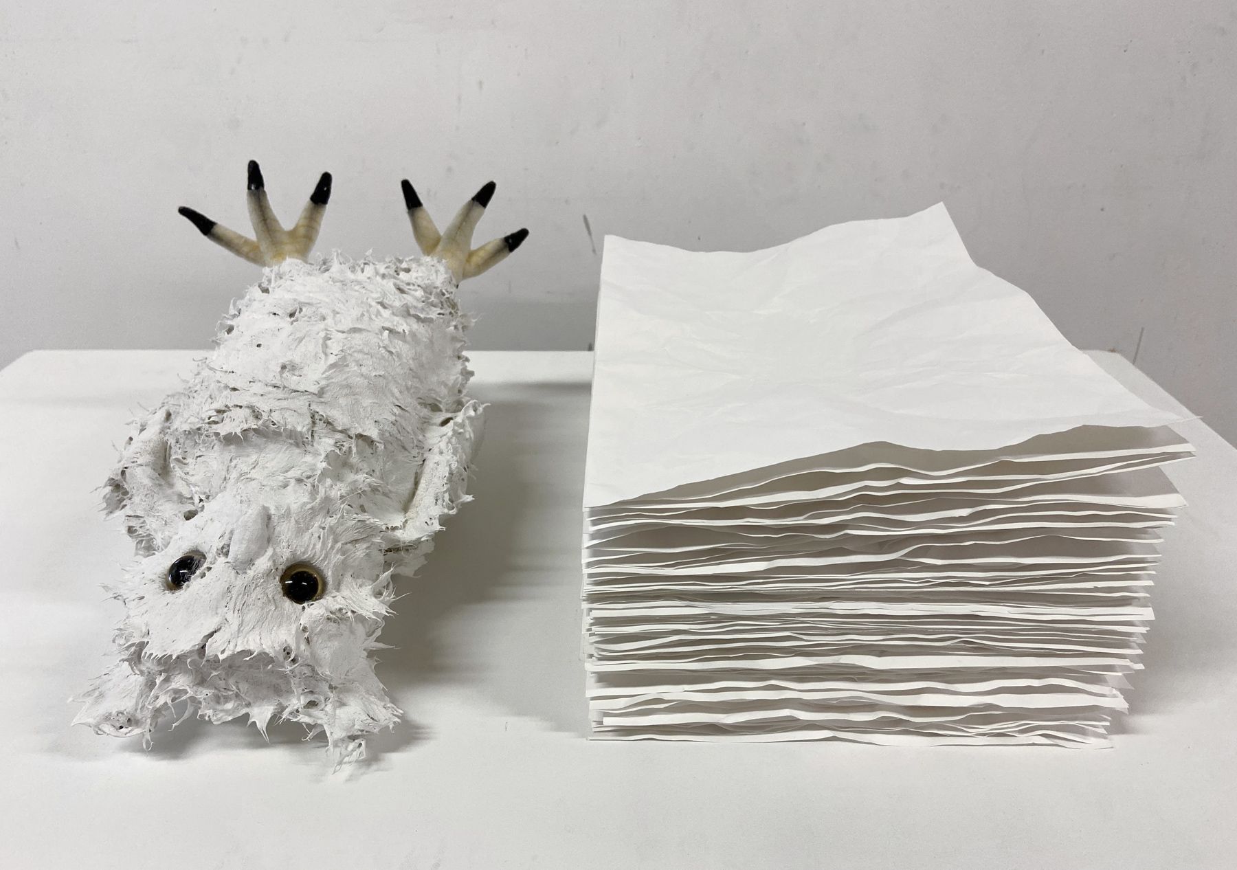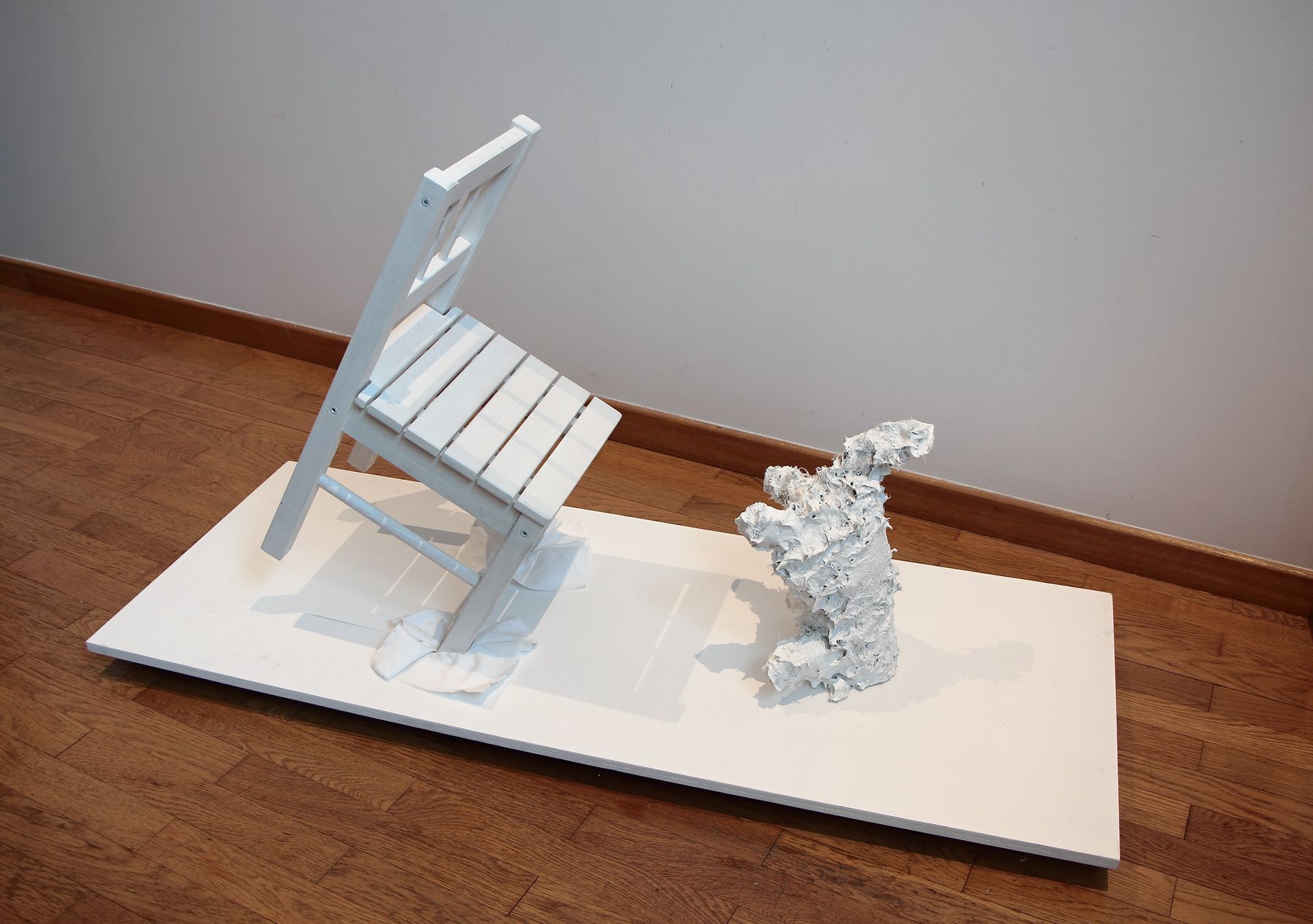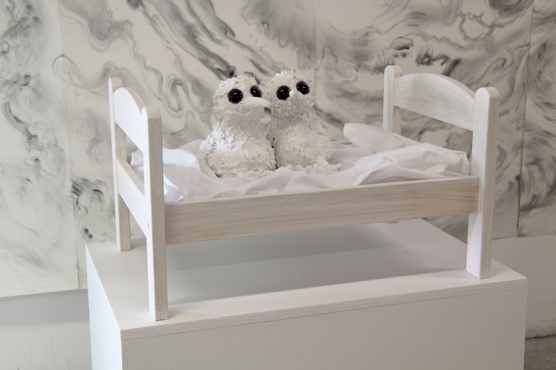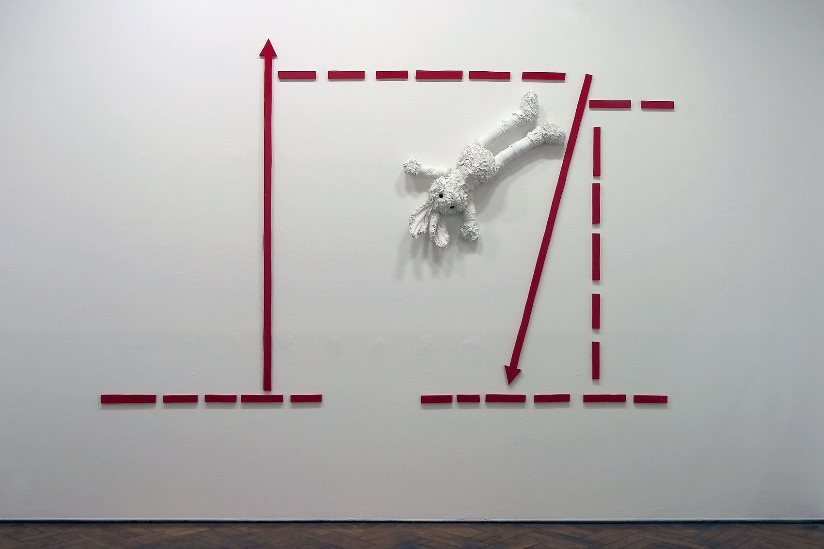 Peluche, pâte plastique, fil de fer, peinture, 59 x 15 x 15 + socle 80 x 59 x 15 cm
