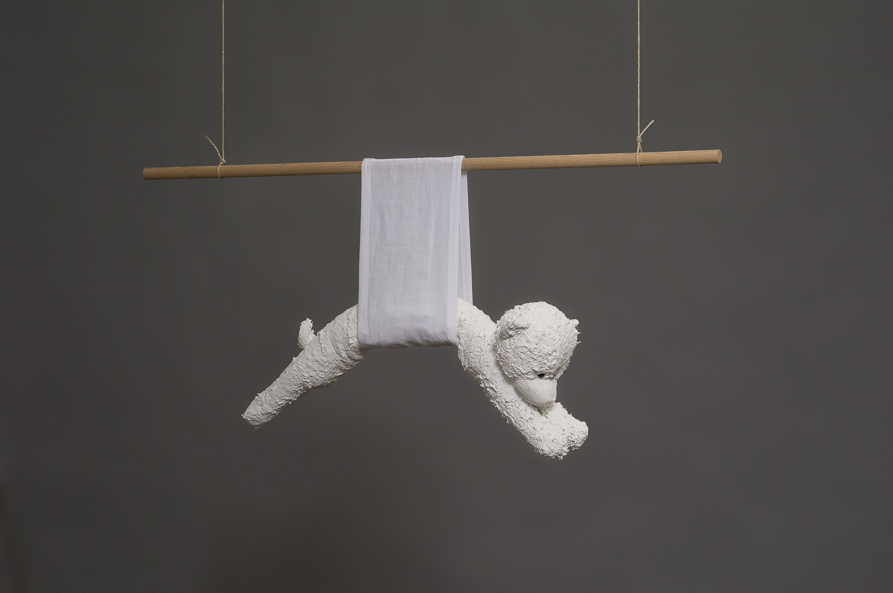 Peluche, peinture, bois, ficelle, 82 x 44 x 28 cm