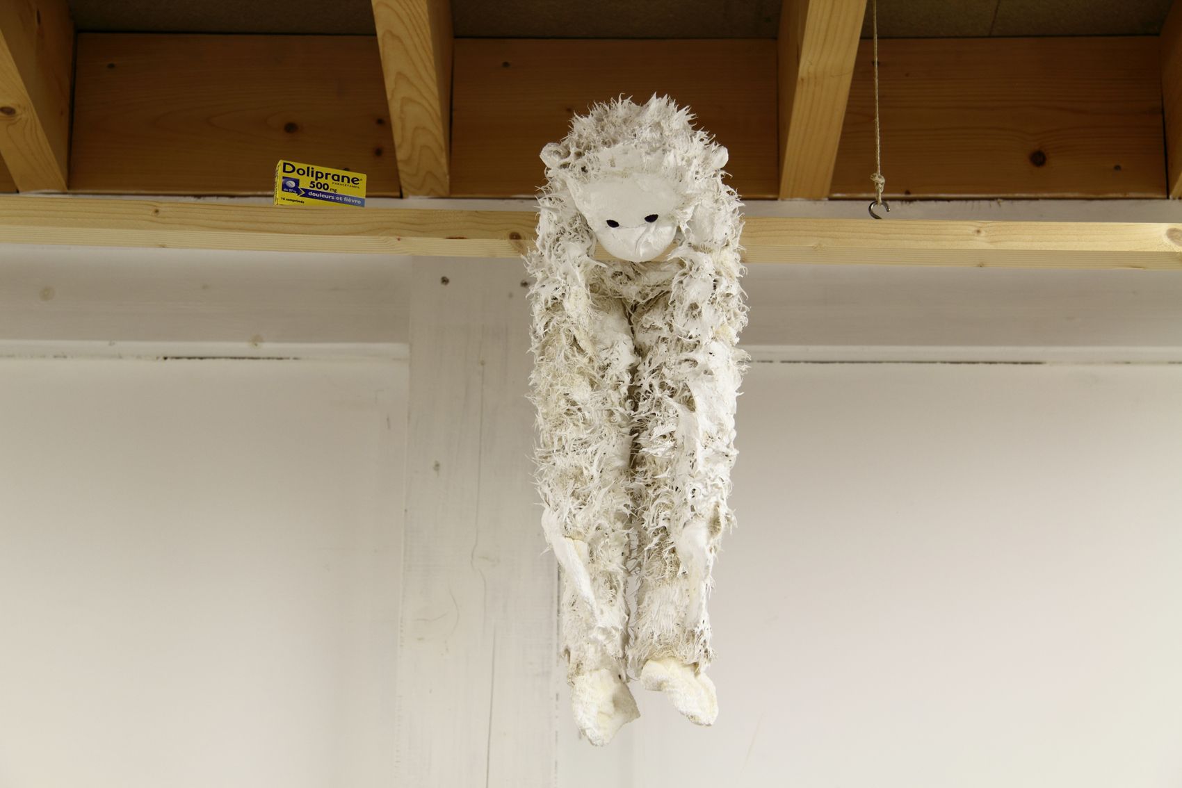 Peluche, bois, boîte vide de Doliprane, 54 x 230 x 30 cm