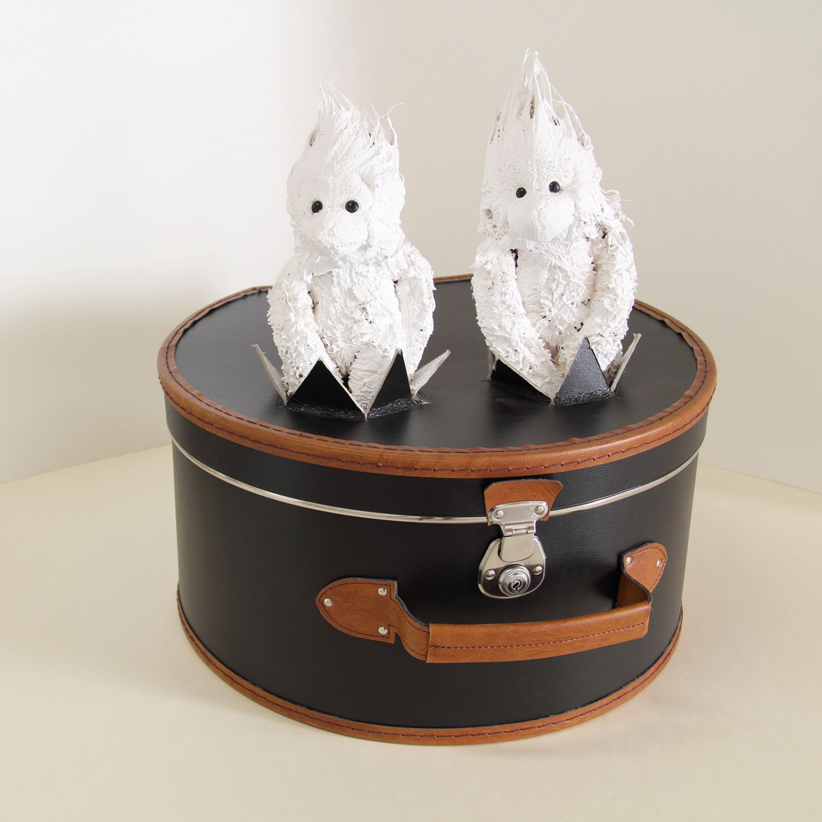 Valise à chapeau, peluches, bois, peinture, 40 x 37 x 44 cm