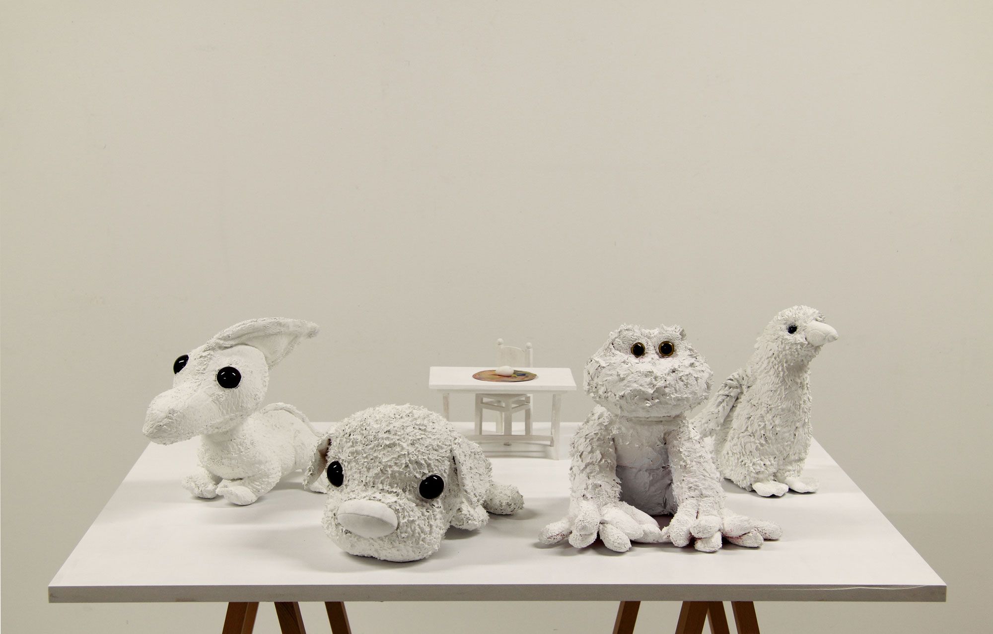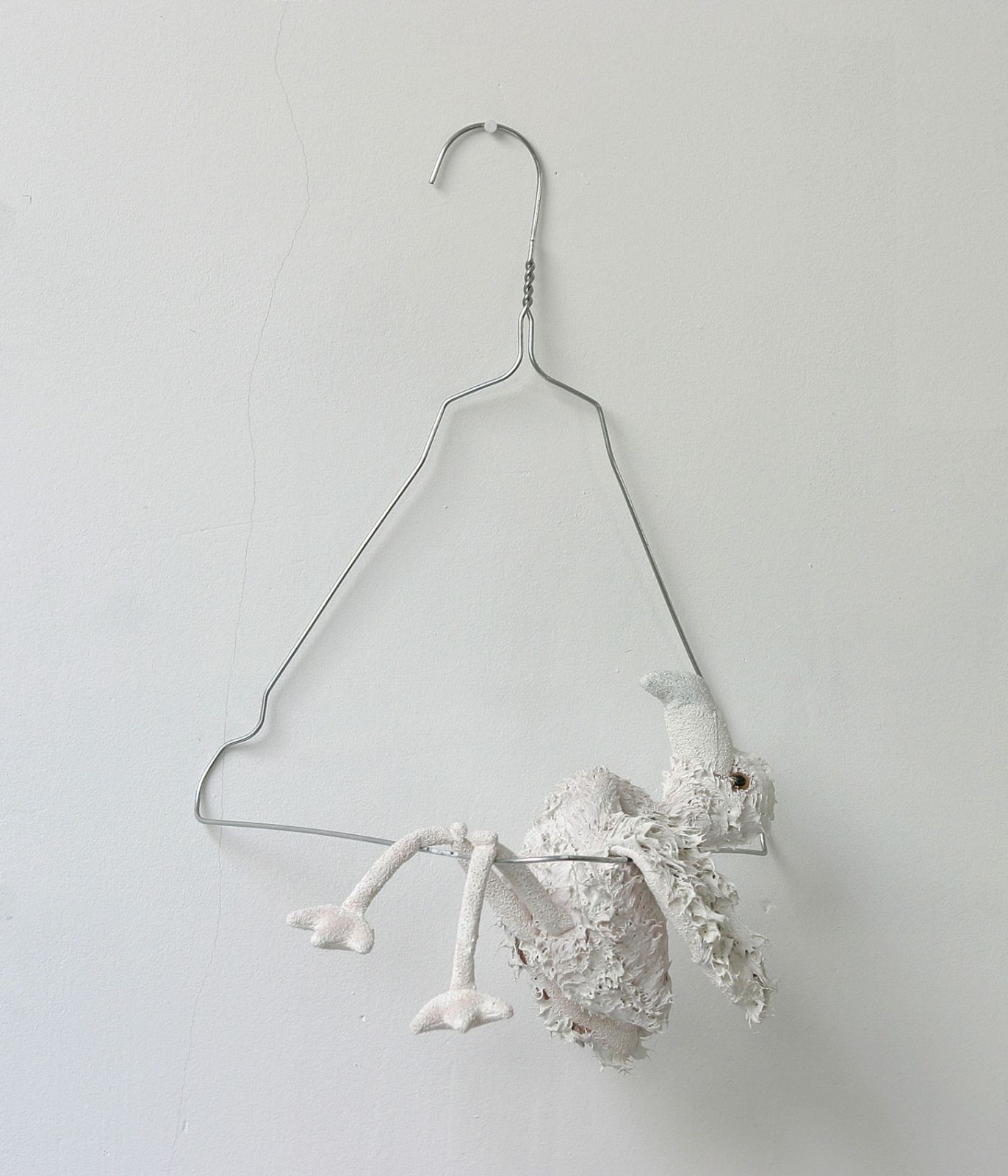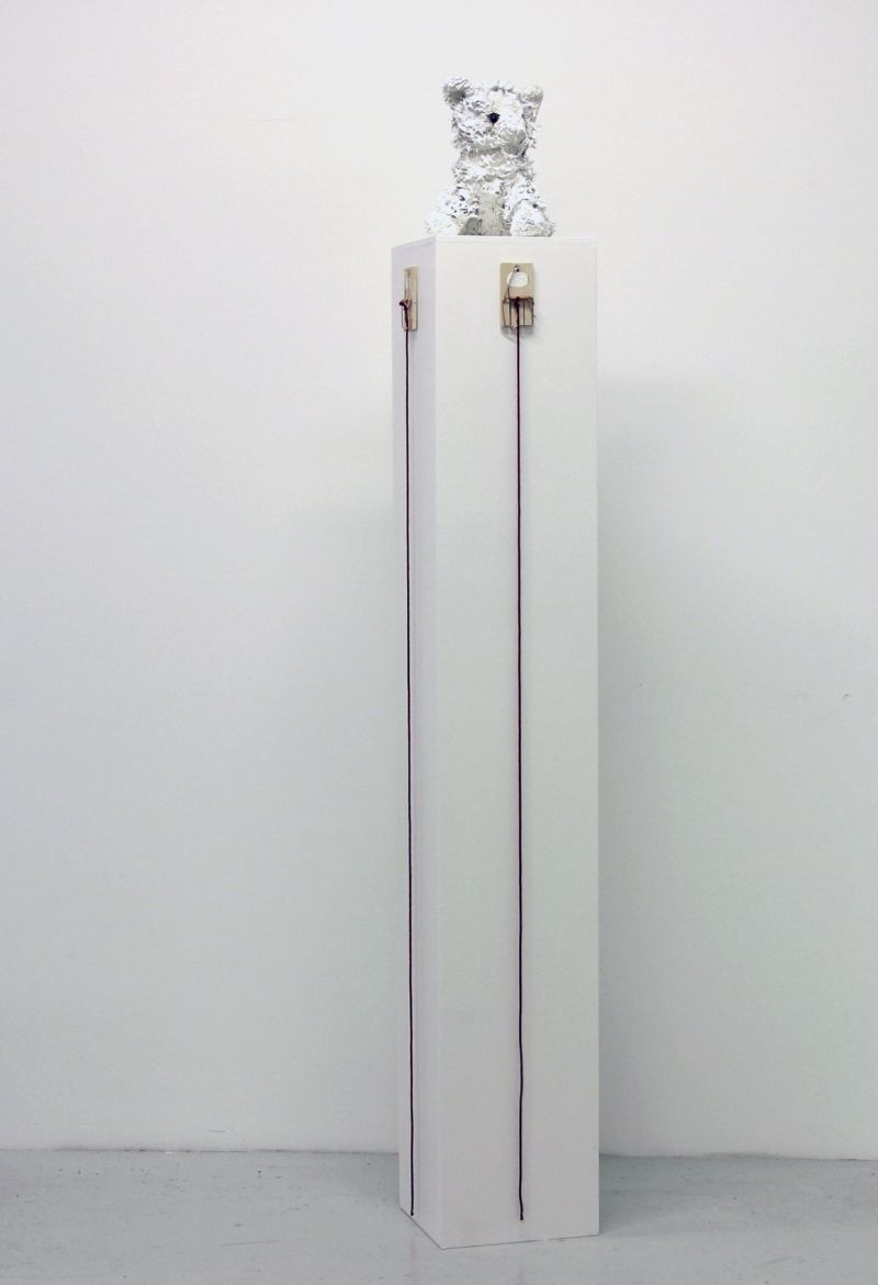 Peluche, pâte plastique, fil de fer, peinture, 59 x 15 x 15 + socle 80 x 59 x 15 cm