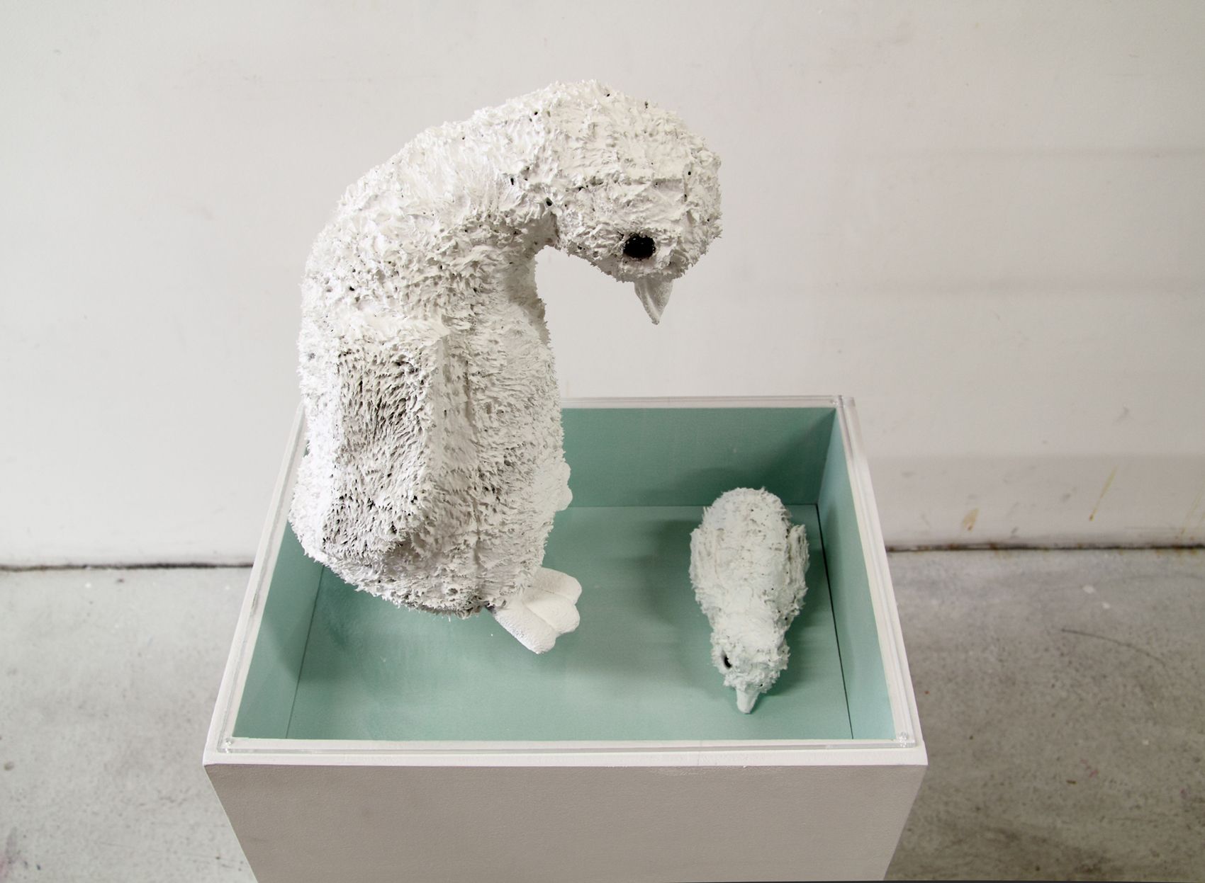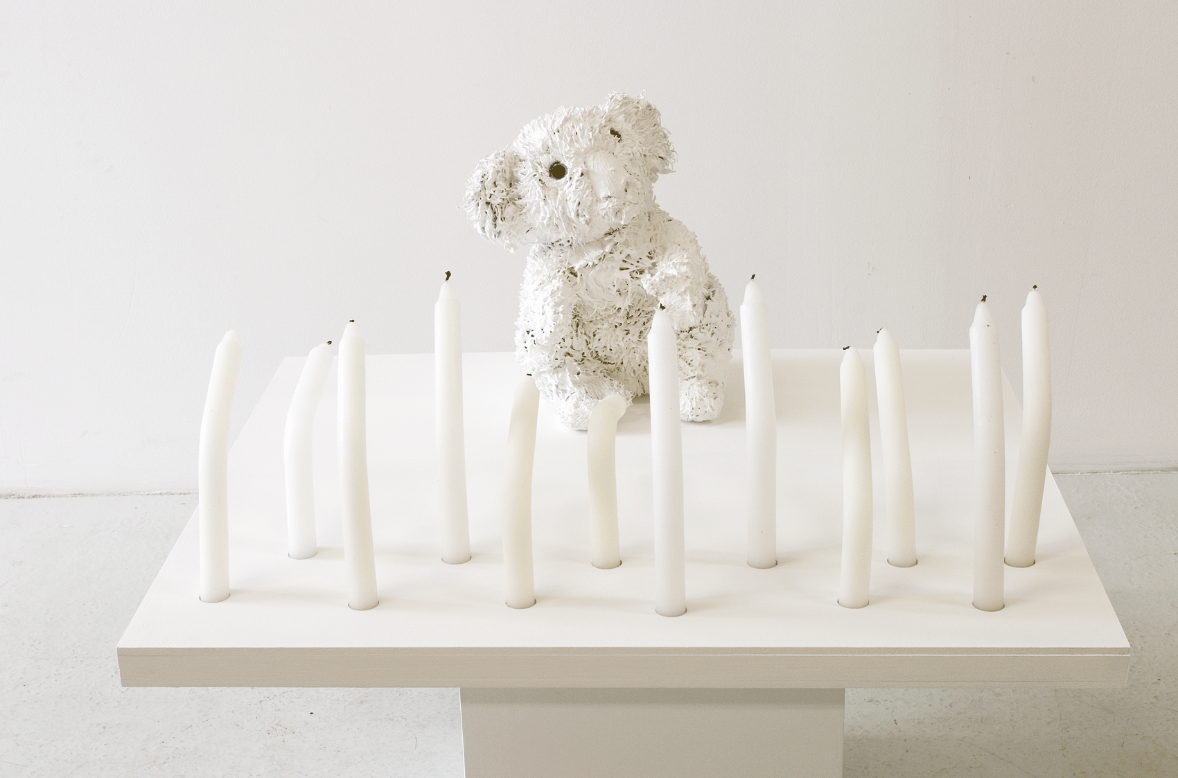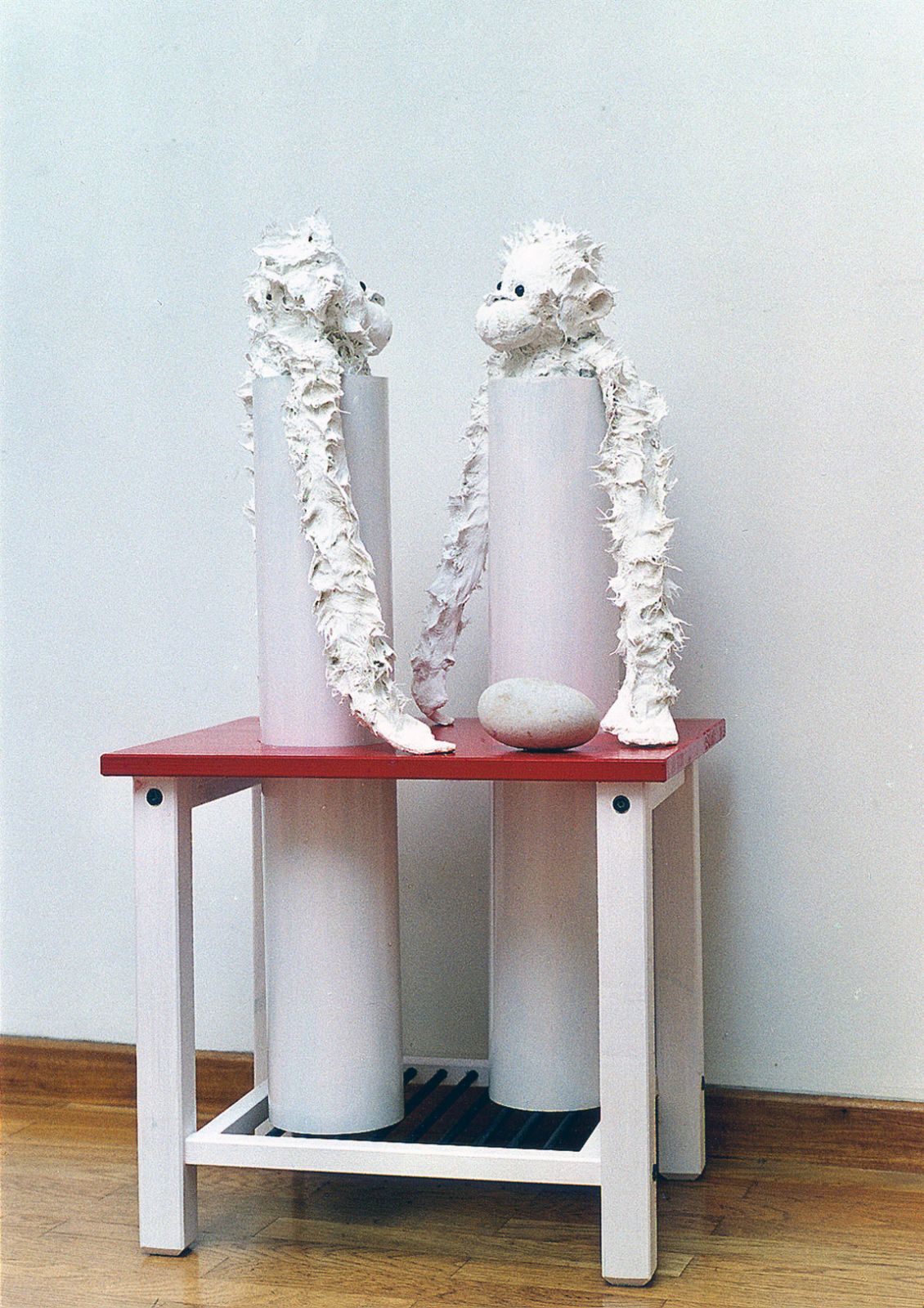 Peluche, pâte plastique, fil de fer, peinture, 59 x 15 x 15 + socle 80 x 59 x 15 cm