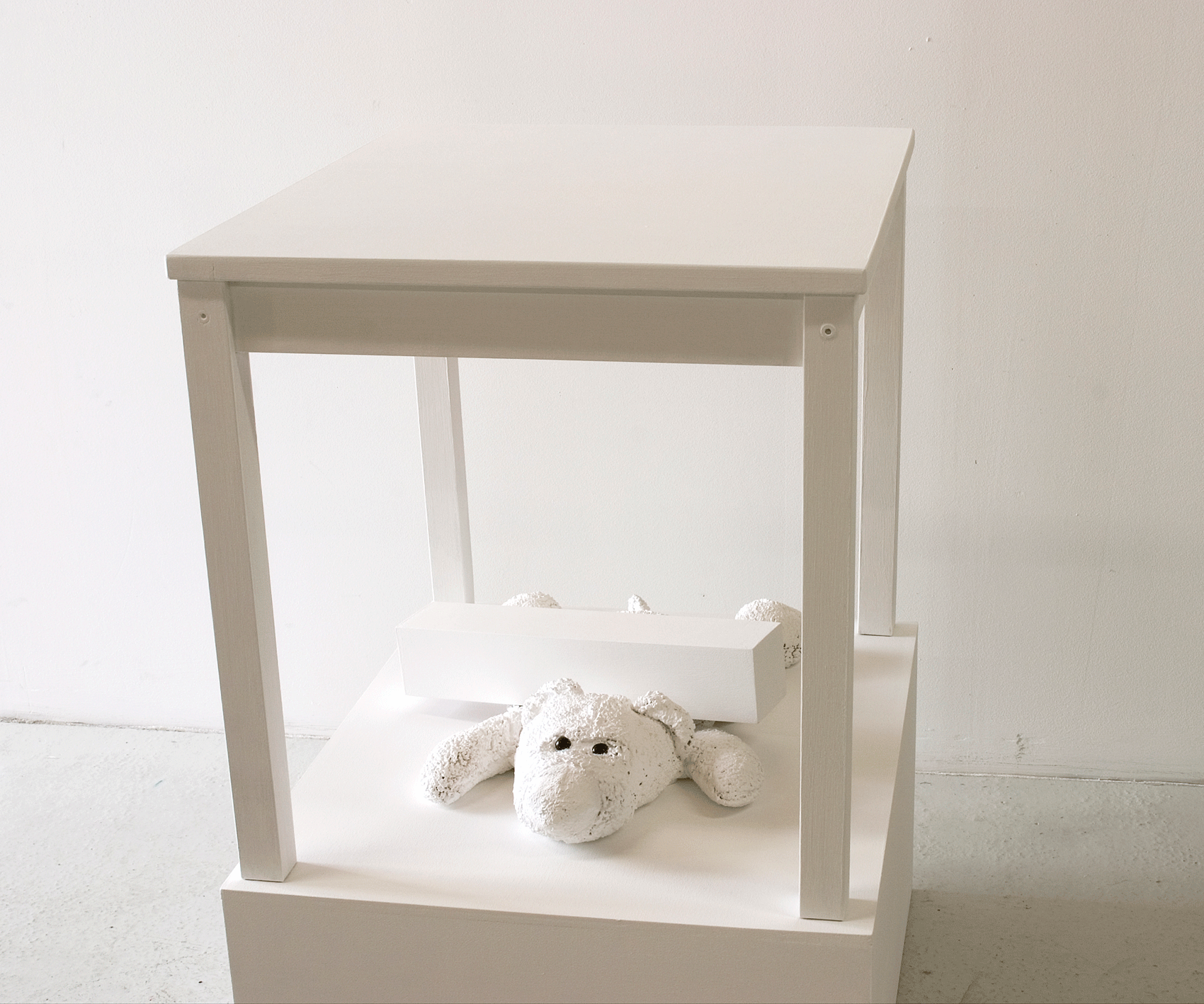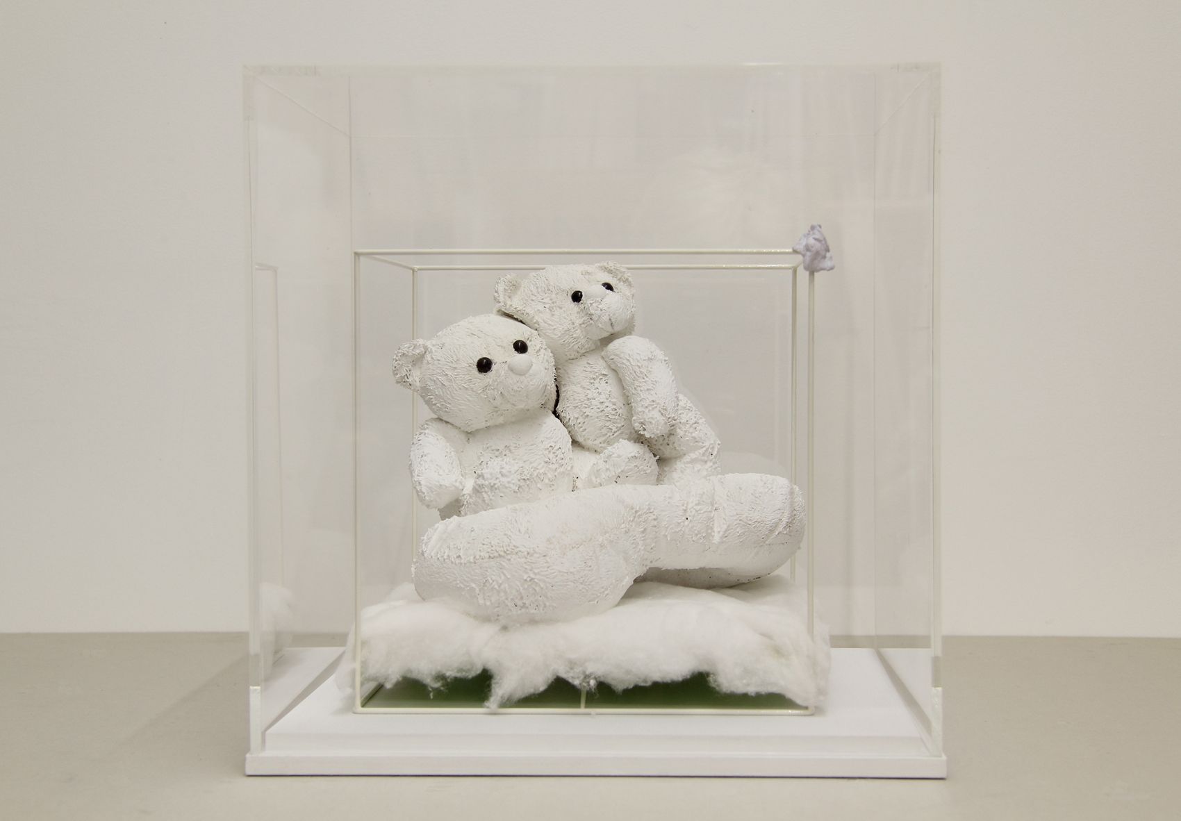 Peluche, bois, acier, coton hydrophile, pâte plastique, peinture, 35 x 35 x 35 cm