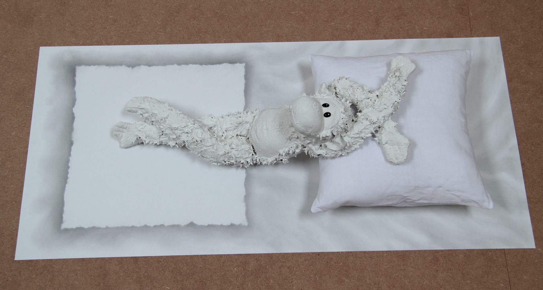 Dessin sur papier à la poudre de graphite, peluche, peinture, oreiller, 45 x 100 x 25 cm