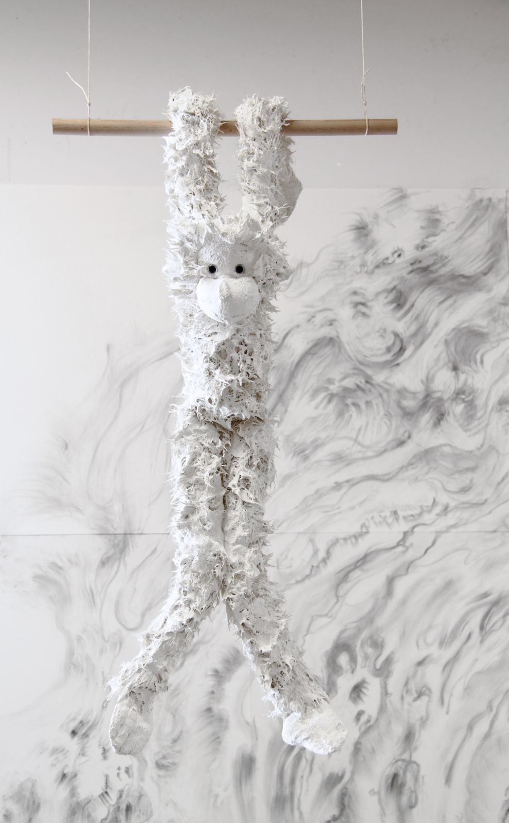 Peluche, peinture, bois, ficelle, 100 x 51 x 18 cm