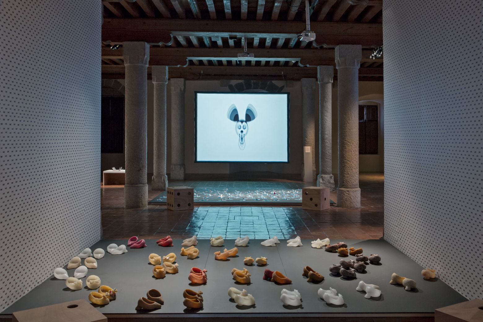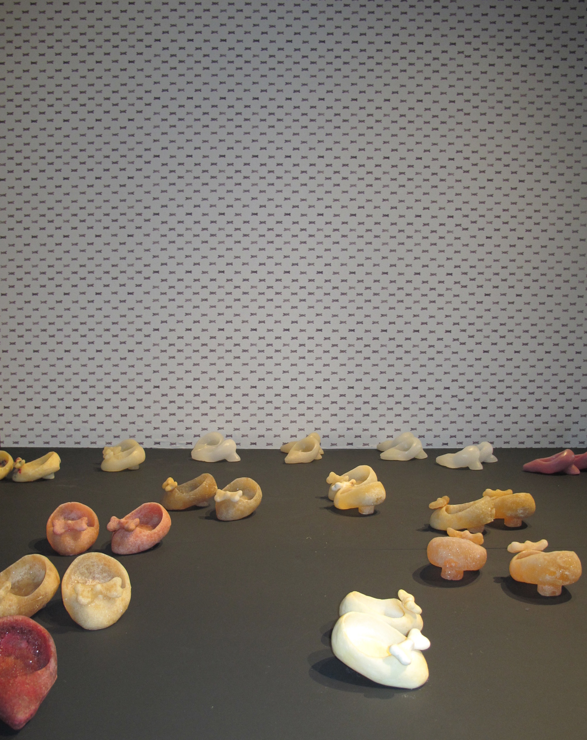 Installation, 67 paires de chaussures, cire, chocolat, sucre, paraffine, papier peint