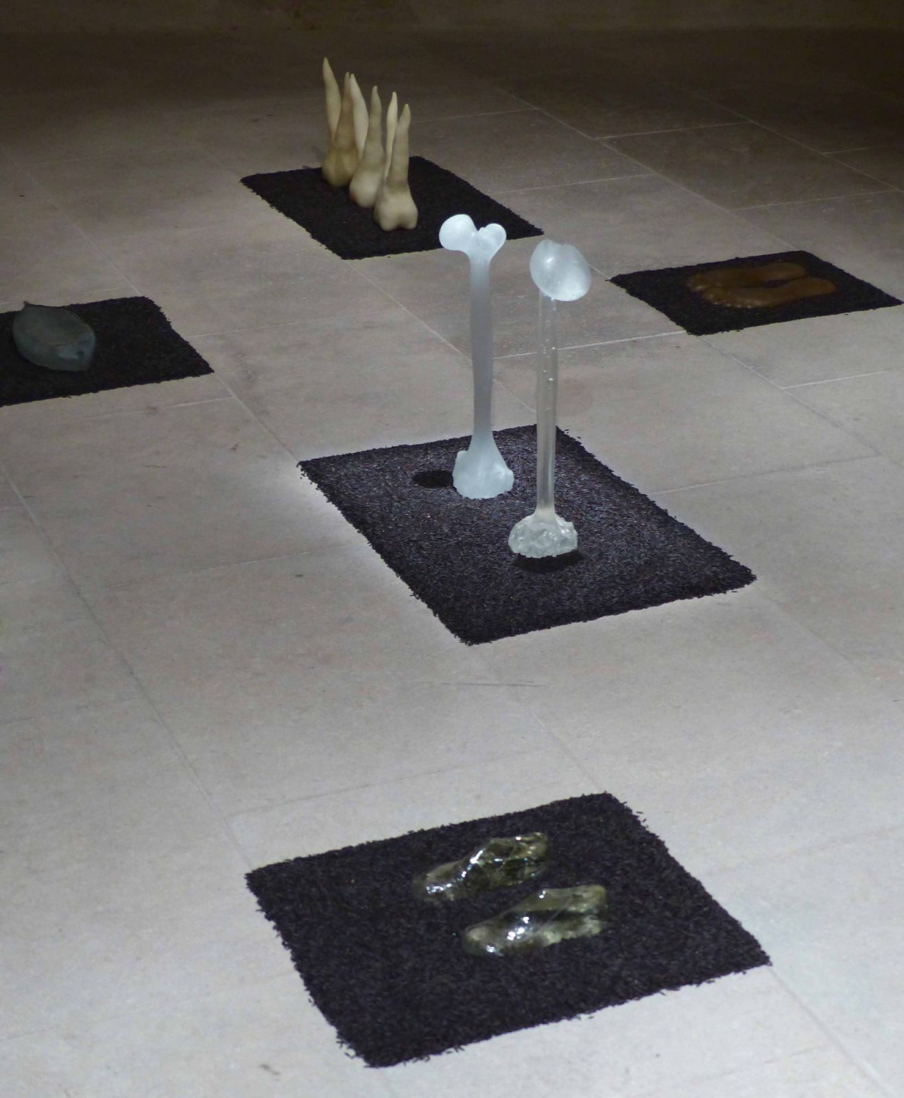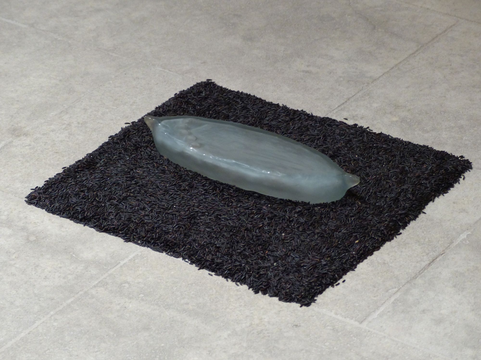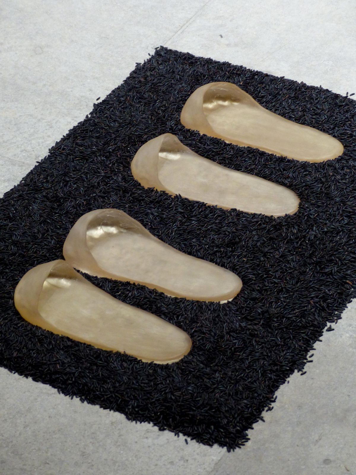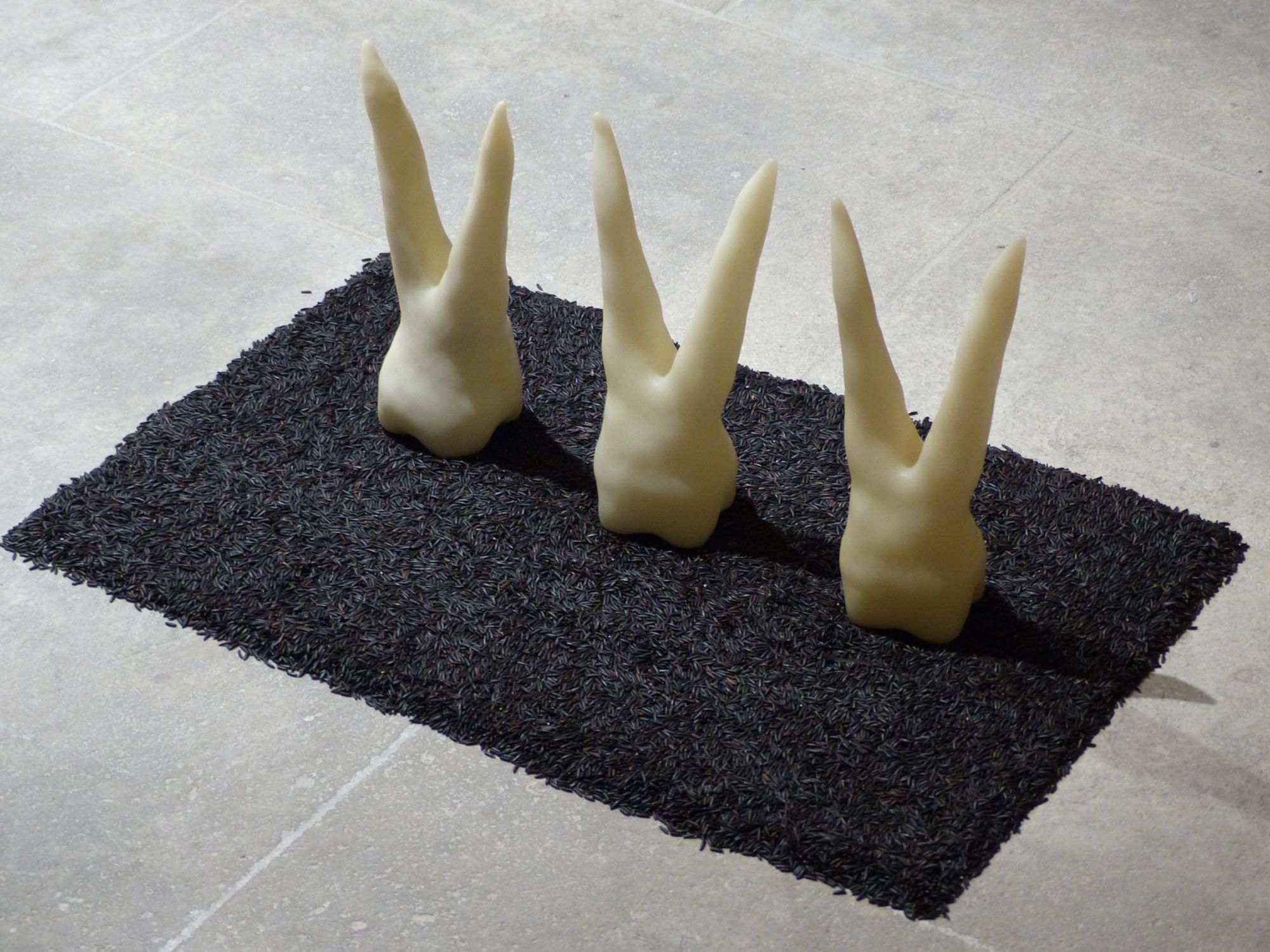 Installation des sculpures/objets sur lit de riz de Camargue.