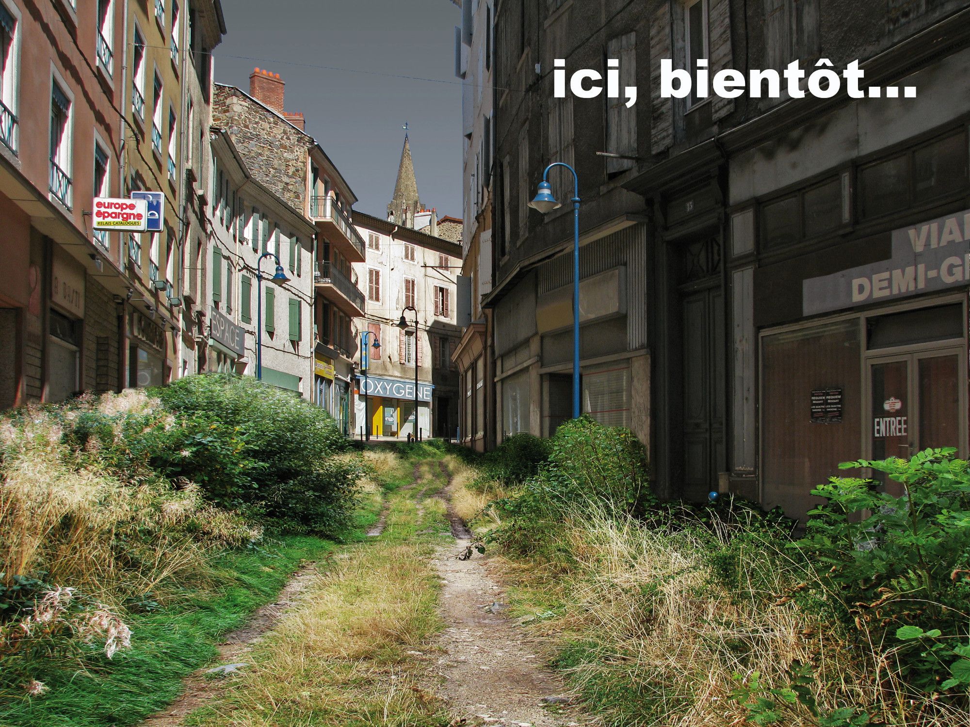 L’annonce "ici, bientôt...", inscrite sur tous les panneaux, indique un possible... c’est possible que cela arrive... mais ce n’est qu’une image. Un révélateur de possibilité qui vient légender la grande escroquerie de ces représentations et nous interroger sur le rapport que l’on soutient avec la réalité. Ce n’est pas encore une fiction, juste une prédiction, quelque chose de visionnaire dans "le vivre ensemble".