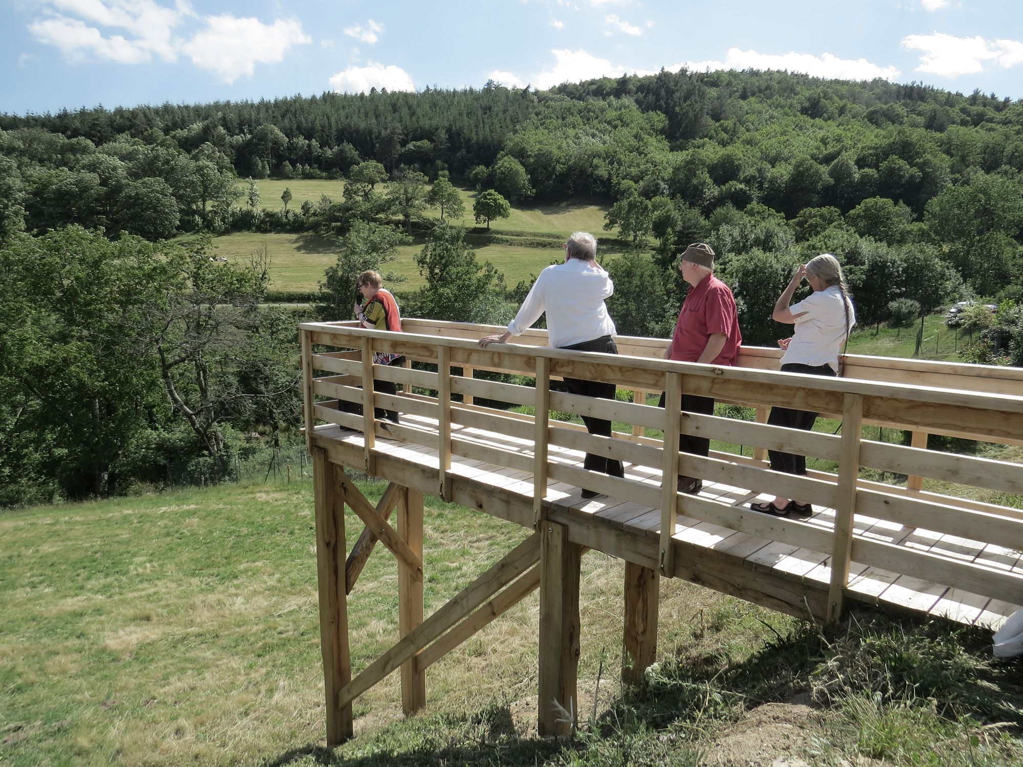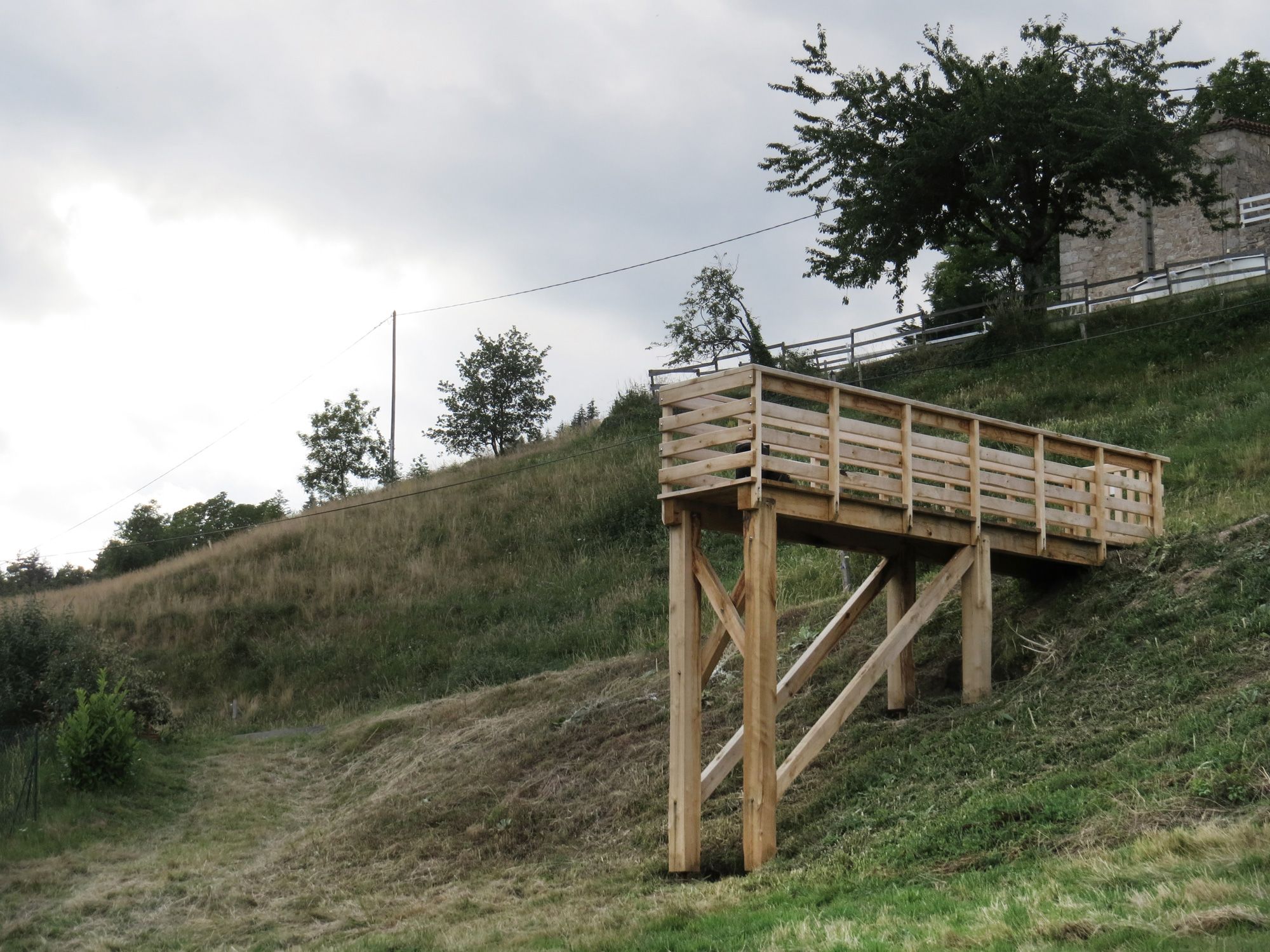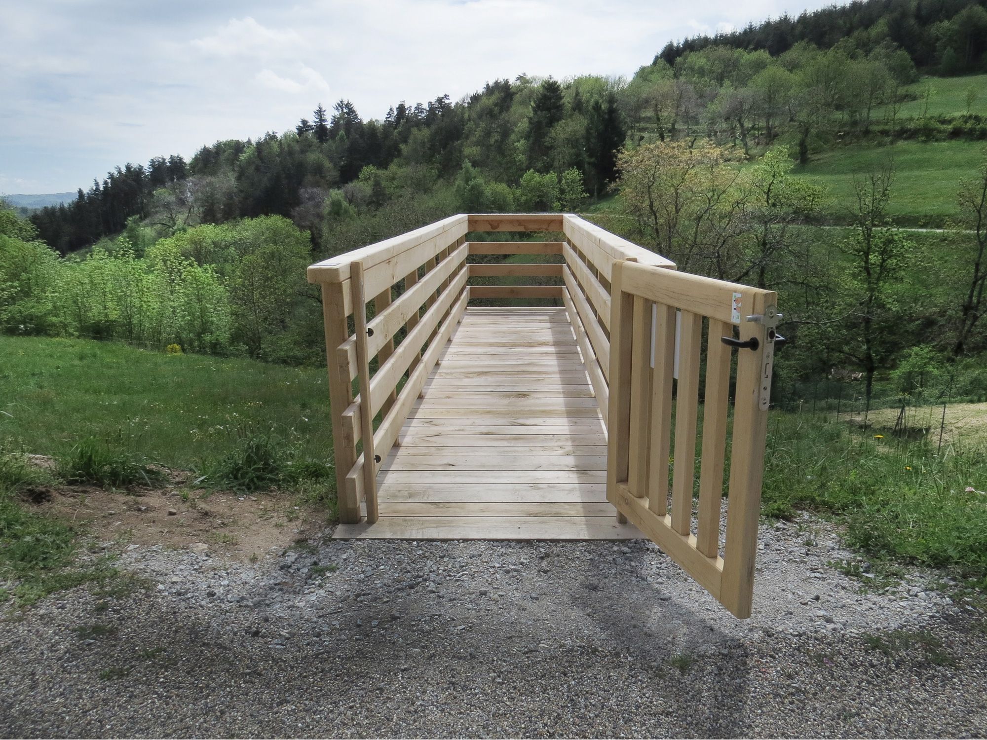 Un ponton en bois, type embarcadère balnéaire, domine le paysage à 660 mètres d'altitude, au pied du hameau de Saint-Apollinaire-de-Rias. La charpente est posée sur le bas-côté de la route qui mène au village. Étroit dans sa largeur pour ne laisser circuler qu'une personne, la longueur de l'ouvrage est de 8 mètres. L'appareillage est en bois de châtaignier local.