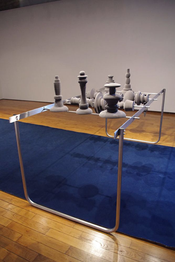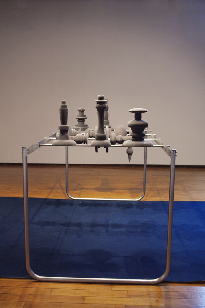 fixées, m’ont été inspirés par un compromis de souvenirs de mobilier de camping, de baby-foot pour enfant, de boulier, de broche à poulet et à kebab. Les formes en topan ont cela de commun qu’elles sont toutes abstraites, et toutes évocatrices d’objets connus, sans pour autant que le regardeur ou moi-même puissions affirmer précisément de quel objet chacune se rapproche. Je désire que les formes nous semblent familières sans être identifiables.
