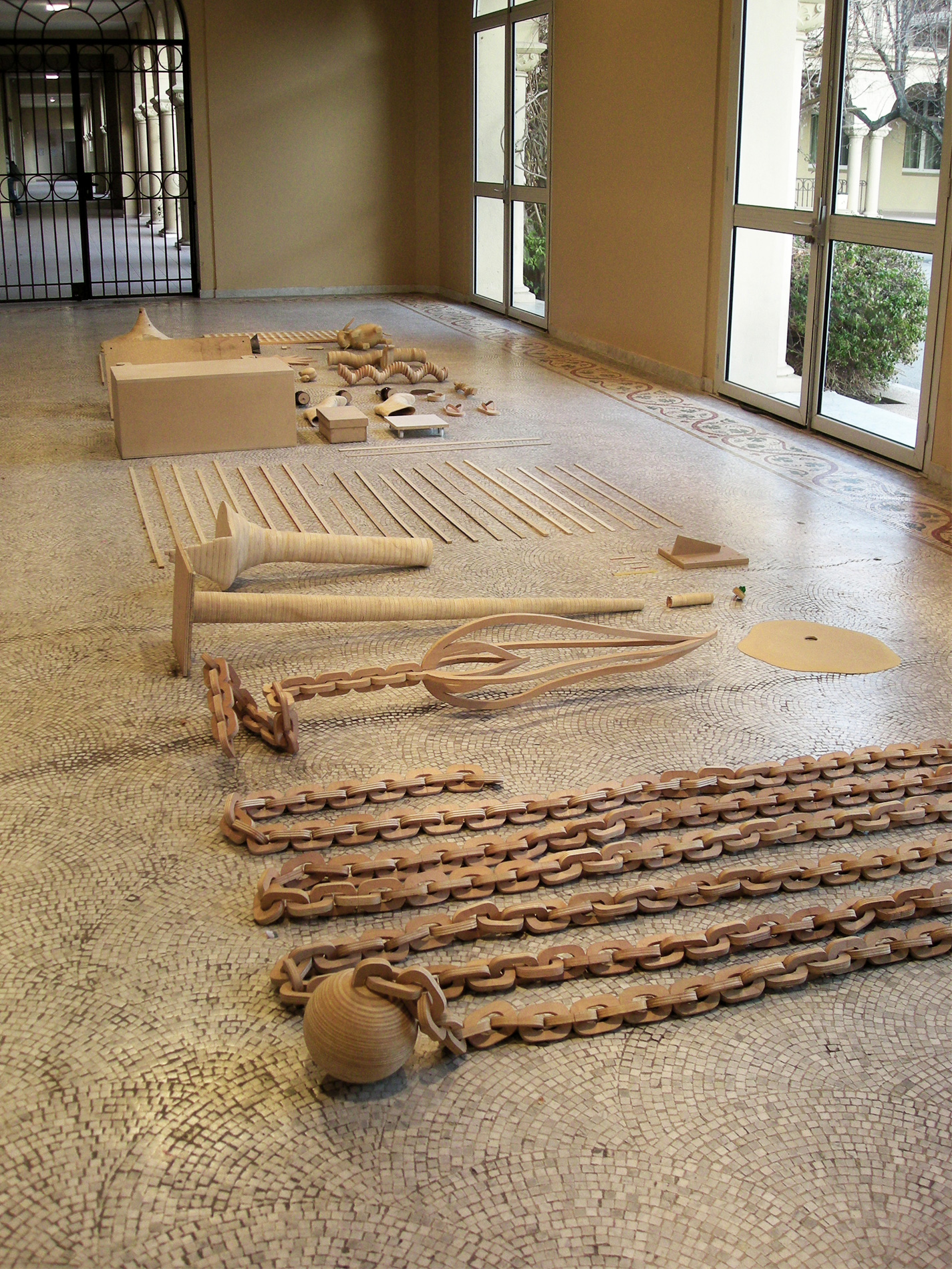Pour Le cimetière des éléphants ou Les oiseaux se cachent pour mourir, j'ai choisi des sculptures datées de 2005 à 2007, presque jamais montrées, conservées partiellement ou dans leur intégralité. Ces sculptures seront présentées en pièces détachées, sur le sol de l'espace d'exposition, formant ainsi une nouvelle œuvre composée de tout un tas d'éléments disparates.