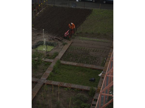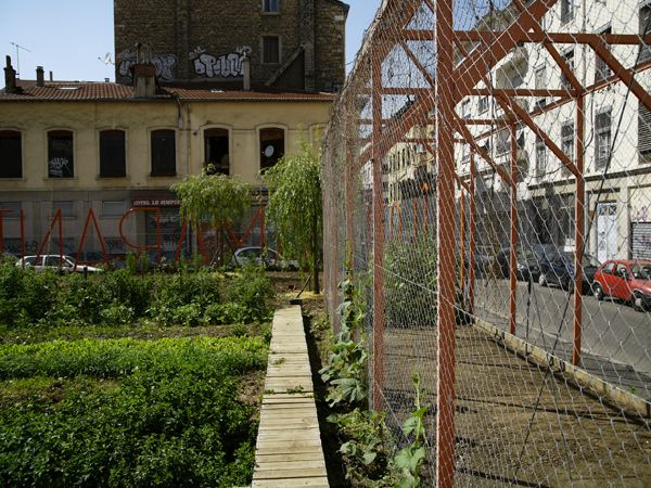 Un jardin partagé vient se joindre à la serre. La zone d'intervention est étendue : des lopins de terre sont délimités par des passerelles et attribués à quelques riverains qui se retrouvent pour jardiner ensemble.