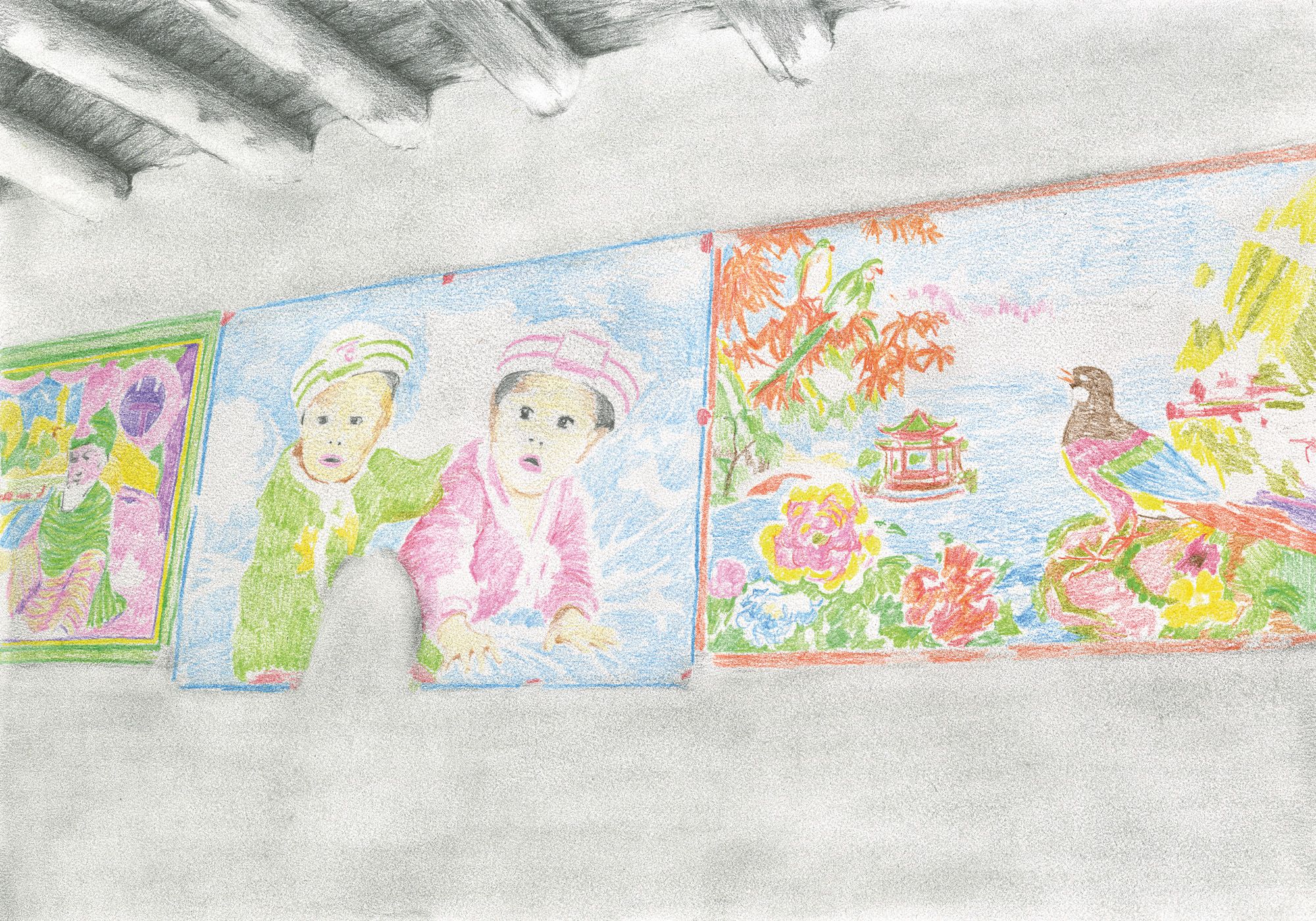 13 dessins, crayon et crayon de couleur sur papier, 29,7 x 42 cm