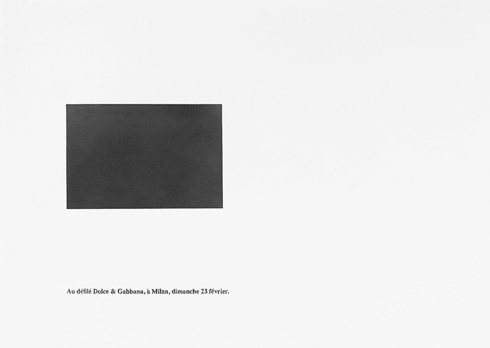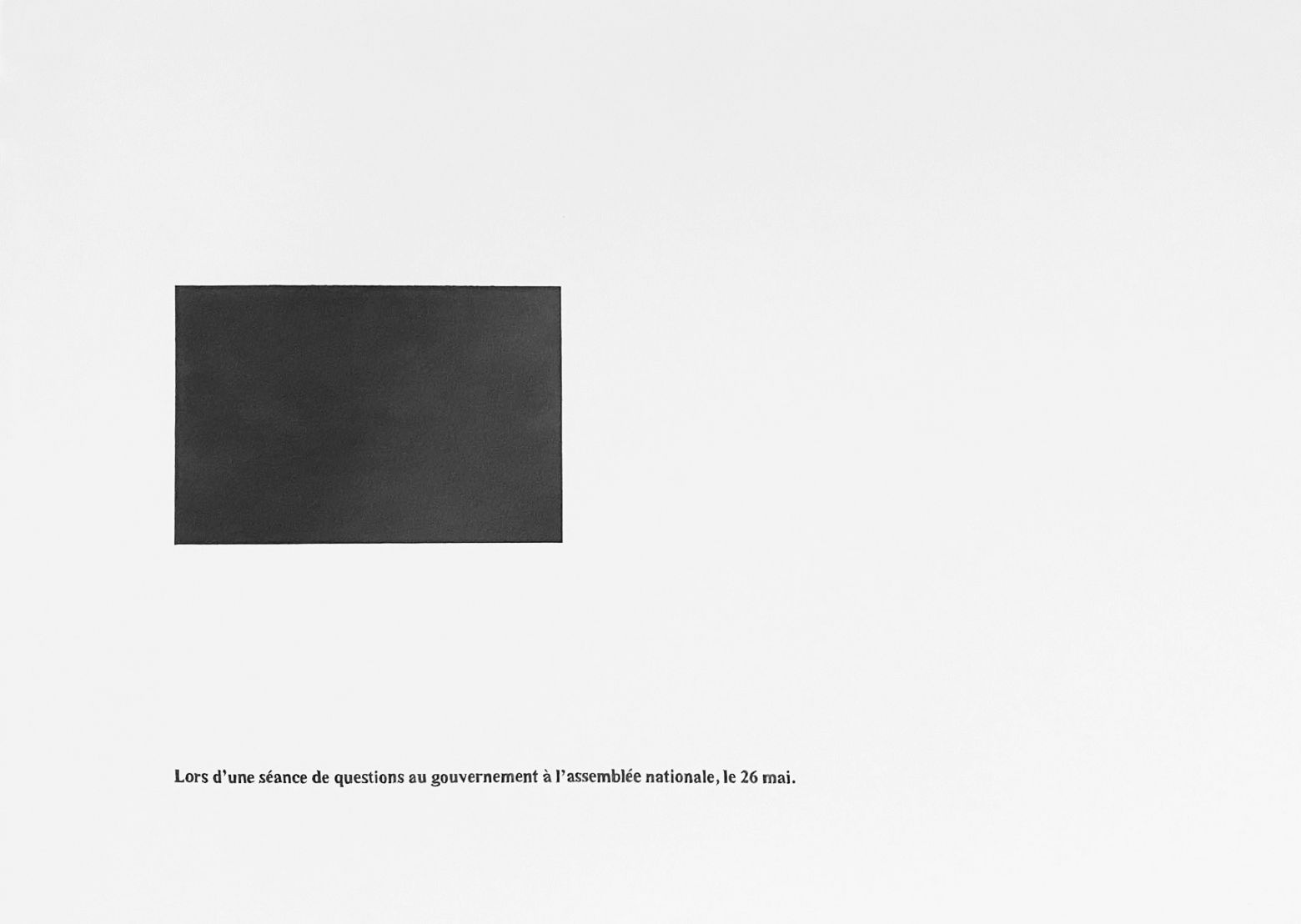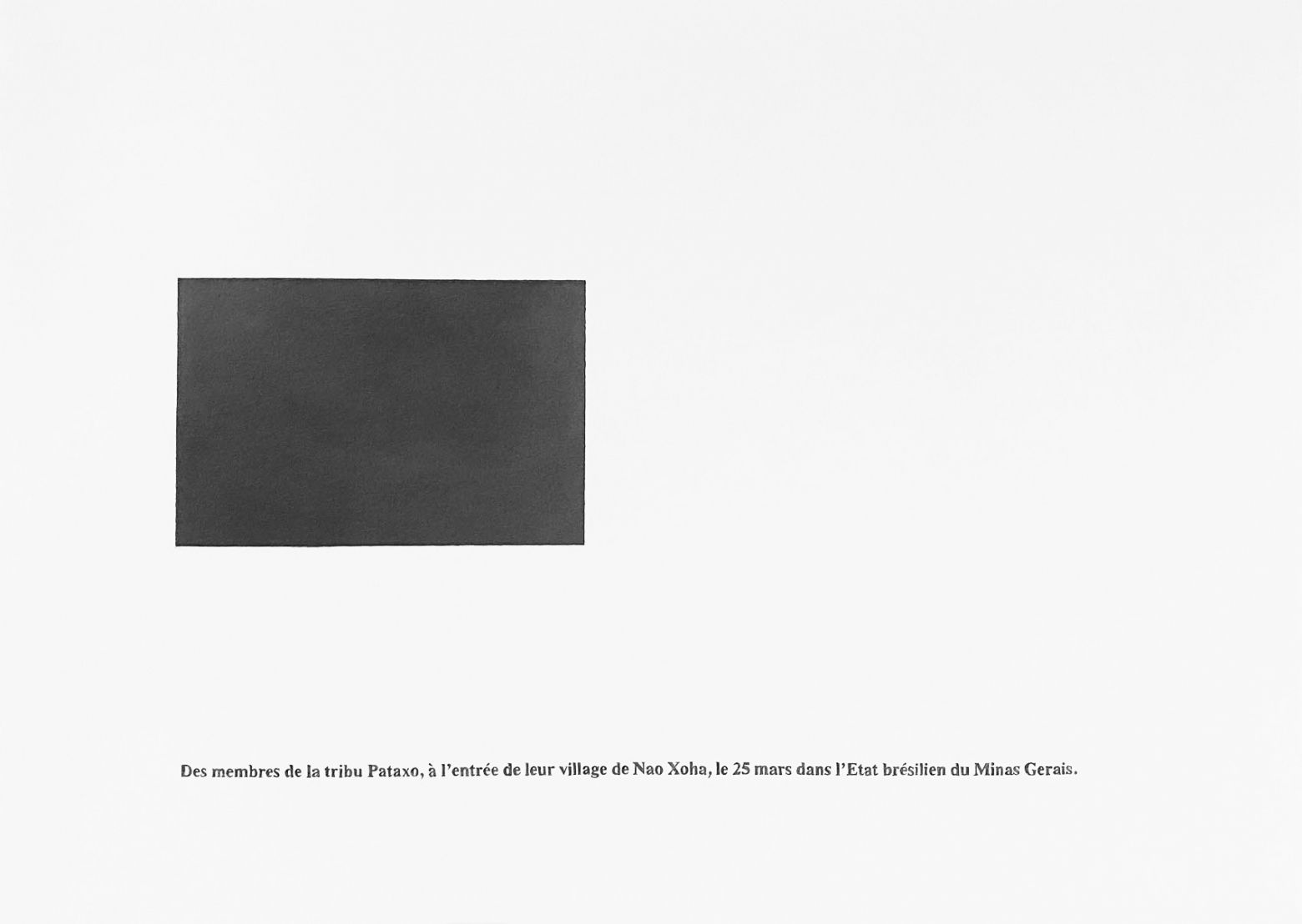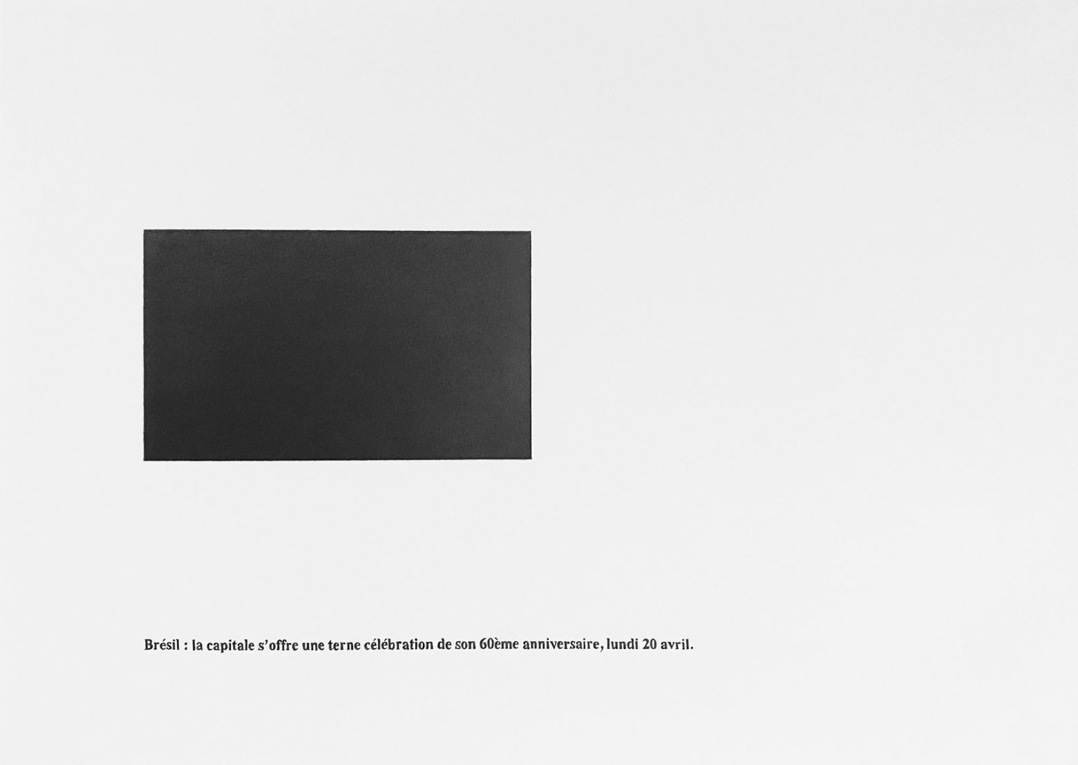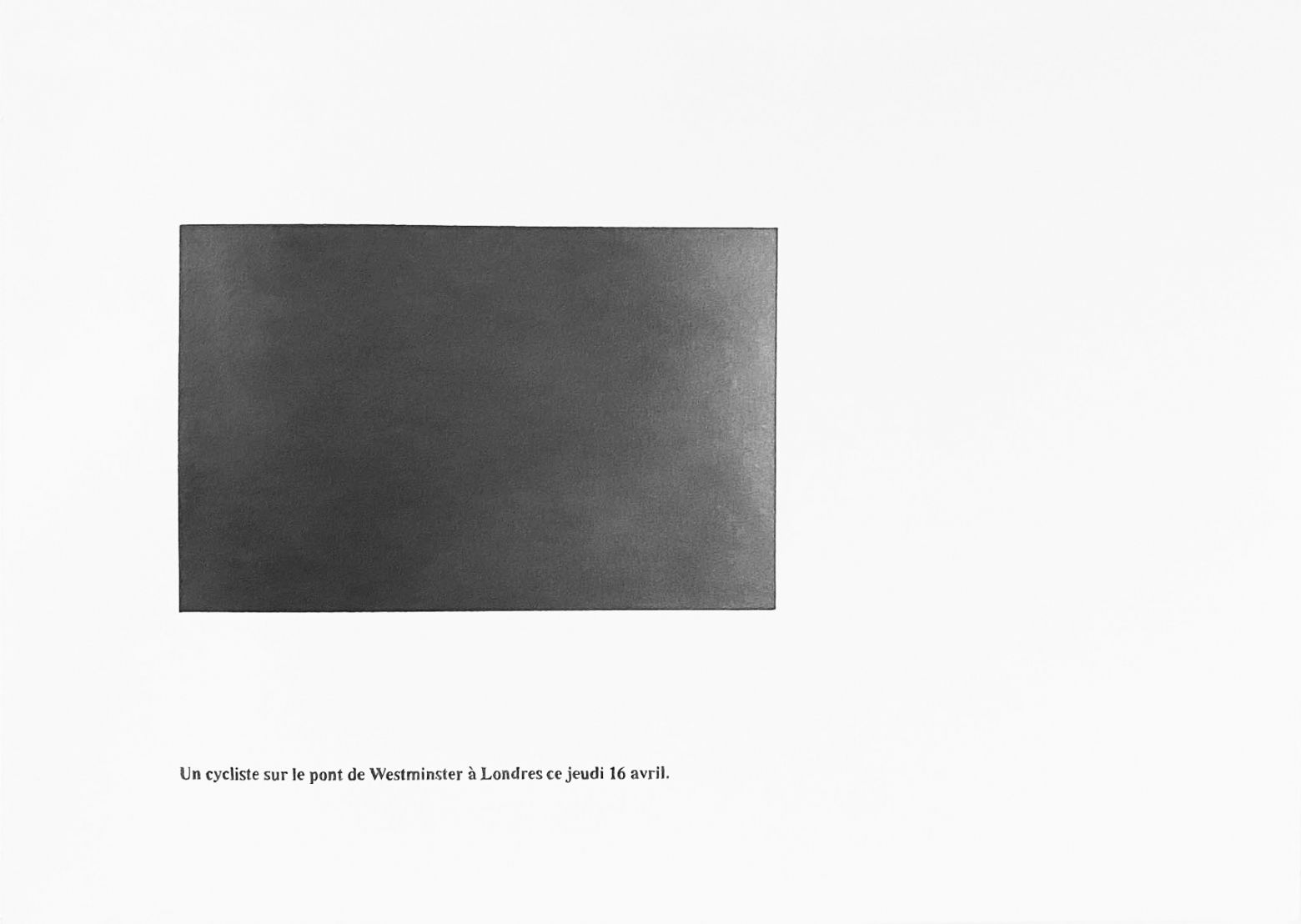 Ordinairement marginale dans l’ensemble des informations présentes sur les pages d’un journal, la légende est ici la seule rescapée du déplacement opéré entre l’espace médiatique et celui du dessin. Le texte de l’article a disparu, laissant la page redevenir un simple support, et il ne subsiste de l’image que son espace rectangulaire.
