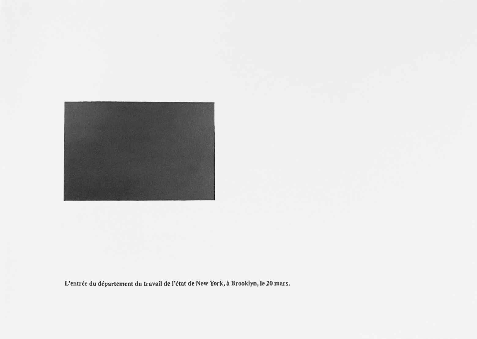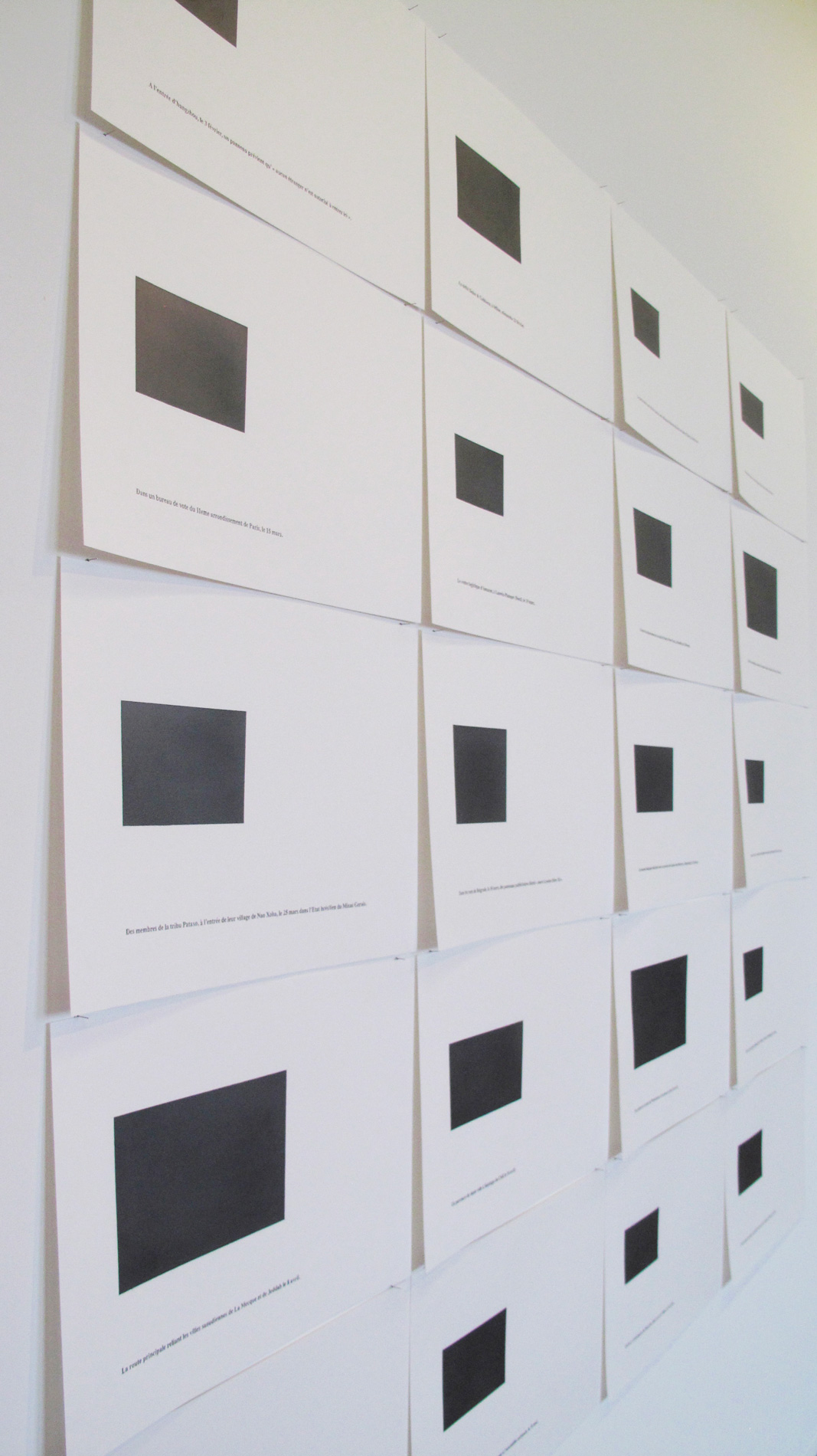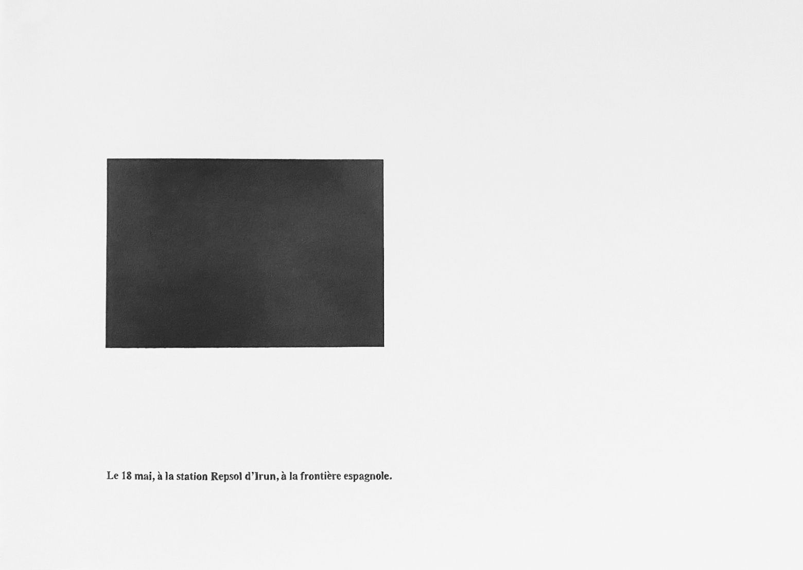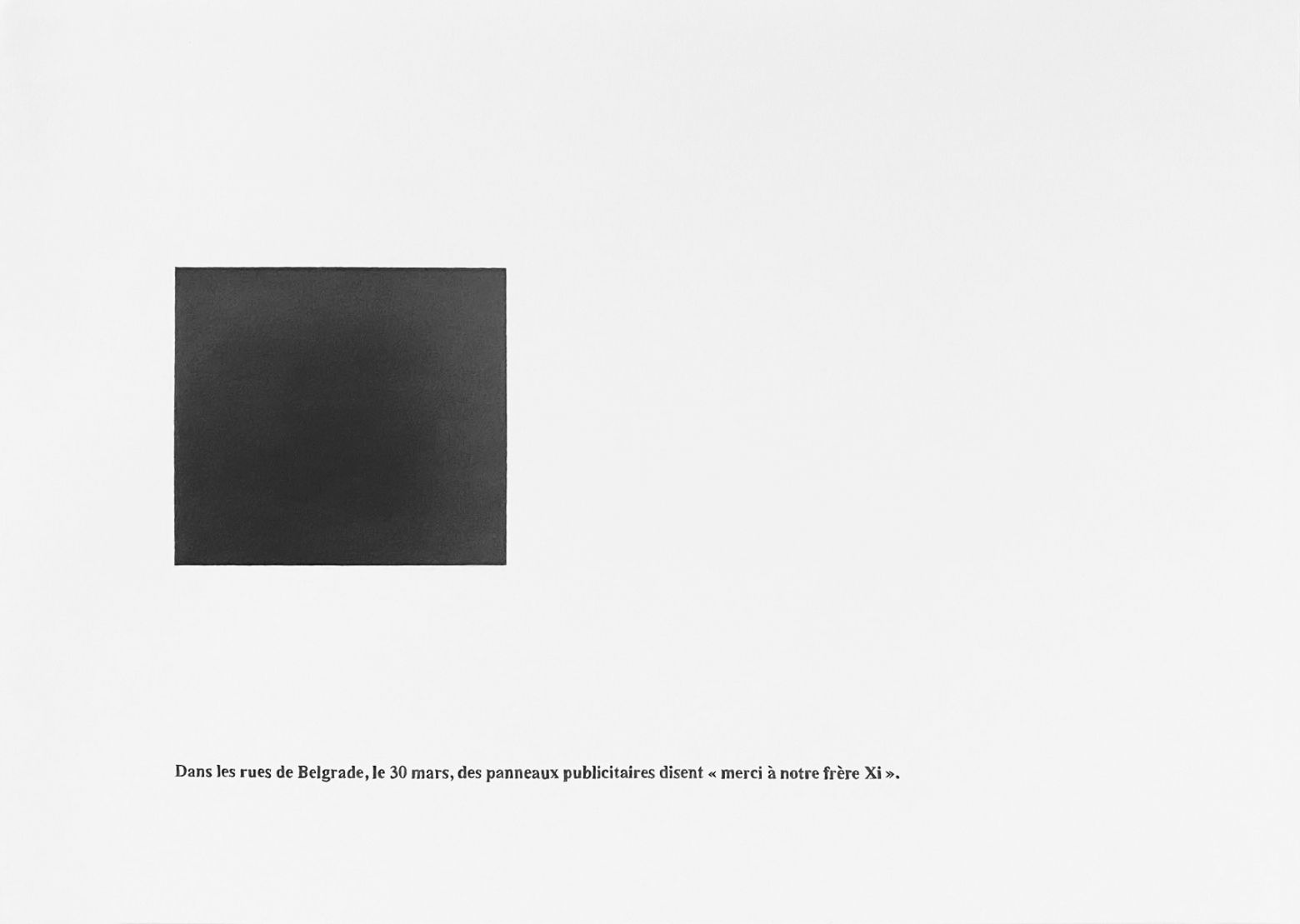 Ordinairement marginale dans l’ensemble des informations présentes sur les pages d’un journal, la légende est ici la seule rescapée du déplacement opéré entre l’espace médiatique et celui du dessin. Le texte de l’article a disparu, laissant la page redevenir un simple support, et il ne subsiste de l’image que son espace rectangulaire.