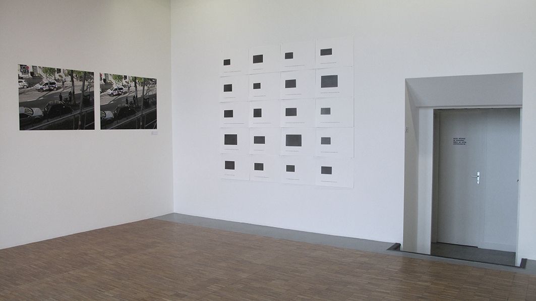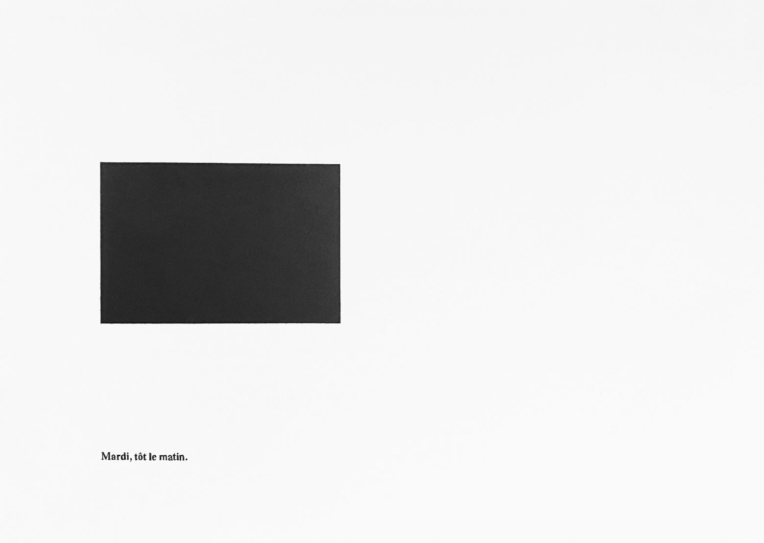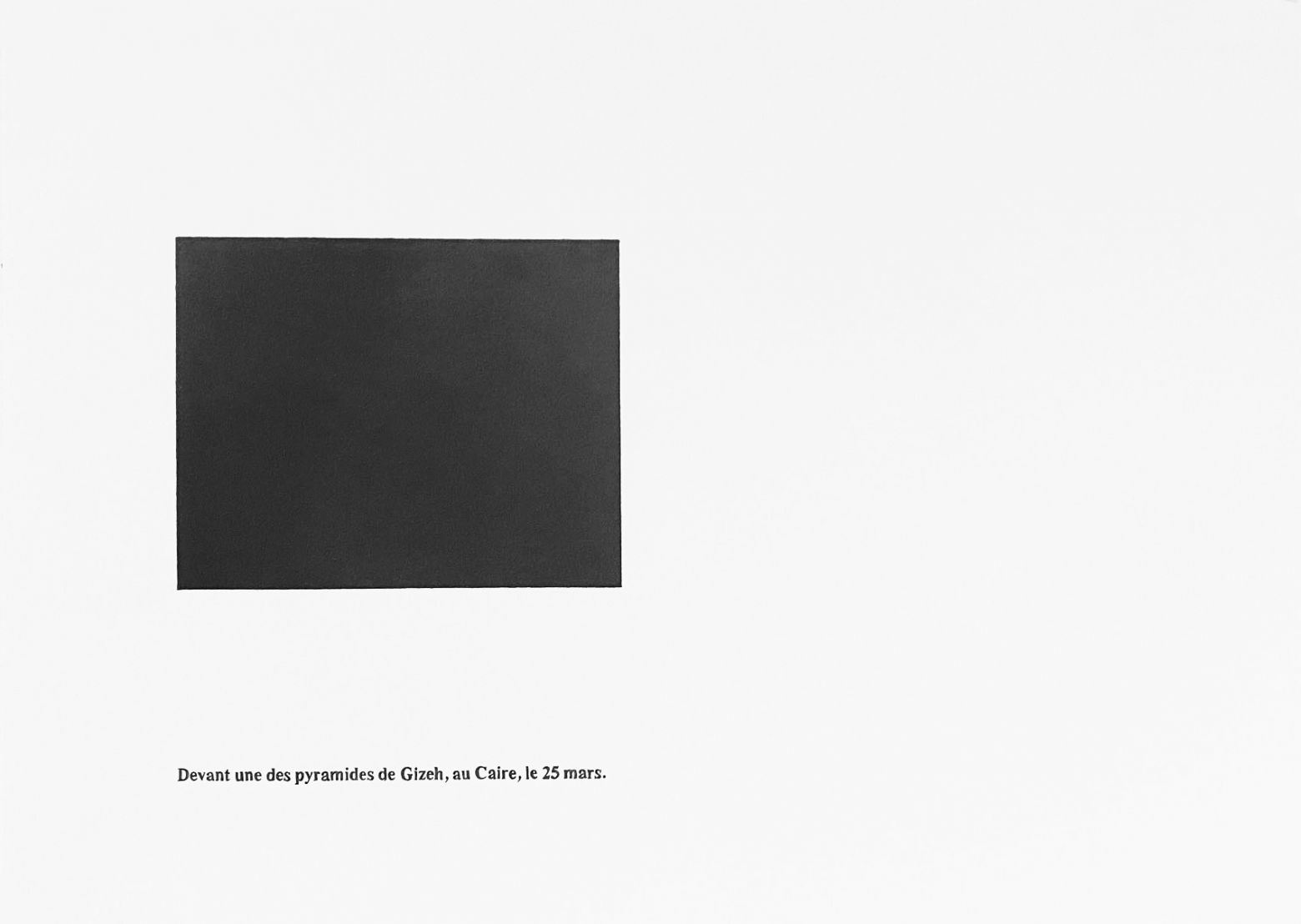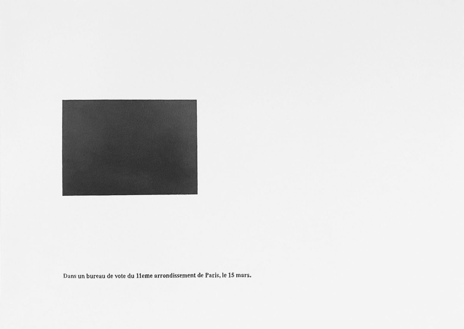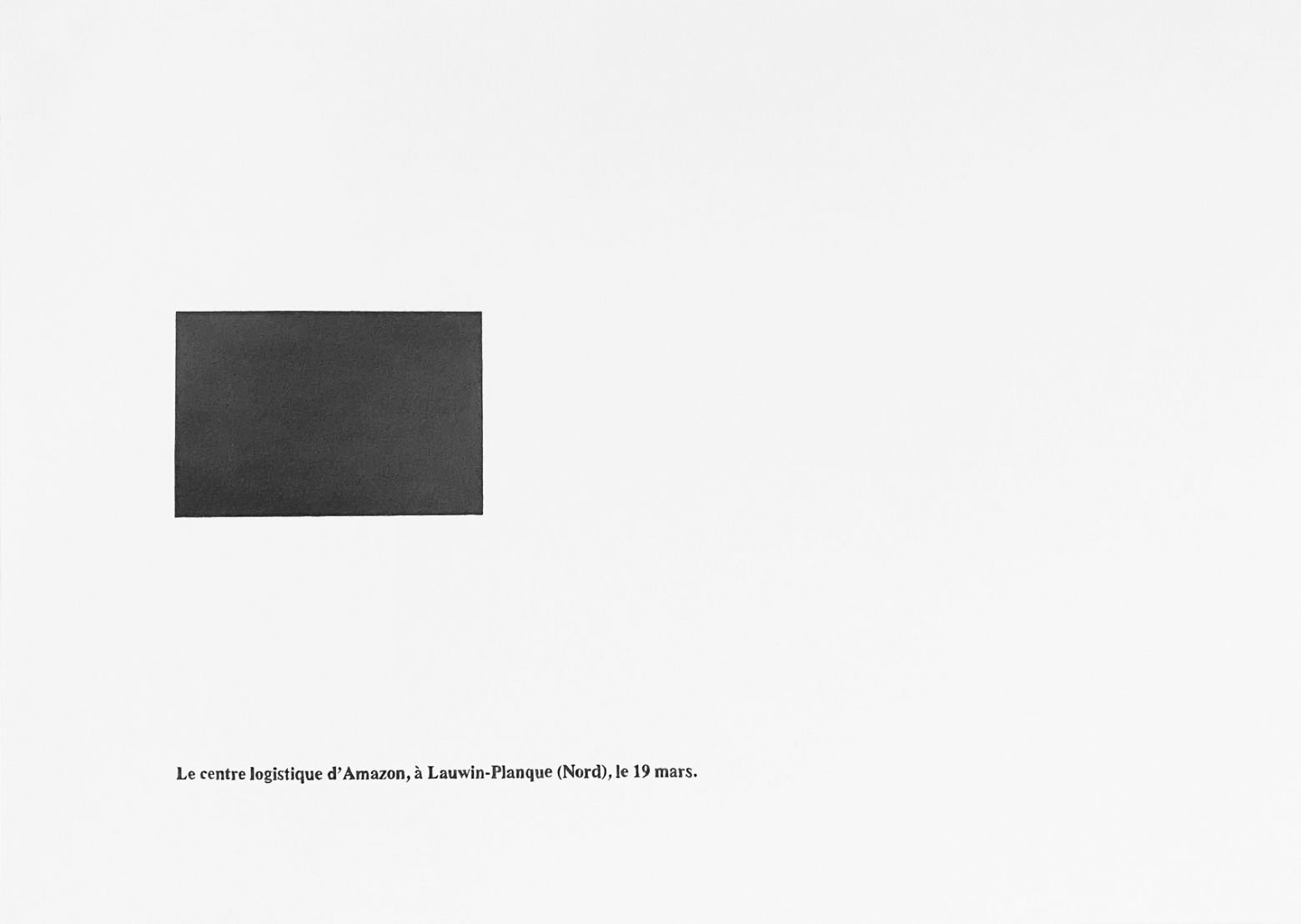 Ordinairement marginale dans l’ensemble des informations présentes sur les pages d’un journal, la légende est ici la seule rescapée du déplacement opéré entre l’espace médiatique et celui du dessin. Le texte de l’article a disparu, laissant la page redevenir un simple support, et il ne subsiste de l’image que son espace rectangulaire.