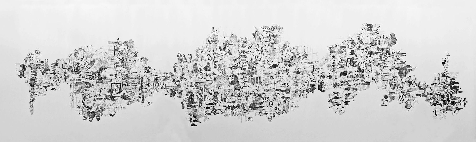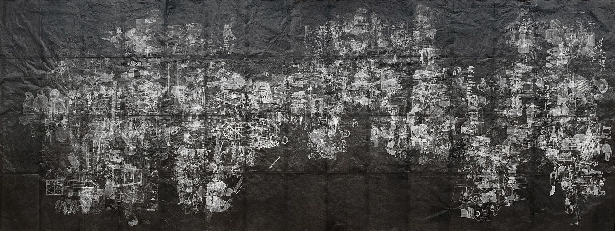 Dessin carbone sur papier blanc, 500 x 150 cm