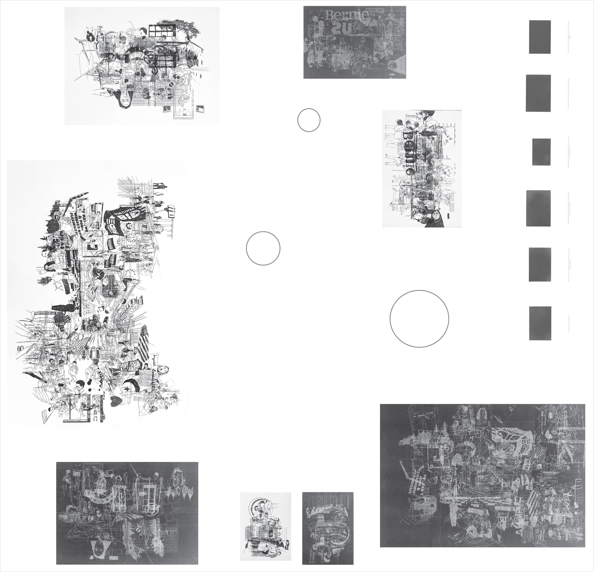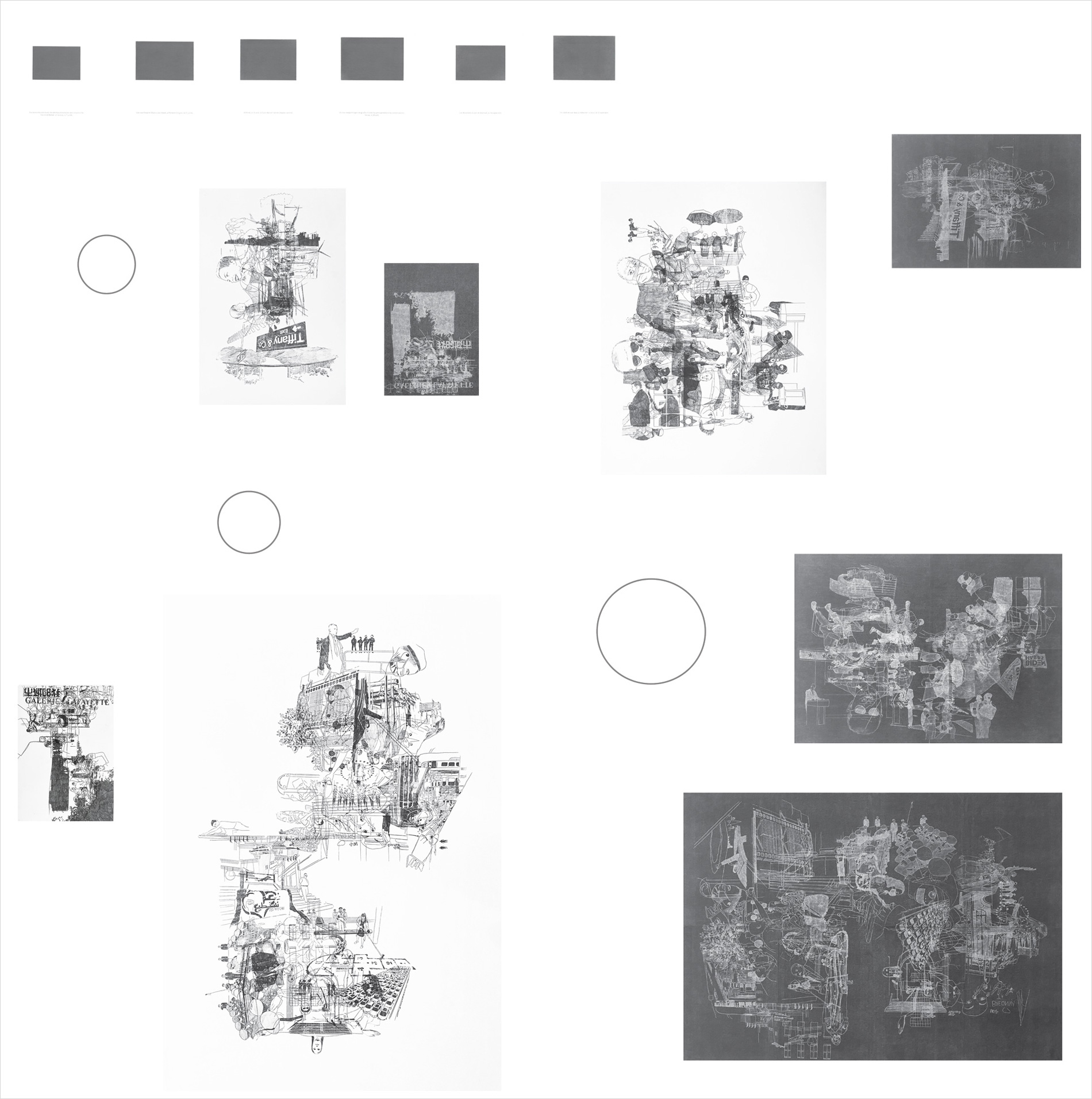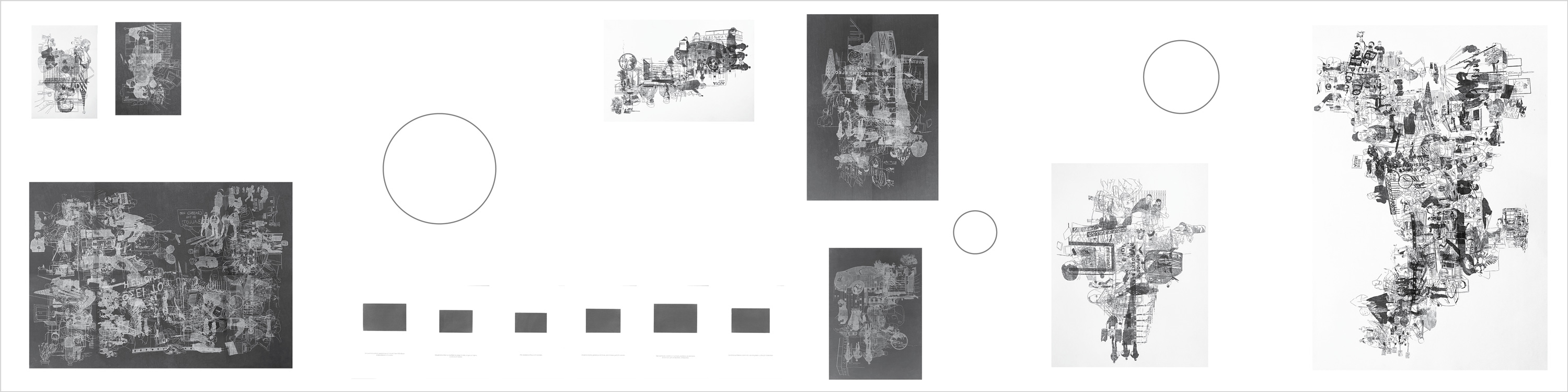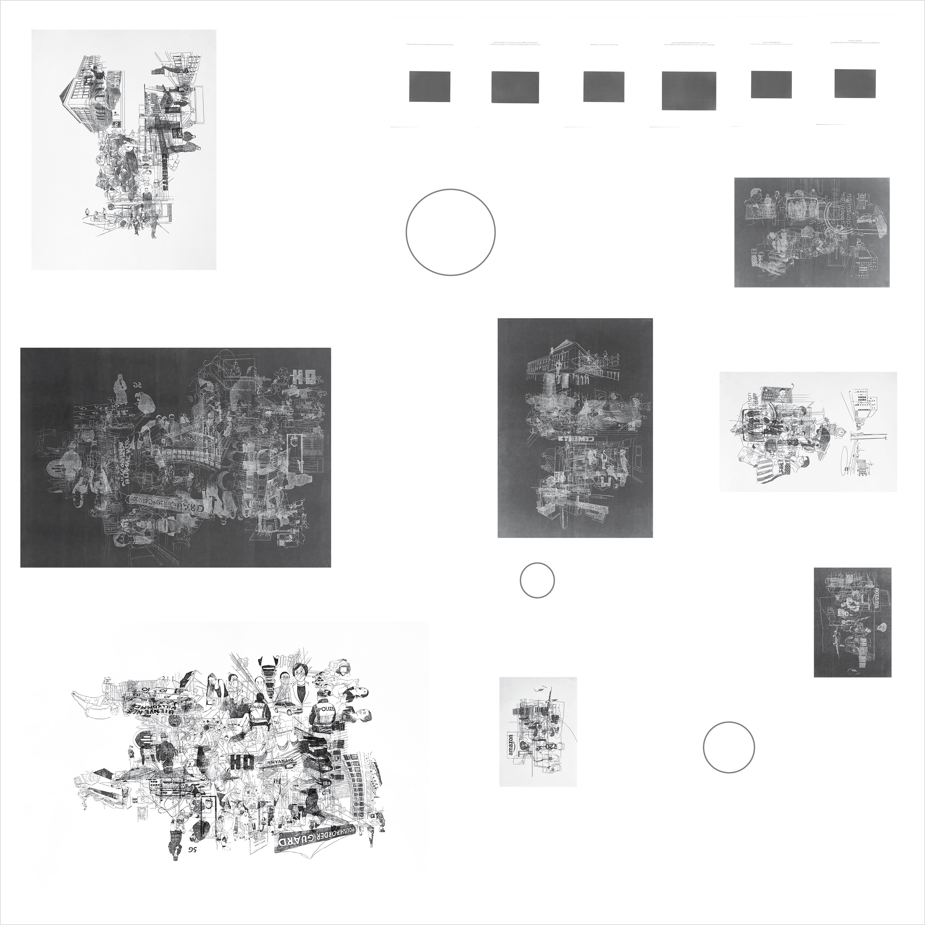 16 dessins au carbone sur papier, 16 dessins sur papier carbone, 48 dessins poudre de graphite sur papier, 14 sphères en papier journal, dimensions variables