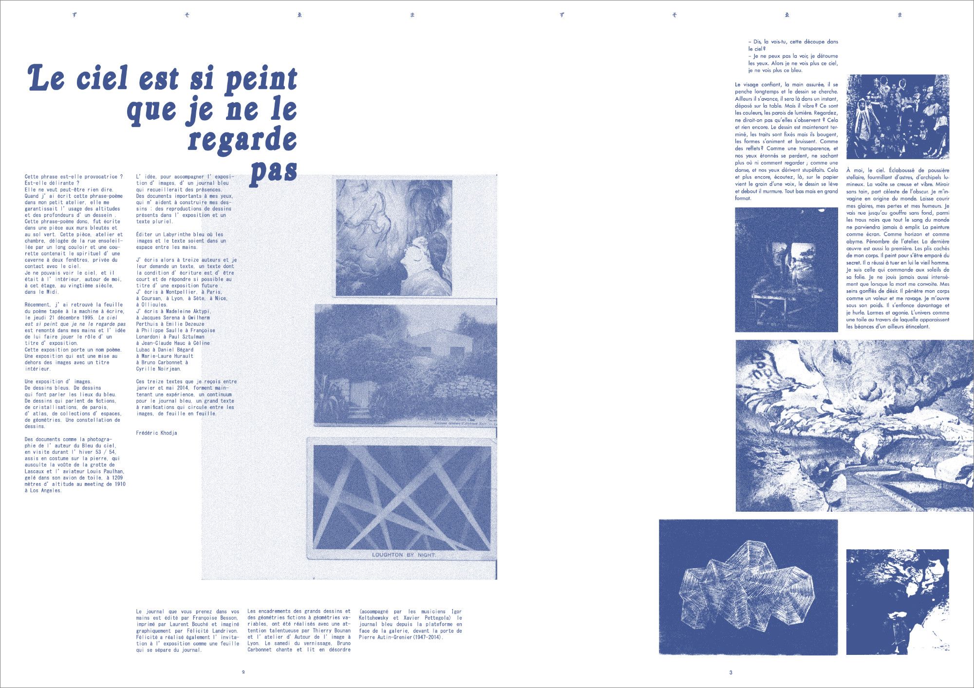 L'idée, pour accompagner l'exposition d'images, d'un journal bleu qui recueillerait des présences. Des documents importants à mes yeux, qui m'aident à construire mes dessins ; des reproductions de dessins présents dans l'exposition et un texte pluriel.