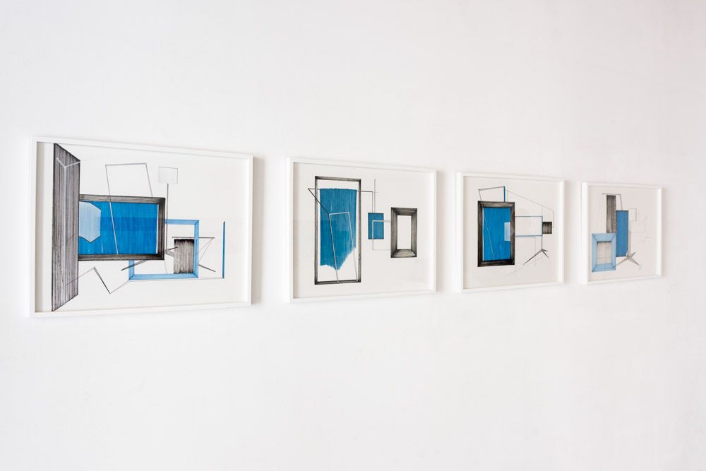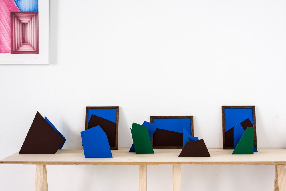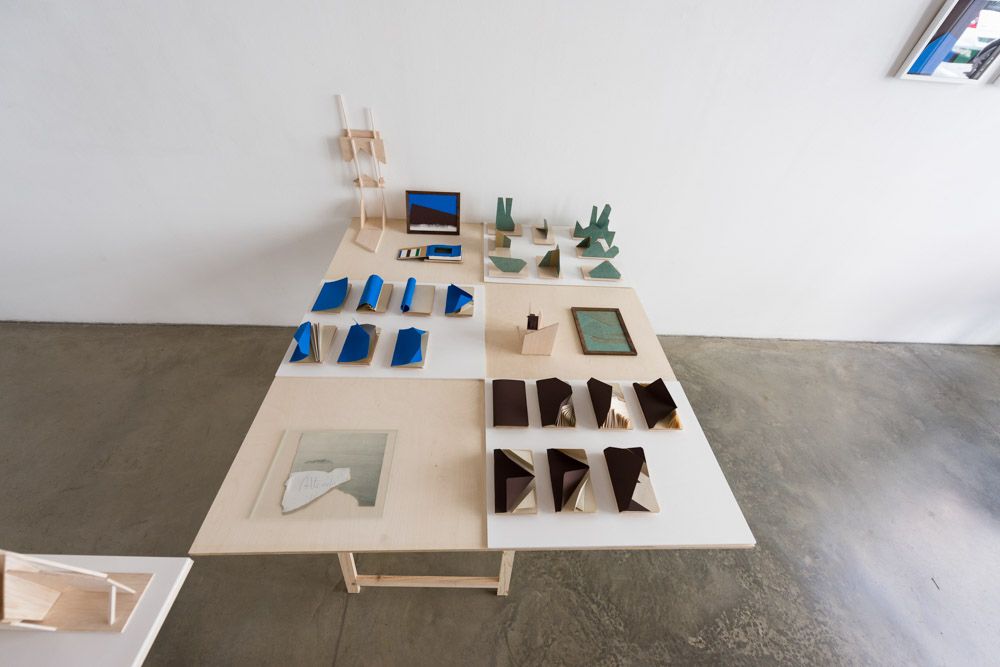 Volumes, peinture vinylique bleu manganèse et plis sur carnets et socles en bois balsa, 10 x 17 cm chaque