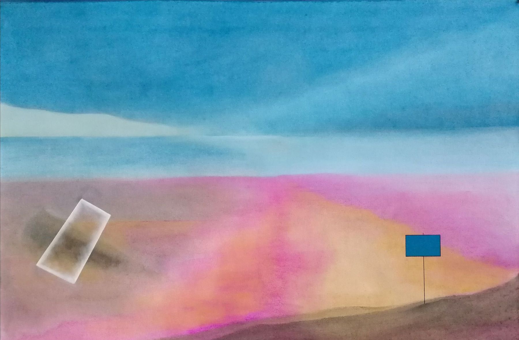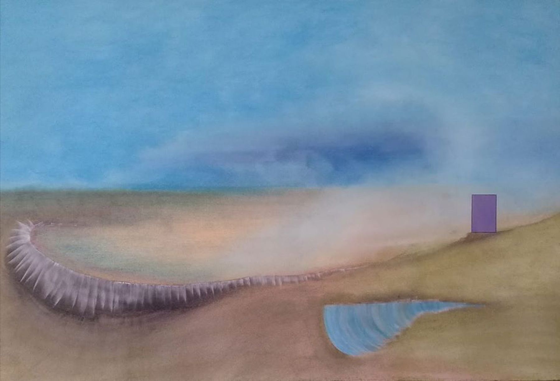 « C'est le pastel que Frédéric Khodja a choisi pour construire cette suite de paysages qui provoquent immédiatement la sensation d'un déplacement dans des poudroiements colorés. Pourtant, de simples indications spatiales de proche et de lointain, de ciel et de terre, constituent ces paysages. Parfois des masses viennent structurer la scène : une chute d'eau, une falaise, un squelette géant...