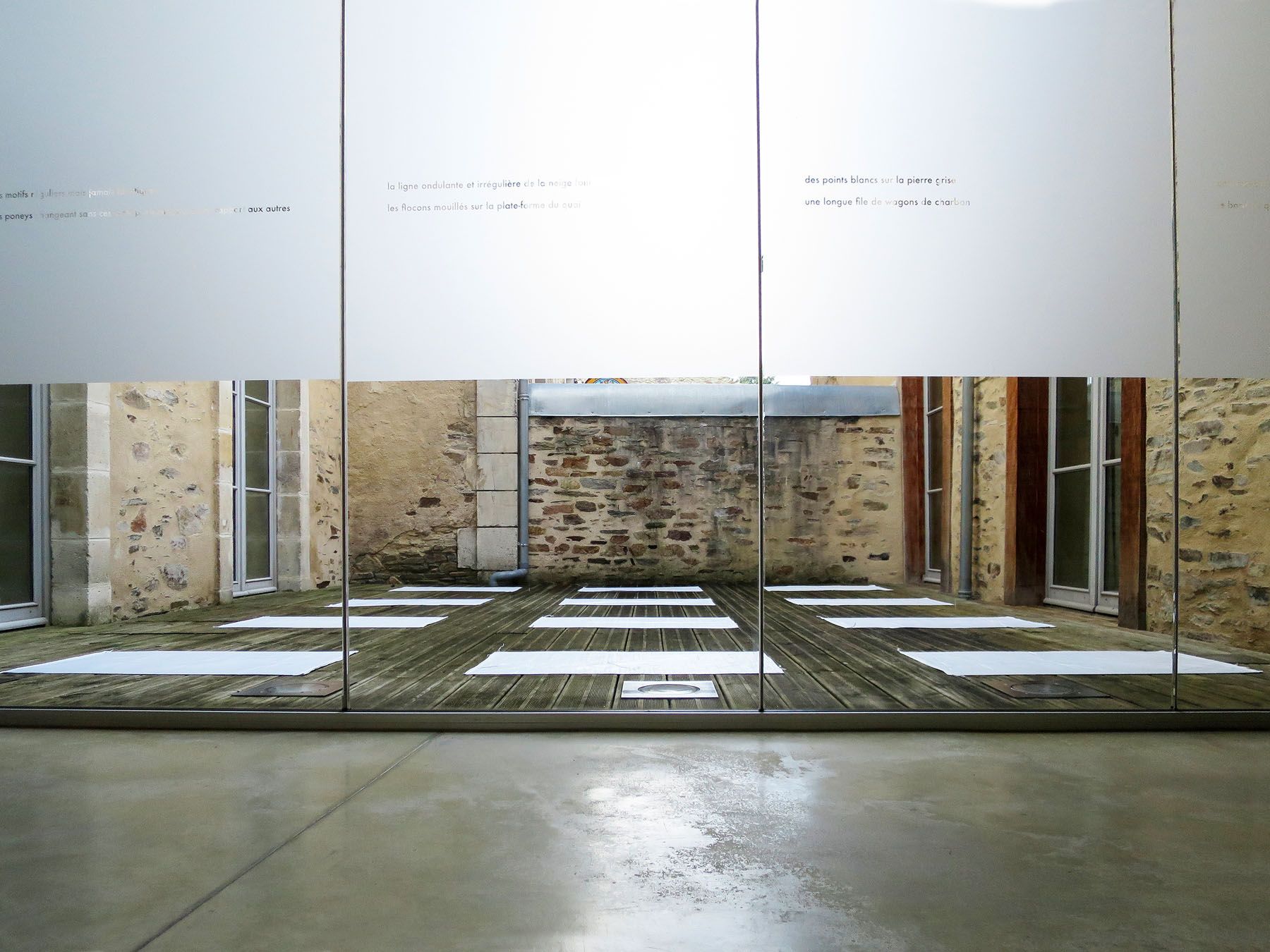 « Guillaume Perez développe un travail de peinture dans lequel une place importante est donnée aux matériaux, ainsi qu’aux questions de rythmes et d’espace. Qu’ils soient trouvés ou achetés et utilisés tels quels, les supports qu’il utilise sont choisis pour leurs qualités matérielles et picturales, aussi, l’artiste joue avec ces caractéristiques dans chacun des projets qu’il développe. Présentée dans la salle des conditions atmosphériques, Surface (blanc) répond à ces questionnements. En effet, l’artiste fait le choix de créer un damier sur le sol de cet espace que le spectateur ne peut traverser et/ou expérimenter physiquement à partir de bâches tressées blanches. Ou plutôt, supposées blanches. Ces dernières changent de couleurs et se chargent de l’espace environnant : par beau temps, ceux-ci se voilent d’un bleu léger, l’ocre des murs les jaunis, alors que la pluie et la proche végétation vont progressivement les verdir durant tout l’hiver. »