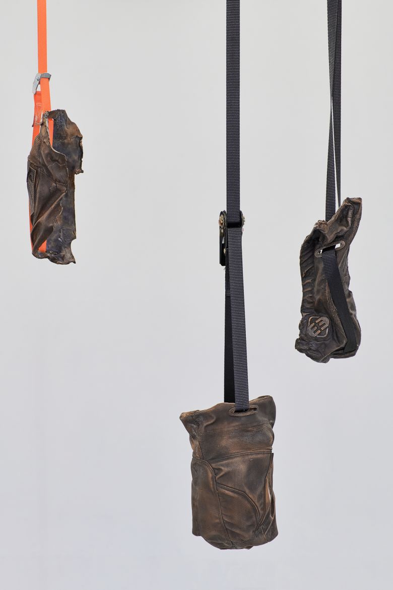 Pendant sa résidence à la Fonderia Artistica Battaglia, Julie Kieffer a réalisé 5 sculptures, à partir de vêtements techniques utilisés dans le motocross. Les sculptures en bronze et les cires colorées prennent l’empreinte de la trame du tissage et la forme d’articulations. Genoux, hanches et coudes sont les charnières du corps du pilote, celles qui prennent cher, qui amortissent les tensions du corps qui se contracte sur l’engin.
