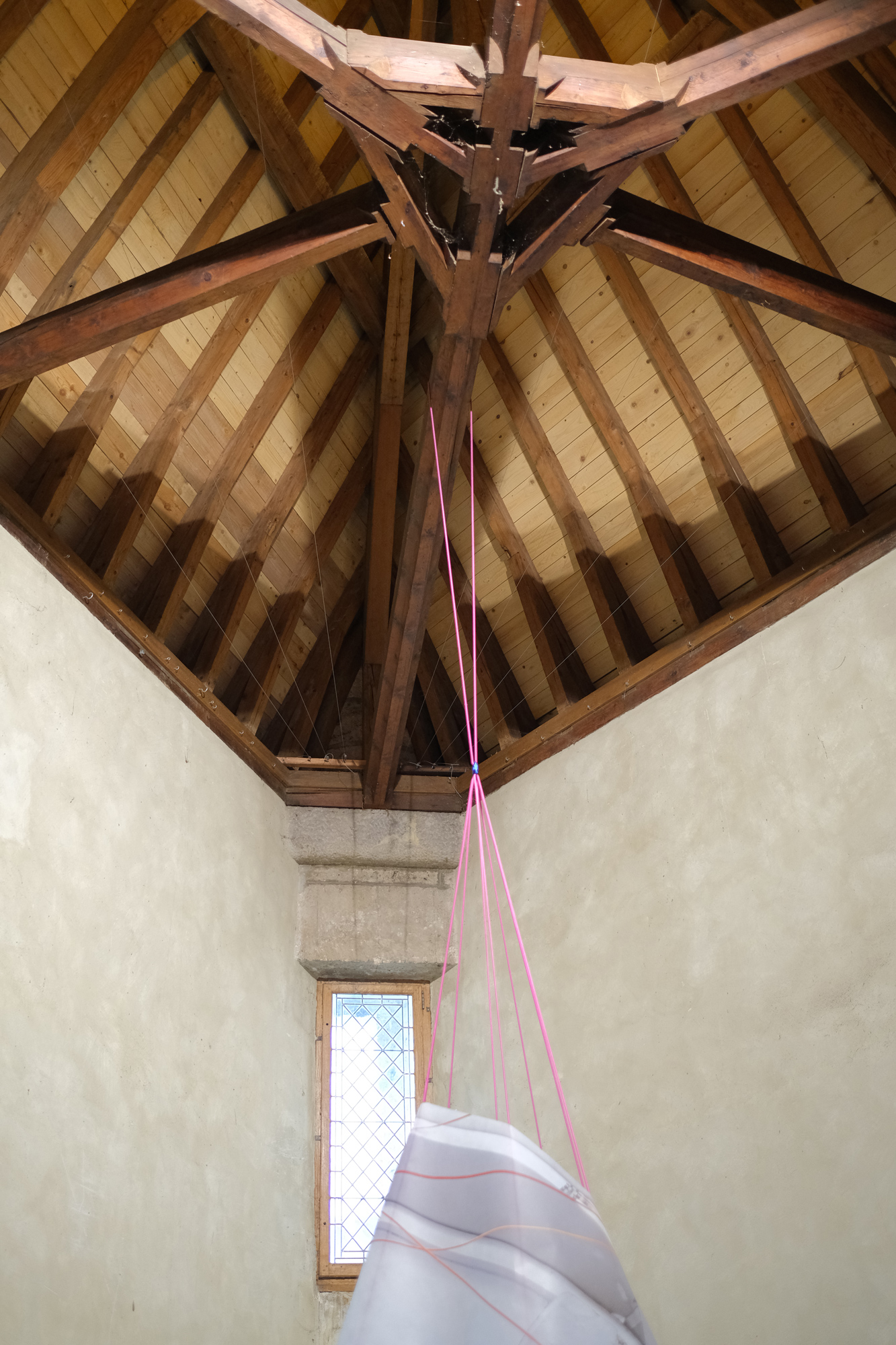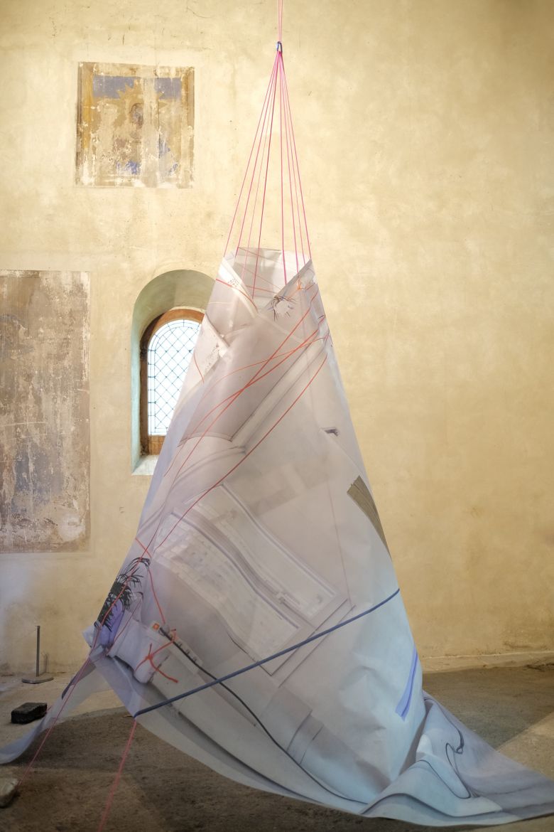 Impressions sur tissus, corde, mousquetons, faïence huilée, 800 x 600 x 600 cm