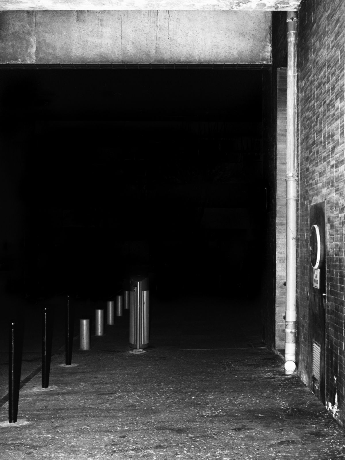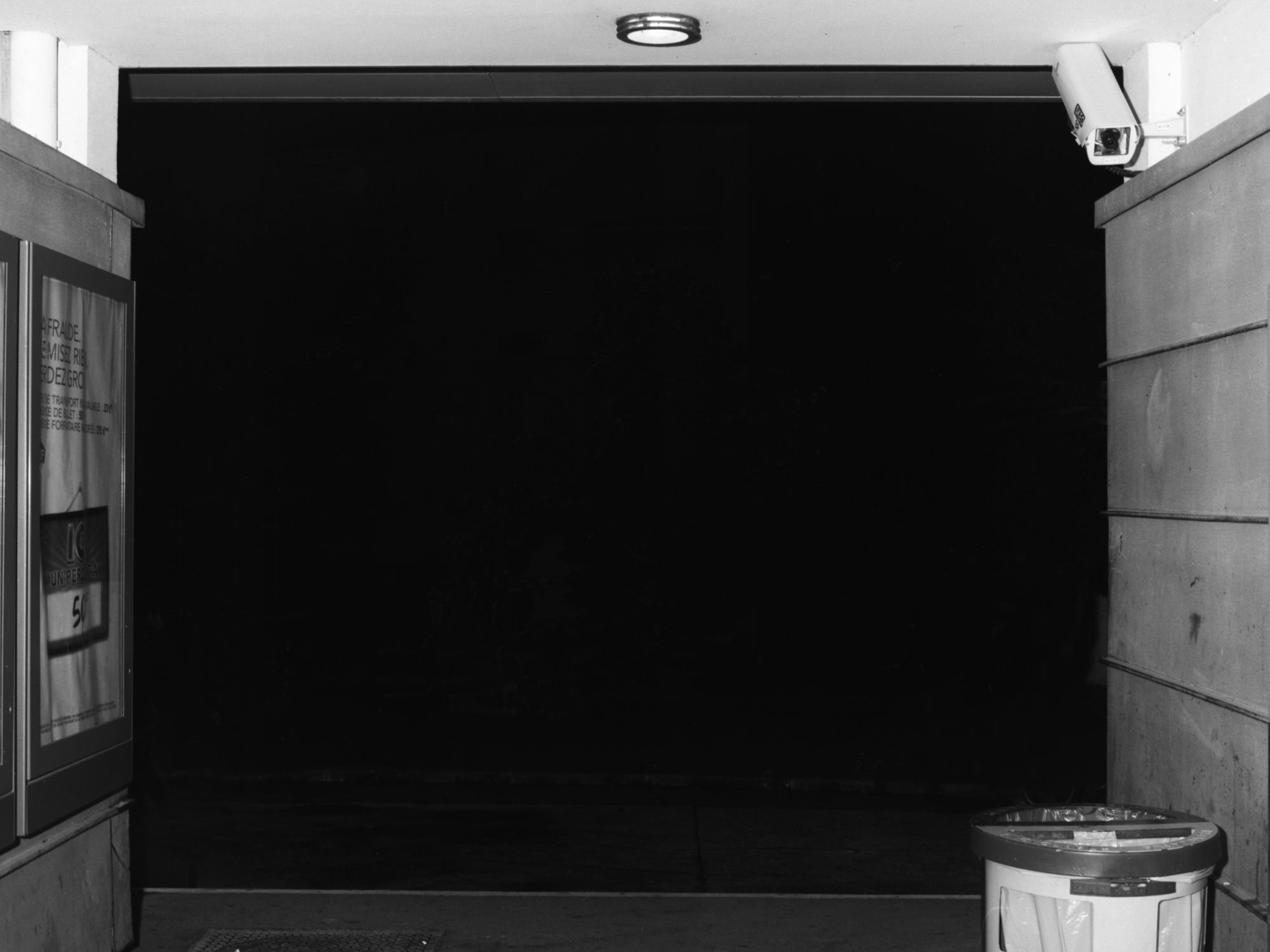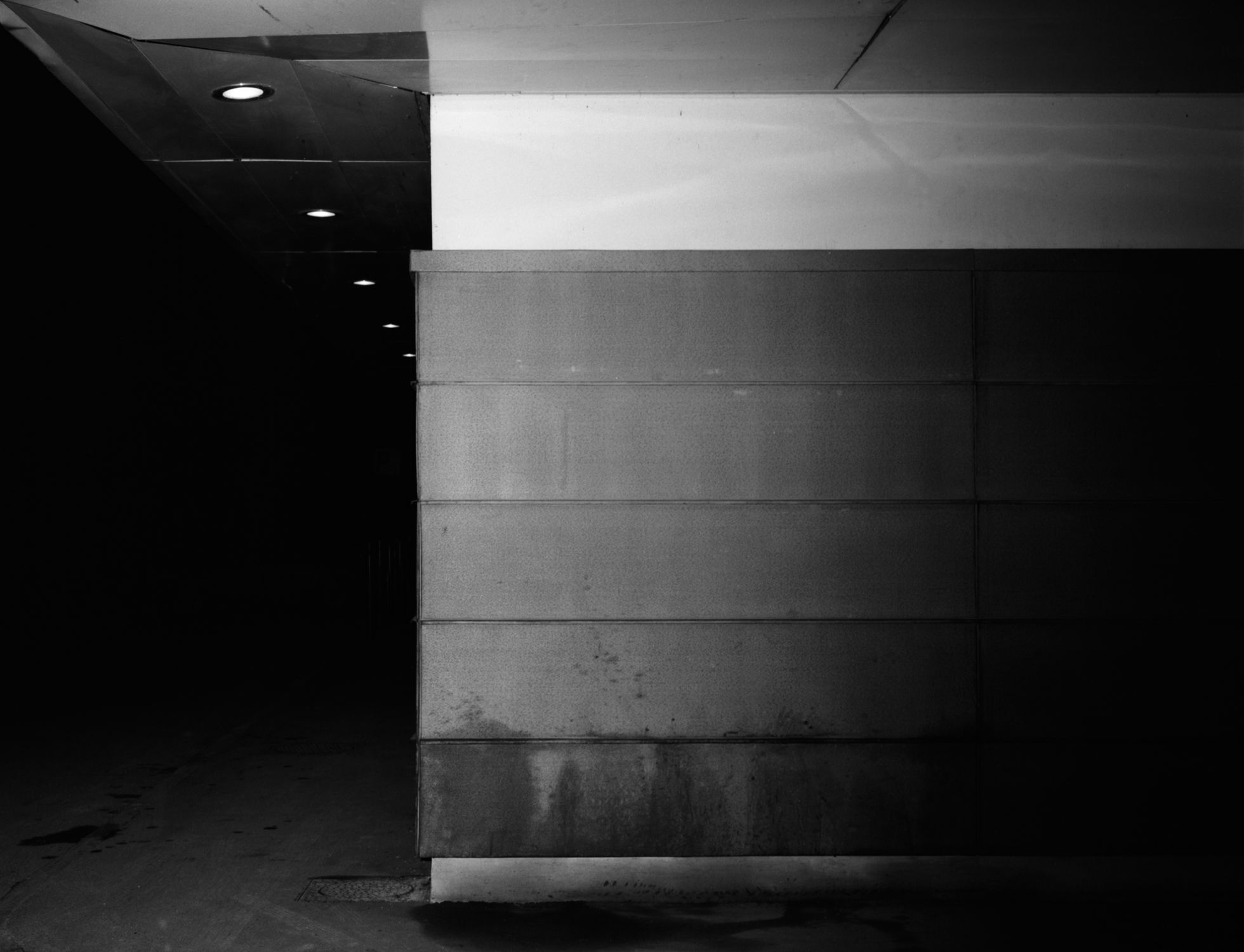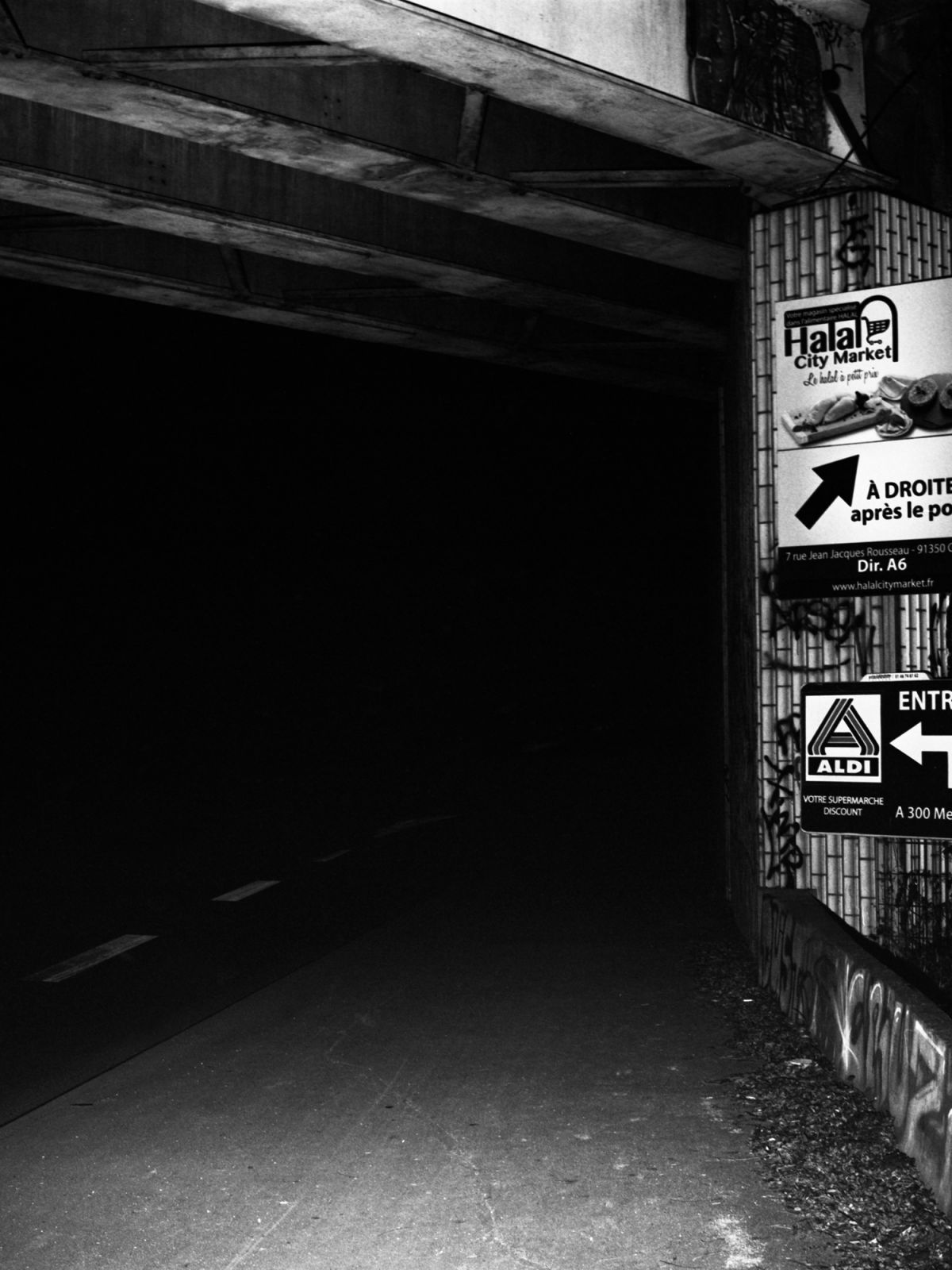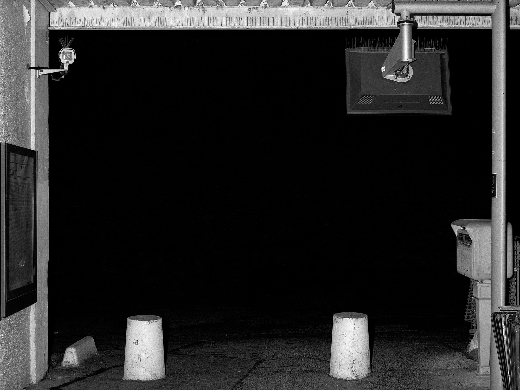 Le projet de Karim Kal suit la ligne D du RER, de Grigny à Corbeil. Les photographies, prises de nuit au flash à courte portée, sont à la fois inquiétantes et familières. Car, au-delà de l'étrangeté de l'image qui se présente, nous connaissons intimement ces formes et ces matériaux, ces passages, ces abris, ces raccourcis qui mènent plus vite à la sortie ou au prochain train. Dans le contraste cru du noir et blanc apparaît également la tension entre l'espace collectif et l'espace privé, entre la planification et l'utilisation, entre l'autorité et la transgression.